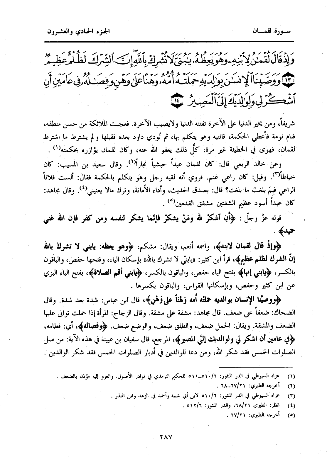 {وَإِذْ قَالَ لُقْمَانُ لِابْنِهِ} وَاسْمُهُ أَنْعَمُ، وَيُقَالُ: مِشْكَمٌ، {وَهُوَ يَعِظُهُ يَا بُنَيَّ لَا تُشْرِكْ بِاللَّهِ إِنَّ الشِّرْكَ لَظُلْمٌ عَظِيمٌ} قَرَأَ ابْنُ كَثِيرٍ: "يَا بُنَيْ لَا تُشْرِكُ بِاللَّهِ" بِإِسْكَانِ الْيَاءِ، وَفَتَحَهَا حَفْصٌ، وَالْبَاقُونَ بِالْكَسْرِ، "يَا بُنَيَّ إِنَّهَا" بِفَتْحِ الْيَاءِ حَفْصٌ، وَالْبَاقُونَ بِالْكَسْرِ، "يَا بُنَيَّ أَقِمِ الصَّلَاةَ"، بِفَتْحِ الْيَاءِ الْبَزِّيُّ عَنِ ابْنِ كَثِيرٍ وَحَفْصٍ، وَبِإِسْكَانِهَا الْقَوَّاسُ، وَالْبَاقُونَ بِكَسْرِهَا. {وَوَصَّيْنَا الْإِنْسَانَ بِوَالِدَيْهِ حَمَلَتْهُ أُمُّهُ وَهْنًا عَلَى وَهْنٍ} قَالَ ابْنُ عَبَّاسٍ: شِدَّةً بَعْدَ شِدَّةٍ. وَقَالَ الضَّحَّاكُ: ضَعْفًا عَلَى ضَعْفٍ. قَالَ مُجَاهِدٌ: مَشَقَّةً عَلَى مَشَقَّةٍ. وَقَالَ الزَّجَّاجُ: الْمَرْأَةُ إِذَا حَمَلَتْ تَوَالَى عَلَيْهَا الضَّعْفُ وَالْمَشَقَّةُ. وَيُقَالُ: الْحَمْلُ ضَعْفٌ، وَالطَّلْقُ ضَعْفٌ، وَالْوَضْعُ ضَعْفٌ. {وَفِصَالُهُ} أَيْ: فِطَامُهُ، {فِي عَامَيْنِ أَنِ اشْكُرْ لِي وَلِوَالِدَيْكَ إِلَيَّ الْمَصِيرُ} الْمَرْجِعُ، قَالَ سُفْيَانُ بْنُ عُيَيْنَةَ فِي هَذِهِ الْآيَةِ: مَنْ صَلَّى الصَّلَوَاتِ الْخَمْسَ فَقَدْ شَكَرَ اللَّهَ، وَمَنْ دَعَا لِلْوَالِدَيْنِ فِي أَدْبَارِ الصَّلَوَاتِ الْخَمْسِ فَقَدْ شَكَرَ الْوَالِدَيْنِ.