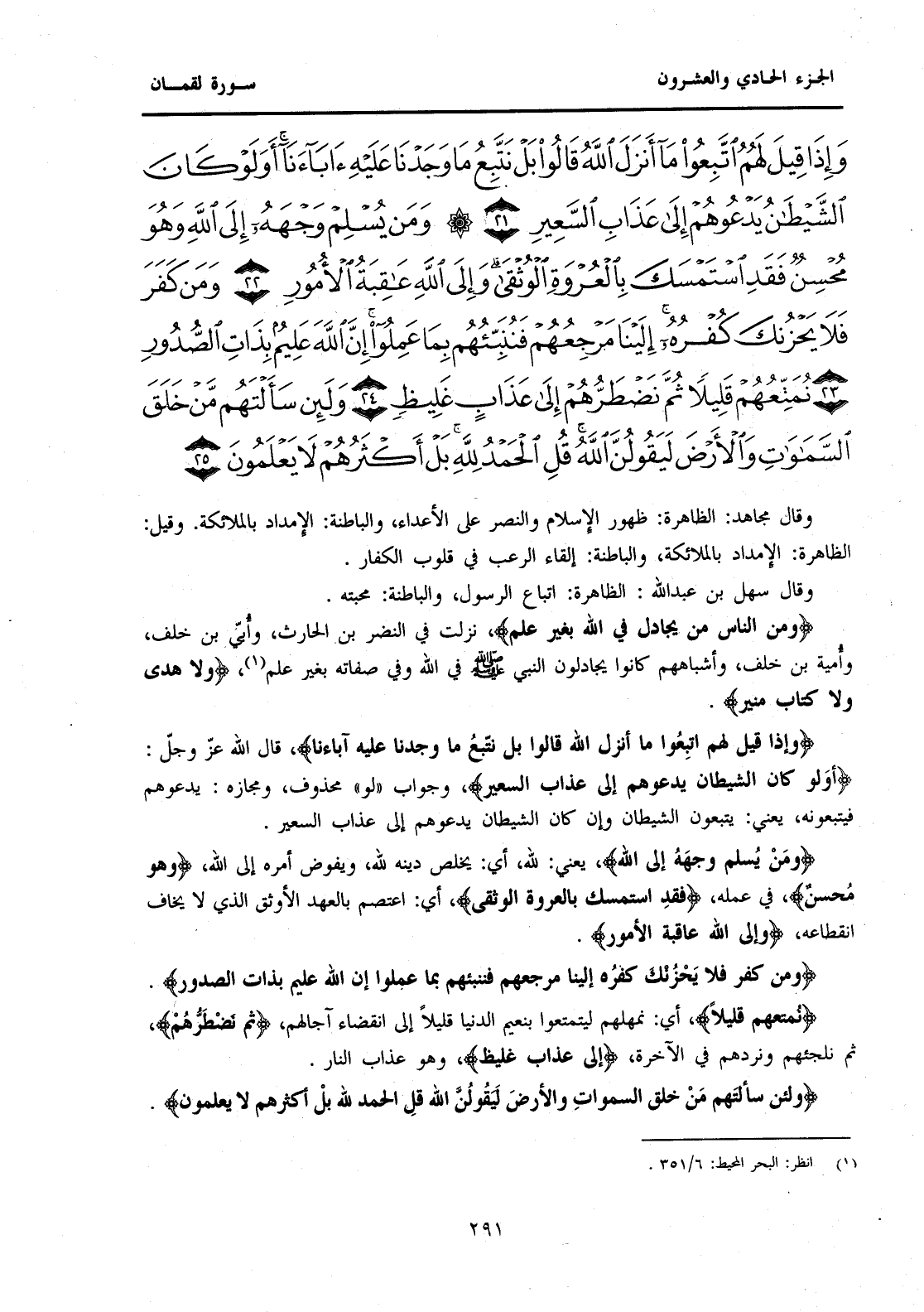 {وَإِذَا قِيلَ لَهُمُ اتَّبِعُوا مَا أَنْزَلَ اللَّهُ قَالُوا بَلْ نَتَّبِعُ مَا وَجَدْنَا عَلَيْهِ آبَاءَنَا} قَالَ اللَّهُ عَزَّ وَجَلَّ: {أَوَلَوْ كَانَ الشَّيْطَانُ يَدْعُوهُمْ إِلَى عَذَابِ السَّعِيرِ} وَجَوَابُ "لَوْ" مَحْذُوفٌ، وَمَجَازُهُ: يَدْعُوهُمْ فَيَتَّبِعُونَهُ، يَعْنِي: يَتَّبِعُونَ الشَّيْطَانَ وَإِنْ كَانَ الشَّيْطَانُ يَدْعُوهُمْ إِلَى عَذَابِ السَّعِيرِ. {وَمَنْ يُسْلِمْ وَجْهَهُ إِلَى اللَّهِ} يَعْنِي: لِلَّهِ، أَيْ: يُخْلِصْ دِينَهُ لِلَّهِ، وَيُفَوِّضْ أَمْرَهُ إِلَى اللَّهِ، {وَهُوَ مُحْسِنٌ} فِي عَمَلِهِ، {فَقَدِ اسْتَمْسَكَ بِالْعُرْوَةِ الْوُثْقَى} أَيْ: اعْتَصَمَ بِالْعَهْدِ الْأَوْثَقِ الَّذِي لَا يَخَافُ انْقِطَاعَهُ، {وَإِلَى اللَّهِ عَاقِبَةُ الْأُمُورِ} {وَمَنْ كَفَرَ فَلَا يَحْزُنْكَ كُفْرُهُ إِلَيْنَا مَرْجِعُهُمْ فَنُنَبِّئُهُمْ بِمَا عَمِلُوا إِنَّ اللَّهَ عَلِيمٌ بِذَاتِ الصُّدُورِ} {نُمَتِّعُهُمْ قَلِيلًا} أَيْ: نُمْهِلُهُمْ لِيَتَمَتَّعُوا بِنَعِيمِ الدُّنْيَا قَلِيلًا إِلَى انْقِضَاءِ آجَالِهِمْ، {ثُمَّ نَضْطَرُّهُمْ} ثُمَّ نُلْجِئُهُمْ وَنَرُدُّهُمْ فِي الْآخِرَةِ، {إِلَى عَذَابٍ غَلِيظٍ} عَذَابُ النَّارِ. {وَلَئِنْ سَأَلْتَهُمْ مَنْ خَلَقَ السَّمَوَاتِ وَالْأَرْضَ لَيَقُولُنَّ اللَّهُ قُلِ الْحَمْدُ لِلَّهِ بَلْ أَكْثَرُهُمْ لَا يَعْلَمُونَ}
