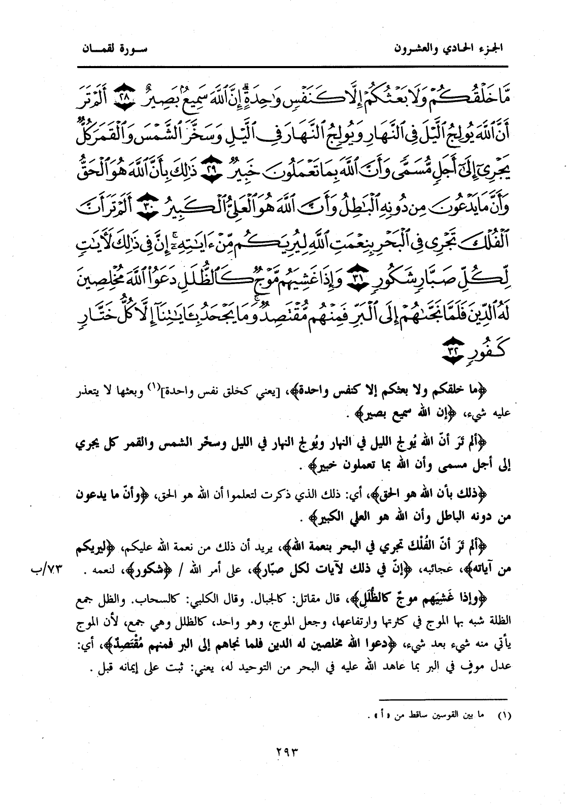 {مَا خَلْقُكُمْ وَلَا بَعْثُكُمْ إِلَّا كَنَفْسٍ وَاحِدَةٍ} [يَعْنِي كَخَلْقِ نَفْسٍ وَاحِدَةٍ] (1) وَبَعْثِهَا لَا يَتَعَذَّرُ عَلَيْهِ شَيْءٌ، {إِنَّ اللَّهَ سَمِيعٌ بَصِيرٌ} {ذَلِكَ بِأَنَّ اللَّهَ هُوَ الْحَقُّ} أَيْ: ذَلِكَ الَّذِي ذَكَرْتُ لِتَعْلَمُوا أَنَّ اللَّهَ هُوَ الْحَقُّ، {وَأَنَّ مَا يَدْعُونَ مِنْ دُونِهِ الْبَاطِلُ وَأَنَّ اللَّهَ هُوَ الْعَلِيُّ الْكَبِيرُ} {أَلَمْ تَرَ أَنَّ الْفُلْكَ تَجْرِي فِي الْبَحْرِ بِنِعْمَةِ اللَّهِ} يُرِيدُ أَنَّ ذَلِكَ مِنْ نِعْمَةِ اللَّهِ عَلَيْكُمْ، {لِيُرِيَكُمْ مِنْ آيَاتِهِ} عَجَائِبِهِ، {إِنَّ فِي ذَلِكَ لَآيَاتٍ لِكُلِّ صَبَّارٍ} عَلَى أمر الله 73/ب {شَكُورٍ} لِنِعَمِهِ. {وَإِذَا غَشِيَهُمْ مَوْجٌ كَالظُّلَلِ} قَالَ مُقَاتِلٌ: كَالْجِبَالِ. وَقَالَ الكلبي: كالسحاب. والظل جَمْعُ الظُّلَّةِ شَبَّهَ بِهَا الْمَوْجَ فِي كَثْرَتِهَا وَارْتِفَاعِهَا، وَجَعَلَ الْمَوْجَ، وَهُوَ وَاحِدٌ، كَالظُّلَلِ وَهِيَ جَمْعٌ، لِأَنَّ الْمَوْجَ يَأْتِي مِنْهُ شَيْءٌ بَعْدَ شَيْءٍ، {دَعَوُا اللَّهَ مُخْلِصِينَ لَهُ الدِّينَ فَلَمَّا نَجَّاهُمْ إِلَى الْبَرِّ فَمِنْهُمْ مُقْتَصِدٌ} أَيْ: عَدْلٌ مُوفٍ فِي الْبَرِّ بِمَا عَاهَدَ اللَّهَ عَلَيْهِ فِي الْبَحْرِ مِنَ التَّوْحِيدِ لَهُ، يَعْنِي: ثَبَتَ عَلَى إِيمَانِهِ.