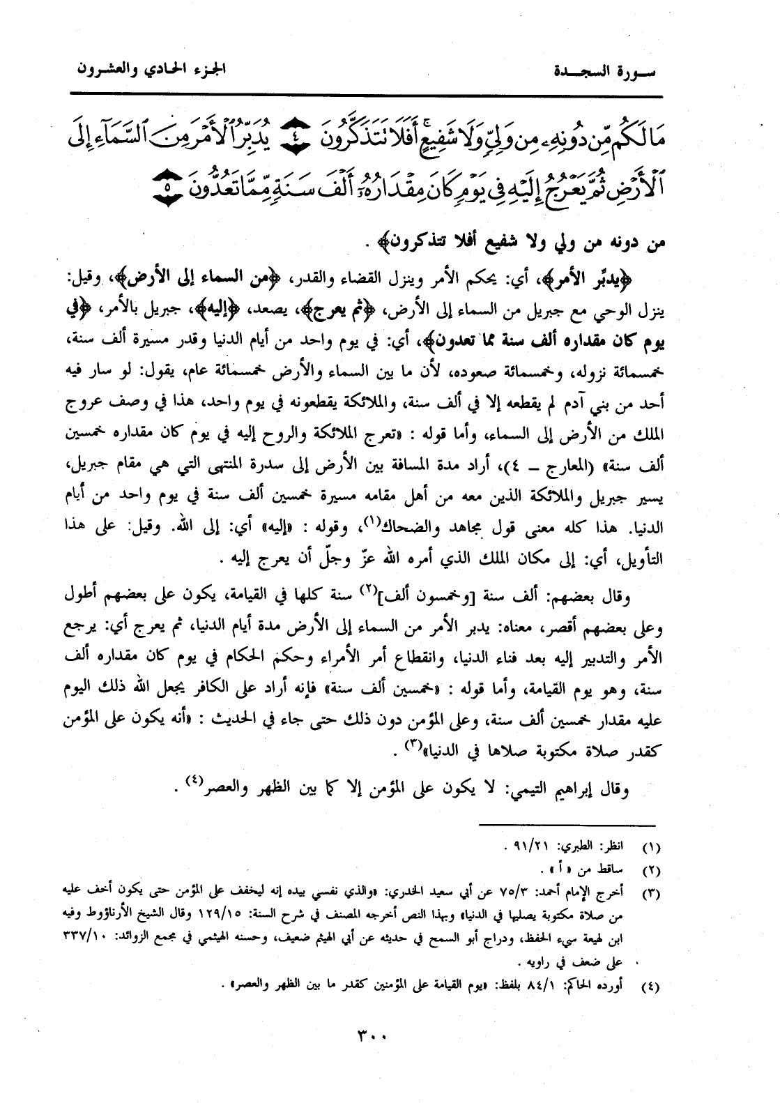 وَقَالَ بَعْضُهُمْ: أَلْفُ سَنَةٍ [وَخَمْسُونَ أَلْفَ] (2) سَنَةٍ كُلُّهَا فِي الْقِيَامَةِ، يَكُونُ عَلَى بَعْضِهِمْ أَطْوَلَ وَعَلَى بَعْضِهِمْ أَقْصَرَ، مَعْنَاهُ: يُدَبِّرُ الْأَمْرَ مِنَ السَّمَاءِ إِلَى الْأَرْضِ مُدَّةَ أَيَّامِ الدُّنْيَا، ثُمَّ يَعْرُجُ أَيْ: يَرْجِعُ الْأَمْرُ وَالتَّدْبِيرُ إِلَيْهِ بَعْدَ فَنَاءِ الدُّنْيَا، وَانْقِطَاعِ أَمْرِ الْأُمَرَاءِ وَحُكْمِ الْحُكَّامِ فِي يَوْمٍ كَانَ مِقْدَارُهُ أَلْفَ سَنَةٍ، وَهُوَ يَوْمُ الْقِيَامَةِ، وَأَمَّا قَوْلُهُ: "خَمْسِينَ أَلْفَ سَنَةٍ" فَإِنَّهُ أَرَادَ عَلَى الْكَافِرِ يَجْعَلُ اللَّهُ ذَلِكَ الْيَوْمَ عَلَيْهِ مِقْدَارَ خَمْسِينَ أَلْفَ سَنَةٍ، وَعَلَى الْمُؤْمِنِ دُونَ ذَلِكَ حَتَّى جَاءَ فِي الْحَدِيثِ: "أَنَّهُ يَكُونُ عَلَى الْمُؤْمِنِ كَقَدْرِ صَلَاةٍ مَكْتُوبَةٍ صَلَّاهَا فِي الدُّنْيَا" (3) . وَقَالَ إِبْرَاهِيمُ التَّيْمِيُّ: لَا يَكُونُ عَلَى الْمُؤْمِنِ إِلَّا كَمَا بَيْنَ الظُّهْرِ وَالْعَصْرِ (4) .