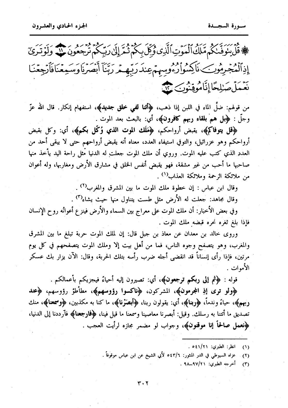 وَرَوَى خَالِدُ بْنُ مَعْدَانَ عَنْ مُعَاذِ بْنِ جَبَلٍ قَالَ: إِنَّ لِمَلَكِ الْمَوْتِ حَرْبَةً تَبْلُغُ مَا بَيْنَ الْمَشْرِقِ وَالْمَغْرِبِ، وَهُوَ يَتَصَفَّحُ وُجُوهَ النَّاسِ، فَمَا مِنْ أَهْلِ بَيْتٍ إِلَّا وَمَلَكُ الْمَوْتِ يَتَصَفَّحُهُمْ فِي كُلِّ يَوْمٍ مَرَّتَيْنِ، فَإِذَا رَأَى إِنْسَانًا قَدِ انْقَضَى أَجَلُهُ ضَرَبَ رَأَسَهُ بِتِلْكَ الْحَرْبَةِ، وَقَالَ: الْآنَ يُزَارُ بِكَ عَسْكَرُ الْأَمْوَاتِ. قَوْلُهُ: {ثُمَّ إِلَى رَبِّكُمْ تُرْجَعُونَ} أَيْ: تَصِيرُونَ إِلَيْهِ أَحْيَاءً فَيَجْزِيكُمْ بِأَعْمَالِكُمْ. {وَلَوْ تَرَى إِذِ الْمُجْرِمُونَ} الْمُشْرِكُونَ، {نَاكِسُو رُءُوسِهِمْ} مُطَأْطِؤُ رُءُوسِهِمْ، {عِنْدَ رَبِّهِمْ} حَيَاءً وَنَدَمًا، {رَبَّنَا} أَيْ: يَقُولُونَ رَبَّنَا، {أَبْصَرْنَا} مَا كُنَّا بِهِ مُكَذِّبِينَ، {وَسَمِعْنَا} مِنْكَ تَصْدِيقَ مَا أَتَتْنَا بِهِ رُسُلُكَ. وَقِيلَ: أَبْصَرْنَا مَعَاصِيَنَا وَسَمْعَنَا مَا قِيلَ فِينَا، {فَارْجِعْنَا} فَأَرْدُدْنَا إِلَى الدُّنْيَا، {نَعْمَلْ صَالِحًا إِنَّا مُوقِنُونَ} وَجَوَابُ لَوْ مُضْمَرٌ مَجَازُهُ لَرَأَيْتَ الْعَجَبَ.
