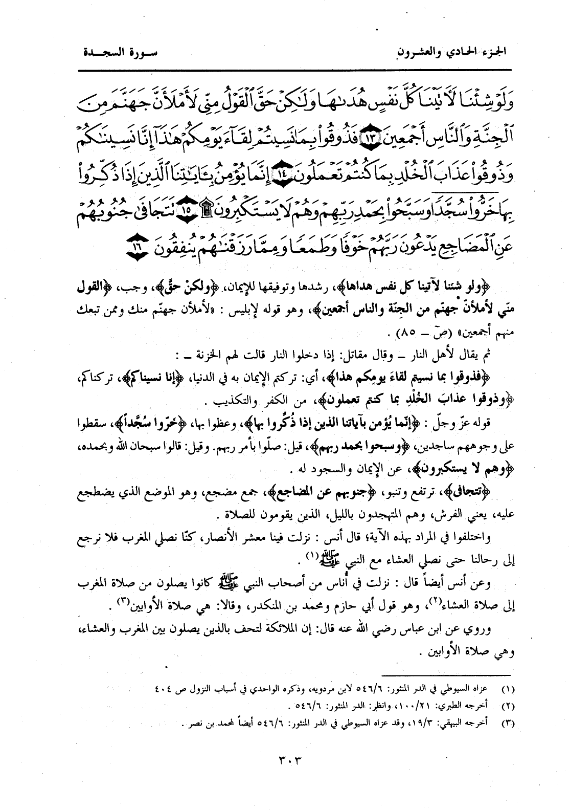 {وَلَوْ شِئْنَا لَآتَيْنَا كُلَّ نَفْسٍ هُدَاهَا} رُشْدَهَا وَتَوْفِيقَهَا لِلْإِيمَانِ، {وَلَكِنْ حَقَّ} وَجَبَ، {الْقَوْلُ مِنِّي لَأَمْلَأَنَّ جَهَنَّمَ مِنَ الْجِنَّةِ وَالنَّاسِ أَجْمَعِينَ} وَهُوَ قَوْلُهُ لِإِبْلِيسَ: "لَأَمْلَأَنَّ جهنم منك ومن تَبِعَكَ مِنْهُمْ أَجْمَعِينَ" (ص-85) . ثُمَّ يُقَالُ لِأَهْلِ النَّارِ -وَقَالَ مُقَاتِلٌ: إِذَا دَخَلُوا النَّارَ قَالَتْ لَهُمُ الْخَزَنَةُ-: {فَذُوقُوا بِمَا نَسِيتُمْ لِقَاءَ يَوْمِكُمْ هَذَا} أَيْ: تَرَكْتُمُ الْإِيمَانَ بِهِ فِي الدُّنْيَا، {إِنَّا نَسِينَاكُمْ} تَرَكْنَاكُمْ، {وَذُوقُوا عَذَابَ الْخُلْدِ بِمَا كُنْتُمْ تَعْمَلُونَ} مِنَ الْكُفْرِ وَالتَّكْذِيبِ. قَوْلُهُ عَزَّ وَجَلَّ: {إِنَّمَا يُؤْمِنُ بِآيَاتِنَا الَّذِينَ إِذَا ذُكِّرُوا بِهَا} وُعِظُوا بِهَا، {خَرُّوا سُجَّدًا} سَقَطُوا عَلَى وُجُوهِهِمْ سَاجِدِينَ، {وَسَبَّحُوا بِحَمْدِ رَبِّهِمْ} قِيلَ: صَلُّوا بِأَمْرِ رَبِّهِمْ. وَقِيلَ: قَالُوا سُبْحَانَ اللَّهِ وَبِحَمْدِهِ، {وَهُمْ لَا يَسْتَكْبِرُونَ} عَنِ الْإِيمَانِ وَالسُّجُودِ لَهُ. {تَتَجَافَى} تَرْتَفِعُ وَتَنْبُو، {جُنُوبُهُمْ عَنِ الْمَضَاجِعِ} جَمْعُ مَضْجَعٍ، وَهُوَ الْمَوْضِعُ الَّذِي يُضْطَجَعُ عَلَيْهِ، يَعْنِي الْفُرُشَ، وَهُمُ الْمُتَهَجِّدُونَ بِاللَّيْلِ، اللَّذَيْنِ يَقُومُونَ لِلصَّلَاةِ.