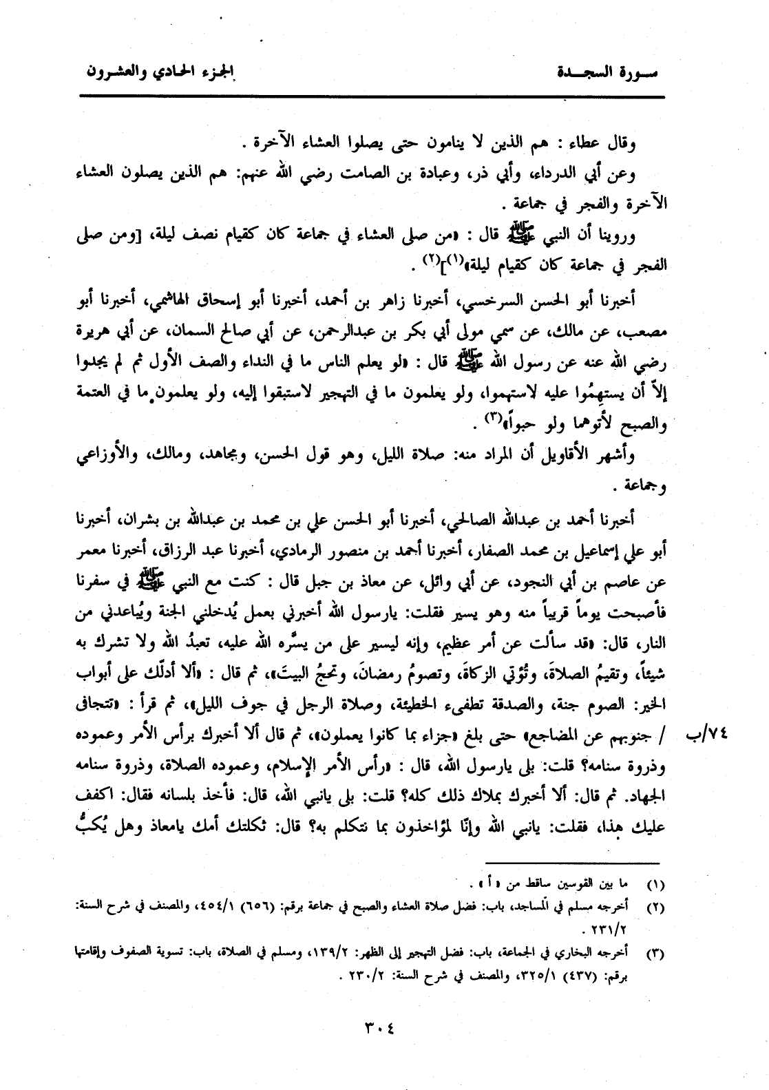 أَخْبَرَنَا أَحْمَدُ بْنُ عَبْدِ اللَّهِ الصَّالِحِيُّ، أَخْبَرَنَا أَبُو الْحَسَنِ عَلِيُّ بْنُ مُحَمَّدِ بْنِ عَبْدِ اللَّهِ بْنِ بِشْرَانَ، أَخْبَرَنَا أَبُو عَلِيٍّ إِسْمَاعِيلُ بْنُ مُحَمَّدٍ الصَّفَّارُ، أَخْبَرَنَا أَحْمَدُ بْنُ مَنْصُورٍ الرَّمَادِيُّ، أَخْبَرَنَا عَبْدُ الرَّازِقِ، أَخْبَرَنَا مَعْمَرٌ عَنْ عَاصِمِ بْنِ أَبِي النَّجُودِ، عَنْ أَبِي وَائِلٍ عَنْ مُعَاذِ بْنِ جَبَلٍ قَالَ: كُنْتُ مَعَ النَّبِيِّ صَلَّى اللَّهُ عَلَيْهِ وَسَلَّمَ فِي سَفَرِنَا فَأَصْبَحْتُ يَوْمًا قَرِيبًا مِنْهُ وَهُوَ يَسِيرُ فَقُلْتُ: يَا رَسُولَ اللَّهِ أَخْبِرْنِي بِعَمَلٍ يُدْخِلُنِي الْجَنَّةَ وَيُبَاعِدُنِي مِنَ النَّارِ، قَالَ: "قَدْ سَأَلْتَ عَنْ أَمْرٍ عَظِيمٍ، وَإِنَّهُ لِيَسِيرٌ عَلَى مَنْ يَسَّرَهُ اللَّهُ عَلَيْهِ، تَعْبُدُ اللَّهَ وَلَا تُشْرِكُ بِهِ شَيْئًا وَتُقِيمُ الصَّلَاةَ، وَتُؤْتِي الزَّكَاةَ، وَتَصُومُ رَمَضَانَ، وَتَحْجُّ الْبَيْتَ"، ثُمَّ قَالَ: "أَلَا أَدُلُّكَ عَلَى أَبْوَابِ الْخَيْرِ: الصَّوْمُ جُنَّةٌ، وَالصَّدَقَةُ تُطْفِىءُ الْخَطِيئَةَ، وَصَلَاةُ الرَّجُلِ فِي جَوْفِ اللَّيْلِ"، ثُمَّ قرأ: "تتجافى 74/ب جُنُوبُهُمْ عَنِ الْمَضَاجِعِ" حَتَّى بَلَغَ "جَزَاءً بما كانوا يعلمون"، ثُمَّ قَالَ أَلَا أُخْبِرُكَ بِرَأْسِ الْأَمْرِ وَعَمُودِهِ وَذُرْوَةِ سَنَامِهِ؟ قُلْتُ: بَلَى يَا رَسُولَ اللَّهِ، قَالَ: "رَأْسُ الْأَمْرِ الْإِسْلَامُ، وَعَمُودُهُ الصَّلَاةُ، وَذُرْوَةُ سَنَامِهِ الْجِهَادُ. ثُمَّ قَالَ: أَلَا أُخْبِرُكَ بِمِلَاكِ ذَلِكَ كُلِّهِ؟ قُلْتُ: بَلَى يَا نَبِيَّ اللَّهِ، قَالَ: فَأَخَذَ بِلِسَانِهِ فَقَالَ: اكْفُفْ عَلَيْكَ هَذَا، فَقُلْتُ: يَا نَبِيَّ اللَّهِ وَإِنَّا لمؤاخذون بما تتكلم بِهِ؟ قَالَ: ثَكِلَتْكَ أُمُّكَ يَا مُعَاذُ وَهَلْ يَكُبُّ