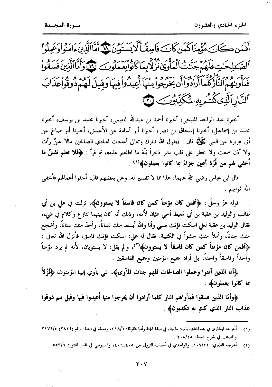 قَوْلُهُ عَزَّ وَجَلَّ: {أَفَمَنْ كَانَ مُؤْمِنًا كَمَنْ كَانَ فَاسِقًا لَا يَسْتَوُونَ} نَزَلَتْ فِي عَلِيِّ بْنِ أَبِي طَالِبٍ وَالْوَلِيدِ بْنِ عُقْبَةَ بْنِ أَبِي مُعَيْطٍ أَخِي عُثْمَانَ لِأُمِّهِ، وَذَلِكَ أَنَّهُ كَانَ بَيْنَهُمَا تَنَازُعٌ وَكَلَامٌ فِي شَيْءٍ، فَقَالَ الْوَلِيدُ بْنُ عُقْبَةَ لَعَلِيٍّ اسْكُتْ فَإِنَّكَ صَبِيٌّ وَأَنَا وَاللَّهُ أَبْسَطُ مِنْكَ لِسَانًا، وَأَحَدُّ مِنْكَ سِنَانًا، وَأَشْجَعُ مِنْكَ جَنَانًا، وَأَمْلَأُ مِنْكَ حَشْوًا فِي الْكَتِيبَةِ. فَقَالَ لَهُ عَلِيُّ: اسْكُتْ فَإِنَّكَ فَاسِقٌ، فَأَنْزَلَ اللَّهُ تَعَالَى: {أَفَمَنْ كَانَ مُؤْمِنًا كَمَنْ كَانَ فَاسِقًا لَا يَسْتَوُونَ} (1) وَلَمْ يَقُلْ: لَا يَسْتَوِيَانِ، لِأَنَّهُ لَمْ يُرِدْ مُؤْمِنًا وَاحِدًا وَفَاسِقًا وَاحِدًا، بَلْ أَرَادَ جَمِيعَ الْمُؤْمِنِينَ وَجَمِيعَ الْفَاسِقِينَ. {أَمَّا الَّذِينَ آمَنُوا وَعَمِلُوا الصَّالِحَاتِ فَلَهُمْ جَنَّاتُ الْمَأْوَى} الَّتِي يَأْوِي إِلَيْهَا الْمُؤْمِنُونَ، {نُزُلًا بِمَا كَانُوا يَعْمَلُونَ} {وَأَمَّا الَّذِينَ فَسَقُوا فَمَأْوَاهُمُ النَّارُ كُلَّمَا أَرَادُوا أَنْ يَخْرُجُوا مِنْهَا أُعِيدُوا فِيهَا وَقِيلَ لَهُمْ ذُوقُوا عَذَابَ النَّارِ الَّذِي كُنْتُمْ بِهِ تُكَذِّبُونَ}