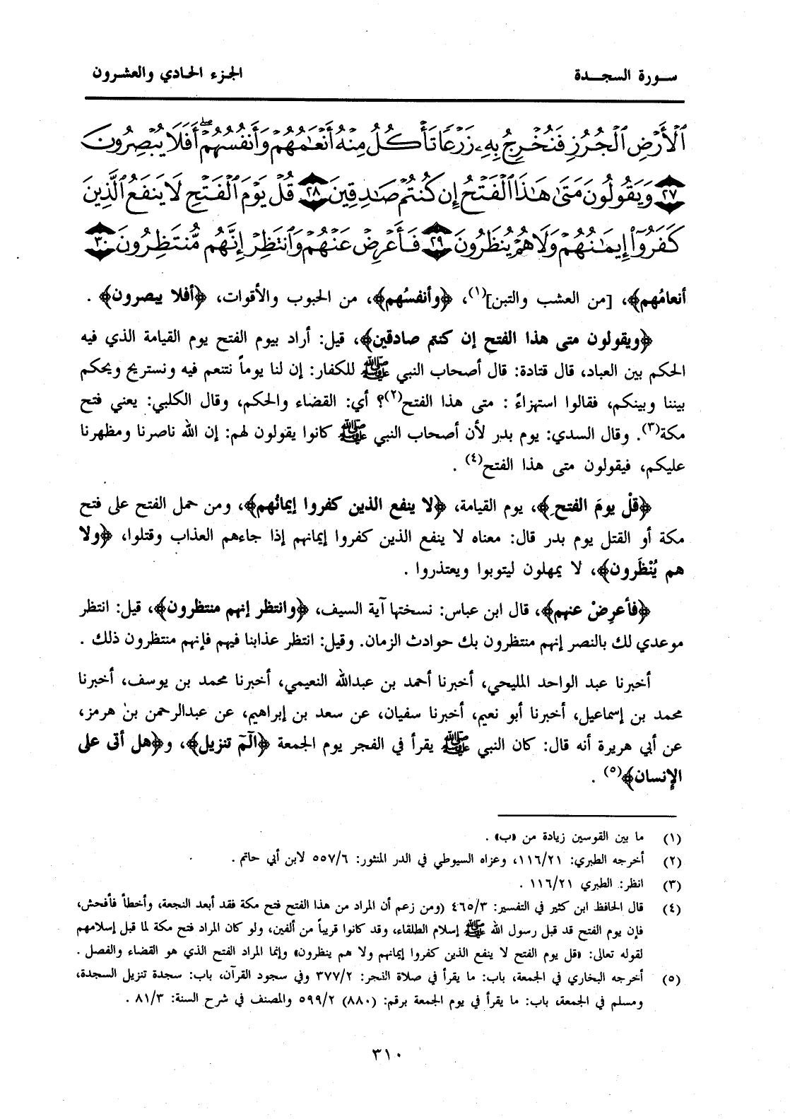 {وَيَقُولُونَ مَتَى هَذَا الْفَتْحُ إِنْ كُنْتُمْ صَادِقِينَ} قِيلَ: أَرَادَ بِيَوْمِ الْفَتْحِ يَوْمَ الْقِيَامَةِ الَّذِي فِيهِ الْحُكْمُ بَيْنَ الْعِبَادِ، قَالَ قَتَادَةُ: قَالَ أَصْحَابُ النَّبِيِّ صَلَّى اللَّهُ عَلَيْهِ وَسَلَّمَ لِلْكُفَّارِ: إِنْ لَنَا يَوْمًا نَتَنَعَّمُ فِيهِ وَنَسْتَرِيحُ وَيُحْكَمُ بَيْنَنَا وَبَيْنَكُمْ، فَقَالُوا اسْتِهْزَاءً: مَتَى هَذَا الْفَتْحُ (2) ؟ أَيْ: الْقَضَاءُ وَالْحُكْمُ، وَقَالَ الْكَلْبِيُّ: يَعْنِي فَتْحَ مَكَّةَ (3) .وَقَالَ السُّدِّيُّ: يَوْمَ بَدْرٍ لِأَنَّ أَصْحَابَ النَّبِيِّ صَلَّى اللَّهُ عَلَيْهِ وَسَلَّمَ يَقُولُونَ لَهُمْ: إِنَّ اللَّهَ نَاصِرُنَا وَمُظْهِرُنَا عَلَيْكُمْ، فَيَقُولُونَ مَتَى هَذَا الْفَتْحُ (4) . {قُلْ يَوْمَ الْفَتْحِ} يَوْمَ الْقِيَامَةِ، {لَا يَنْفَعُ الَّذِينَ كَفَرُوا إِيمَانُهُمْ} وَمَنْ حَمَلَ الْفَتْحَ عَلَى فَتْحِ مَكَّةَ أَوِ الْقَتْلِ يَوْمَ بَدْرٍ قَالَ: مَعْنَاهُ لَا يَنْفَعُ الَّذِينَ كَفَرُوا إِيمَانُهُمْ إِذَا جَاءَهُمُ الْعَذَابُ وَقُتِلُوا، {وَلَا هُمْ يُنْظَرُونَ} لَا يُمْهَلُونَ لِيَتُوبُوا وَيَعْتَذِرُوا. {فَأَعْرِضْ عَنْهُمْ} قَالَ ابْنُ عَبَّاسٍ: نَسَخَتْهَا آيَةُ السَّيْفِ، {وَانْتَظِرْ إِنَّهُمْ مُنْتَظِرُونَ} قِيلَ: انْتَظِرْ مَوْعِدِي لَكَ بِالنَّصْرِ إِنَّهُمْ مُنْتَظِرُونَ بِكَ حَوَادِثَ الزَّمَانِ. وَقِيلَ: انْتَظِرْ عَذَابَنَا فِيهِمْ فَإِنَّهُمْ مُنْتَظِرُونَ ذَلِكَ.