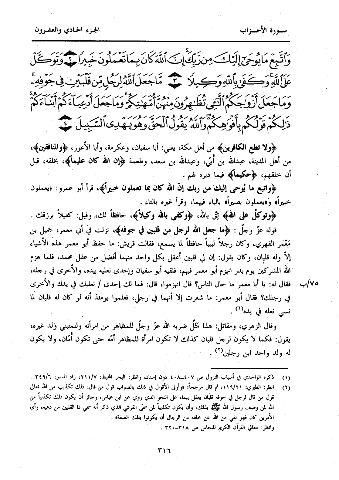 (2) انظر: الطبري: 21 / 119، ثم قال مرجحا: "وأولى الأقوال في ذلك بالصواب قوله من قال: ذلك تكذيب من الله تعالى قوله من قال لرجل في جوفه قلبان يعقل بهما، على النحو الذي روي عن ابن عباس، وجائز أن يكون ذلك تكذيبا من الله لمن وصف رسول الله صَلَّى اللَّهُ عَلَيْهِ وَسَلَّمَ بذلك، وان يكون تكذيبا لمن سمى القرشي الذي ذكر أنه سمى ذا القلبين من دهيه، وأي الأمرين كان فهو نفي من الله عن خلقه من الرجال أن يكونوا بتلك الصفة". وانظر: معاني القرآن الكريم للنحاس ص 318-320.