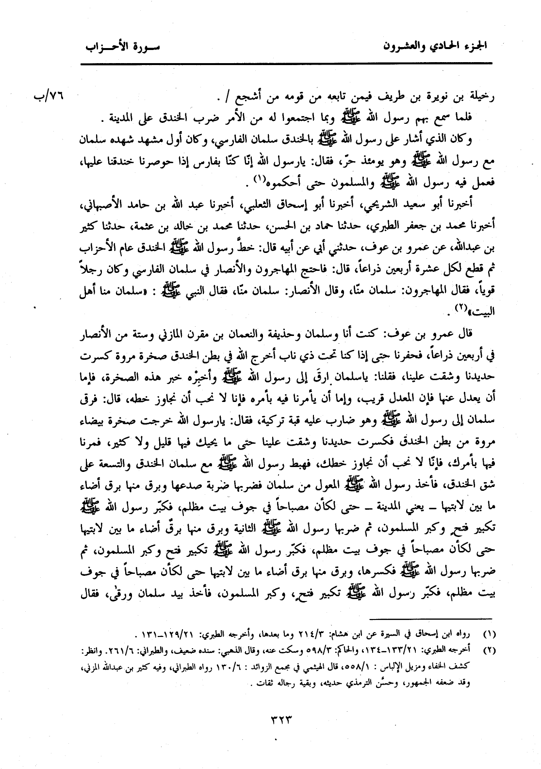 أَخْبَرَنَا أَبُو سَعِيدٍ الشُّرَيْحِيُّ، أَخْبَرَنَا أَبُو إِسْحَاقَ الثَّعْلَبِيُّ، أَخْبَرَنَا عَبْدُ اللَّهِ بْنُ حَامِدٍ الْأَصْبَهَانِيُّ، أَخْبَرَنَا مُحَمَّدُ بْنُ جَعْفَرٍ الطَّبَرِيُّ، حَدَّثَنَا حَمَّادُ بْنُ الْحَسَنِ، حَدَّثَنَا مُحَمَّدُ بْنُ خَالِدِ بْنِ عَثْمَةَ، حَدَّثَنَا كَثِيرُ بْنُ عَبْدِ اللَّهِ، عَنْ عَمْرِو بْنِ عَوْفٍ، حَدَّثَنِي أَبِي عَنْ أَبِيهِ قَالَ: خَطَّ رَسُولُ اللَّهِ صَلَّى اللَّهُ عَلَيْهِ وَسَلَّمَ الْخَنْدَقَ عَامَ الْأَحْزَابِ ثُمَّ قَطَعَ لِكُلِّ عَشَرَةٍ أَرْبَعِينَ ذِرَاعًا، قَالَ: فَاحْتَجَّ الْمُهَاجِرُونَ وَالْأَنْصَارُ فِي سَلْمَانَ الْفَارِسِيِّ وَكَانَ رَجُلًا قَوِيًّا، فَقَالَ الْمُهَاجِرُونَ: سَلْمَانُ مِنَّا، وَقَالَ الْأَنْصَارُ: سَلْمَانُ مِنَّا، فَقَالَ النَّبِيُّ صَلَّى اللَّهُ عَلَيْهِ وَسَلَّمَ: "سَلْمَانُ مِنَّا أَهْلَ الْبَيْتِ" (2) .