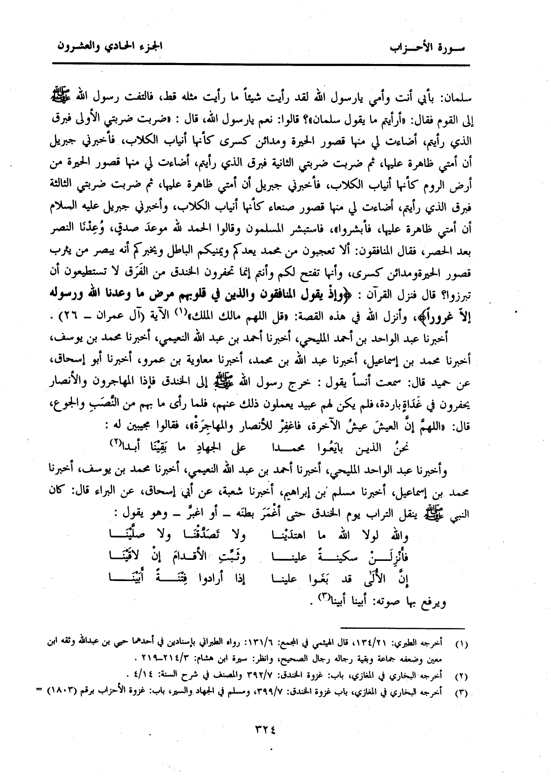 سَلْمَانُ: بِأَبِي أَنْتَ وَأُمِّي يَا رَسُولَ اللَّهِ لَقَدْ رَأَيْتُ شَيْئًا مَا رَأَيْتُ مِثْلَهُ قَطُّ، فَالْتَفَتَ رَسُولُ اللَّهِ صَلَّى اللَّهُ عَلَيْهِ وَسَلَّمَ إِلَى الْقَوْمِ فَقَالَ: "أَرَأَيْتُمْ مَا يَقُولُ سَلْمَانُ"؟ قَالُوا: نَعَمْ يَا رَسُولَ اللَّهِ قَالَ: "ضَرَبْتُ ضَرْبَتِي الْأُولَى فَبَرَقَ الَّذِي رَأَيْتُمْ، أَضَاءَتْ لِي مِنْهَا قُصُورَ الْحَيْرَةِ وَمَدَائِنَ كِسْرَى كَأَنَّهَا أَنْيَابُ الْكِلَابِ، فَأَخْبَرَنِي جِبْرِيلُ أَنَّ أُمَّتِي ظَاهِرَةٌ عَلَيْهَا، ثُمَّ ضَرَبْتُ ضَرْبَتِي الثَّانِيَةَ فَبَرَقَ الَّذِي رَأَيْتُمْ، أَضَاءَتْ لِي مِنْهَا قُصُورَ الْحَيْرَةِ مِنْ أَرْضِ الرُّومِ كَأَنَّهَا أَنْيَابُ الْكِلَابِ، فَأَخْبَرَنِي جِبْرِيلُ أَنَّ أُمَّتِي ظَاهِرَةٌ عَلَيْهَا، ثُمَّ ضَرَبْتُ ضَرْبَتِي الثَّالِثَةَ فَبَرَقَ الَّذِي رَأَيْتُمْ، أَضَاءَتْ لِي مِنْهَا قُصُورَ صَنْعَاءَ كَأَنَّهَا أَنْيَابُ الْكِلَابِ، وَأَخْبَرَنِي جِبْرِيلُ عَلَيْهِ السَّلَامُ أَنَّ أُمَّتِي ظَاهِرَةٌ عَلَيْهَا، فَأَبْشِرُوا"، فَاسْتَبْشَرَ الْمُسْلِمُونَ وَقَالُوا الْحَمْدُ لِلَّهِ مُوْعِدَ صِدْقٍ، وَعَدَنَا النَّصْرَ بَعْدَ الْحَصْرِ، فَقَالَ الْمُنَافِقُونَ: أَلَا تَعْجَبُونَ مِنْ مُحَمَّدٍ يَعِدُكُمْ وَيُمَنِّيكُمُ الْبَاطِلَ وَيُخْبِرُكُمْ أَنَّهُ يُبْصِرُ مِنْ يَثْرِبَ قُصُورَ الْحِيْرَةِ وَمَدَائِنَ كِسْرَى، وَأَنَّهَا تُفْتَحُ لَكُمْ وَأَنْتُمْ إِنَّمَا تَحْفُرُونَ الْخَنْدَقَ مِنَ الْفَرَقِ لَا تَسْتَطِيعُونَ أَنْ تَبَرَّزُوا؟ قَالَ فَنَزَلَ الْقُرْآنُ: {وَإِذْ يَقُولُ الْمُنَافِقُونَ وَالَّذِينَ فِي قُلُوبِهِمْ مَرَضٌ مَا وَعَدَنَا اللَّهُ وَرَسُولُهُ إِلَّا غُرُورًا} وَأَنْزَلَ اللَّهُ هَذِهِ الْقِصَّةَ: "قُلِ اللَّهُمَّ مَالِكَ الْمُلْكِ" (1) الْآيَةَ (آلِ عِمْرَانَ-26) .