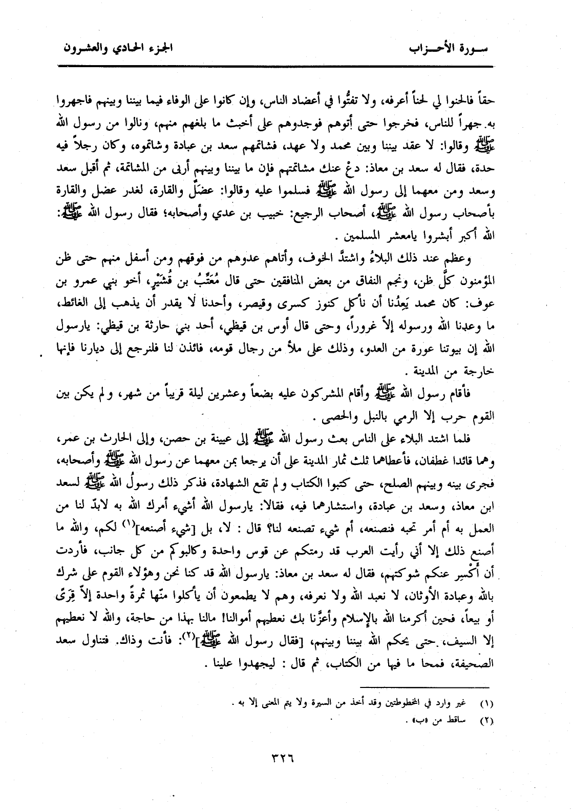 فَلَمَّا اشْتَدَّ الْبَلَاءُ عَلَى النَّاسِ بَعَثَ رَسُولُ اللَّهِ صَلَّى اللَّهُ عَلَيْهِ وَسَلَّمَ إِلَى عُيَيْنَةَ بْنِ حَفْصٍ، وَإِلَى الْحَارِثِ بْنِ عُمَرَ، وَهُمَا قَائِدَا غَطَفَانَ، فَأَعْطَاهُمَا ثُلُثَ ثِمَارِ الْمَدِينَةِ عَلَى أَنْ يَرْجِعَا بِمَنْ مَعَهُمَا عَنْ رَسُولِ اللَّهِ صَلَّى اللَّهُ عَلَيْهِ وَسَلَّمَ وَأَصْحَابِهِ، فَجَرَى بَيْنَهُ وَبَيْنَهُمُ الصُّلْحُ، حَتَّى كَتَبُوا الْكِتَابَ وَلَمْ تَقَعِ الشَّهَادَةُ، فَذَكَرَ ذَلِكَ رَسُولُ اللَّهِ صَلَّى اللَّهُ عَلَيْهِ وَسَلَّمَ لِسَعْدِ بْنِ مُعَاذٍ، وَسَعْدِ بْنِ عُبَادَةَ، وَاسْتَشَارَهُمَا فِيهِ، فَقَالَا يَا رَسُولَ اللَّهِ أَشِيءٌ أَمَرَكَ اللَّهُ بِهِ لَا بُدَّ لَنَا مِنَ الْعَمَلِ بِهِ أَمْ أَمْرٌ تُحِبُّهُ فَتَصْنَعُهُ، أَمْ شَيْءٌ تَصْنَعُهُ لَنَا؟ قَالَ: لَا بَلْ [شَيْءٌ أَصْنَعُهُ] (1) لَكُمْ، وَاللَّهِ مَا أَصْنَعُ ذَلِكَ إِلَّا أَنِّي رَأَيْتُ الْعَرَبَ قَدْ رَمَتْكُمْ عَنْ قَوْسٍ وَاحِدَةٍ وَكَالَبُوكُمْ مِنْ كل جانب، فأدرت أَنْ أَكْسِرَ عَنْكُمْ شَوْكَتَهُمْ، فَقَالَ لَهُ سَعْدُ بْنُ مُعَاذٍ: يَا رَسُولَ اللَّهِ قَدْ كُنَّا نَحْنُ وَهَؤُلَاءِ الْقَوْمُ عَلَى شِرْكٍ بِاللَّهِ وَعِبَادَةِ الْأَوْثَانِ، لَا نَعْبُدُ اللَّهَ وَلَا نَعْرِفُهُ، وَهُمْ لَا يَطْمَعُونَ أَنْ يَأْكُلُوا مِنْهَا ثَمَرَةً وَاحِدَةً إِلَّا قِرًى أَوْ بَيْعًا، فَحِينَ أَكْرَمَنَا اللَّهُ بِالْإِسْلَامِ، وَأَعَزَّنَا بِكَ نُعْطِيهِمْ أَمْوَالَنَا! مَالَنَا بِهَذَا مِنْ حَاجَةٍ، وَاللَّهِ لَا نُعْطِيهِمْ إِلَّا السَّيْفَ، حَتَّى يَحْكُمَ اللَّهُ بَيْنَنَا وَبَيْنَهُمْ، [فَقَالَ رَسُولُ اللَّهِ صَلَّى اللَّهُ عَلَيْهِ وَسَلَّمَ] (2) فَأَنْتَ وَذَاكَ. فَتَنَاوَلَ سَعْدٌ الصَّحِيفَةَ، فَمَحَا مَا فِيهَا مِنَ الْكِتَابَةِ، ثُمَّ قَالَ: لِيُجْهِدُوا عَلَيْنَا.