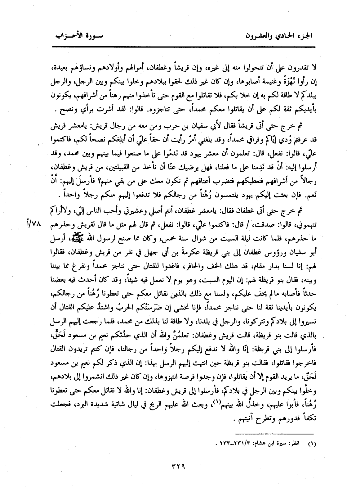 ثُمَّ خَرَجَ حَتَّى أَتَى غَطَفَانَ فَقَالَ: يَا مَعْشَرَ غَطَفَانَ، أَنْتُمْ أَصْلِي وَعَشِيرَتِي وَأَحَبُّ النَّاسِ إِلَيَّ، وَلَا أَرَاكُمْ تَتَّهِمُونِي، قالوا: صدقت، 78/أقَالَ: فَاكْتُمُوا عَلَيَّ، قَالُوا: نَفْعَلُ، ثُمَّ قَالَ لَهُمْ مِثْلَ مَا قَالَ لِقُرَيْشٍ وَحَذَّرَهُمْ مَا حَذَّرَهُمْ، فَلَمَّا كَانَتْ لَيْلَةُ السَّبْتِ مِنْ شَوَّالٍ سَنَةَ خَمْسٍ، وَكَانَ مِمَّا صَنَعَ لِرَسُولِ اللَّهِ صَلَّى اللَّهُ عَلَيْهِ وَسَلَّمَ، أَرْسَلَ أَبُو سُفْيَانَ وَرُءُوسُ غَطَفَانَ إِلَى بَنِي قُرَيْظَةَ عِكْرِمَةَ بْنَ أَبِي جَهْلٍ فِي نَفَرٍ مِنْ قُرَيْشٍ وَغَطَفَانَ، فَقَالُوا لَهُمْ: إِنَّا لَسْنَا بِدَارِ مُقَامٍ، قَدْ هَلَكَ الْخُفُّ وَالْحَافِرُ، فَاغْدُوَا لِلْقِتَالِ حَتَّى نُنَاجِزَ مُحَمَّدًا وَنَفْرُغَ مِمَّا بَيْنَنَا وَبَيْنَهُ، فَقَالَ بَنُو قُرَيْظَةَ لَهُمْ: إِنَّ الْيَوْمَ السَّبْتَ، وَهُوَ يَوْمٌ لَا نَعْمَلُ فِيهِ شَيْئًا، وَقَدْ كَانَ أَحْدَثَ فِيهِ بَعْضُنَا حَدَثًا فَأَصَابَهُ مَا لَمْ يَخْفَ عَلَيْكُمْ، وَلَسْنَا مَعَ ذَلِكَ بِالَّذِينِ نُقَاتِلُ مَعَكُمْ حَتَّى تُعْطُونَا رَهْنًا مِنْ رِجَالِكُمْ، يَكُونُونَ بِأَيْدِينَا ثِقَةً لَنَا حَتَّى نُنَاجِزَ مُحَمَّدًا، فَإِنَّا نَخْشَى إِنْ ضَرَسَتْكُمُ الْحَرْبُ وَاشْتَدَّ عَلَيْكُمُ الْقِتَالُ أَنْ تَسِيرُوا إِلَى بِلَادِكُمْ وَتَتْرُكُونَا، وَالرَّجُلَ فِي بَلَدِنَا، وَلَا طَاقَةَ لَنَا بِذَلِكَ مِنْ مُحَمَّدٍ، فَلَمَّا رَجَعَتْ إِلَيْهِمُ الرُّسُلُ بِالَّذِي قَالَتْ بَنُو قُرَيْظَةَ، قَالَتْ قُرَيْشٌ وَغَطَفَانُ: تَعْلَمُنَّ وَاللَّهِ أَنَّ الَّذِي حَدَّثَكُمْ نُعَيْمُ بْنُ مَسْعُودٍ لَحَقُّ، فَأَرْسَلُوا إِلَى بَنِي قُرَيْظَةَ: إِنَّا وَاللَّهِ لَا نَدْفَعُ إِلَيْكُمْ رَجُلًا وَاحِدًا مِنْ رِجَالِنَا، فَإِنْ كُنْتُمْ تُرِيدُونَ الْقِتَالَ فَاخْرُجُوا فَقَاتِلُوا، فَقَالَتْ بَنُو قُرَيْظَةَ حِينَ انْتَهَتْ إِلَيْهِمُ الرُّسُلُ بِهَذَا: إِنَّ الَّذِي ذَكَرَ لَكُمْ نُعَيْمُ بْنُ مَسْعُودٍ لَحَقُّ، مَا يُرِيدُ الْقَوْمُ إِلَّا أَنْ يُقَاتِلُوا، فَإِنْ وَجَدُوا فُرْصَةً انْتَهَزُوهَا، وَإِنْ كَانَ غَيْرُ ذَلِكَ انْشَمَرُوا إِلَى بِلَادِهِمْ، وَخَلُّوا بَيْنَكُمْ وَبَيْنَ الرَّجُلِ فِي بِلَادِكُمْ، فَأَرْسَلُوا إِلَى قُرَيْشٍ وَغَطَفَانَ: إِنَّا وَاللَّهِ لَا نُقَاتِلُ مَعَكُمْ حَتَّى تُعْطُونَا رَهْنًا، فَأَبَوْا عَلَيْهِمْ، وَخَذَّلَ اللَّهُ بَيْنَهُمْ (1) وَبَعَثَ اللَّهُ عَلَيْهِمُ الرِّيحَ فِي لَيَالٍ شَاتِيَةٍ شَدِيدَةِ الْبَرْدِ، فَجَعَلَتْ تَكْفَأُ قُدُورَهُمْ وَتَطْرَحُ آنِيَتَهُمْ.
