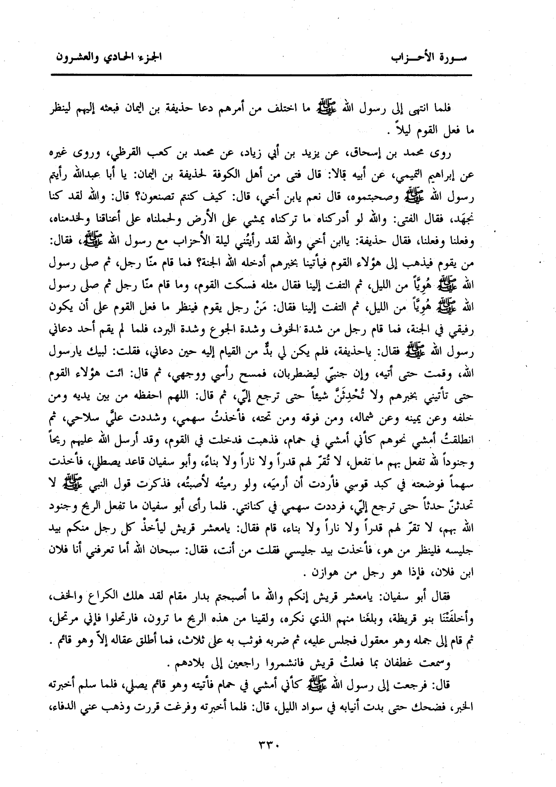 رَوَى مُحَمَّدُ بْنُ إِسْحَاقَ، عَنْ يَزِيدَ بْنِ أَبِي زِيَادٍ، عَنْ مُحَمَّدِ بْنِ كَعْبٍ الْقُرَظِيِّ، وَرَوَى غَيْرُهُ عَنْ إِبْرَاهِيمَ التَّمِيمِيِّ، عَنْ أَبِيهِ قَالَا قَالَ فَتًى مِنْ أَهْلِ الْكُوفَةِ لِحُذَيْفَةَ بْنِ الْيَمَانِ: يَا أَبَا عَبْدِ اللَّهِ رَأَيْتُمْ رَسُولَ اللَّهِ صَلَّى اللَّهُ عَلَيْهِ وَسَلَّمَ وَصَحِبْتُمُوهُ، قال نعم يا ابن أَخِي، قَالَ: كَيْفَ كُنْتُمْ تَصْنَعُونَ؟ قَالَ: وَاللَّهِ لَقَدْ كُنَّا نُجْهَدُ، فَقَالَ الْفَتَى: وَاللَّهُ لَوْ أَدْرَكْنَاهُ مَا تَرَكْنَاهُ يَمْشِي عَلَى الْأَرْضِ وَلَحَمَلْنَاهُ عَلَى أَعْنَاقِنَا وَلَخَدَمْنَاهُ، وَفَعَلْنَا وَفَعَلْنَا، فقال حذيفة: يا ابن أَخِي وَاللَّهِ لَقَدْ رَأَيْتُنِي لَيْلَةَ الْأَحْزَابِ مَعَ رَسُولِ اللَّهِ صَلَّى اللَّهُ عَلَيْهِ وَسَلَّمَ، فَقَالَ: مَنْ يَقُومُ فَيَذْهَبُ إِلَى هَؤُلَاءِ الْقَوْمِ فَيَأْتِينَا بِخَبَرِهِمْ أَدْخَلَهُ اللَّهُ الْجَنَّةَ؟ فَمَا قَامَ مِنَّا رَجُلٌ، ثُمَّ صَلَّى رَسُولُ اللَّهِ صَلَّى اللَّهُ عَلَيْهِ وَسَلَّمَ هُوِيًّا مِنَ اللَّيْلِ، ثُمَّ الْتَفَتَ إِلَيْنَا فَقَالَ مِثْلَهُ فَسَكَتَ الْقَوْمُ، وَمَا قَامَ مِنَّا رَجُلٌ ثُمَّ صَلَّى رَسُولُ اللَّهِ صَلَّى اللَّهُ عَلَيْهِ وَسَلَّمَ هُوِيًّا مِنَ اللَّيْلِ، ثُمَّ الْتَفَتَ إِلَيْنَا فَقَالَ: مَنْ رَجُلٌ يَقُومُ فَيَنْظُرُ مَا فَعَلَ الْقَوْمُ عَلَى أَنْ يَكُونَ رَفِيقِي فِي الْجَنَّةِ، فَمَا قَامَ رَجُلٌ مِنْ شِدَّةِ الْخَوْفِ وَشِدَّةِ الْجُوعِ وَشِدَّةِ الْبَرْدِ، فَلَمَّا لَمَّ يَقُمْ أَحَدٌ دَعَانِي، رَسُولُ اللَّهِ صَلَّى اللَّهُ عَلَيْهِ وَسَلَّمَ فَقَالَ يَا حُذَيْفَةُ، فَلَمْ يَكُنْ لِي بُدٌ مِنَ الْقِيَامِ إِلَيْهِ حِينَ دَعَانِي، فَقُلْتُ: لَبَّيْكَ يَا رَسُولَ اللَّهِ وَقُمْتُ حَتَّى آتِيَهُ، وَإِنَّ جَنْبَيَّ لَيَضْطَرِبَانِ، فَمَسَحَ رَأْسِي وَوَجْهِي، ثُمَّ قَالَ: ائْتِ هَؤُلَاءِ الْقَوْمَ حَتَّى تَأْتِيَنِي بِخَبَرِهِمْ وَلَا تُحْدِثَنَّ شَيْئًا حَتَّى تَرْجِعَ إِلَيَّ، ثُمَّ قَالَ اللَّهُمَّ احْفَظْهُ مِنْ بَيْنِ يَدَيْهِ وَمَنْ خَلْفِهِ وَعَنْ يَمِينِهِ وَعَنْ شِمَالِهِ، وَمِنْ فَوْقِهِ وَمِنْ تَحْتِهِ فَأَخَذْتُ سَهْمِي، وَشَدَدْتُ عَلَيَّ سِلَاحِي، ثُمَّ انْطَلَقْتُ أَمْشِي نَحْوَهُمْ كَأَنَّمَا أَمْشِي فِي حَمَّامٍ، فَذَهَبْتُ فَدَخَلْتُ فِي الْقَوْمِ، وَقَدْ أَرْسَلَ اللَّهُ عَلَيْهِمْ رِيحًا وَجُنُودًا لِلَّهِ تَفْعَلُ بِهِمْ مَا تَفْعَلُ، لَا تُقِرُّ لَهُمْ قِدْرًا وَلَا نَارًا وَلَا بِنَاءً، وَأَبُو سُفْيَانَ قَاعِدٌ يَصْطَلِي، فَأَخَذْتُ سَهْمًا فَوَضَعْتُهُ فِي كَبِدِ قَوْسِي فَأَرَدْتُ أَنْ أَرْمِيَهُ، وَلَوْ رَمَيْتُهُ لَأَصَبْتُهُ، فَذَكَرْتُ قَوْلَ النَّبِيِّ صَلَّى اللَّهُ عَلَيْهِ وَسَلَّمَ لَا تُحْدِثَنَّ حَدَثًا حَتَّى تَرْجِعَ إِلَيَّ، فَرَدَدْتُ سَهْمِي فِي كِنَانَتِي. فَلَمَّا رَأَى أَبُو سُفْيَانَ مَا تَفْعَلُ الرِّيحُ وَجُنُودُ اللَّهِ بِهِمْ، لَا تُقِرُّ لَهُمْ قِدْرًا وَلَا نَارًا وَلَا بِنَاءً، قَامَ فَقَالَ: يَا مَعْشَرَ قُرَيْشٍ لِيَأْخُذْ كُلُّ رَجُلٍ مِنْكُمْ بِيَدِ جَلِيسِهِ فَلْيَنْظُرْ مَنْ هُوَ، فَأَخَذْتُ بِيَدِ جَلِيسِي فَقُلْتُ مَنْ أَنْتَ، فَقَالَ: سُبْحَانَ اللَّهِ أَمَا تَعْرِفُنِي أَنَا فُلَانُ ابن فُلَانٍ، فَإِذَا هُوَ رَجُلٌ مِنْ هَوَازِنَ.