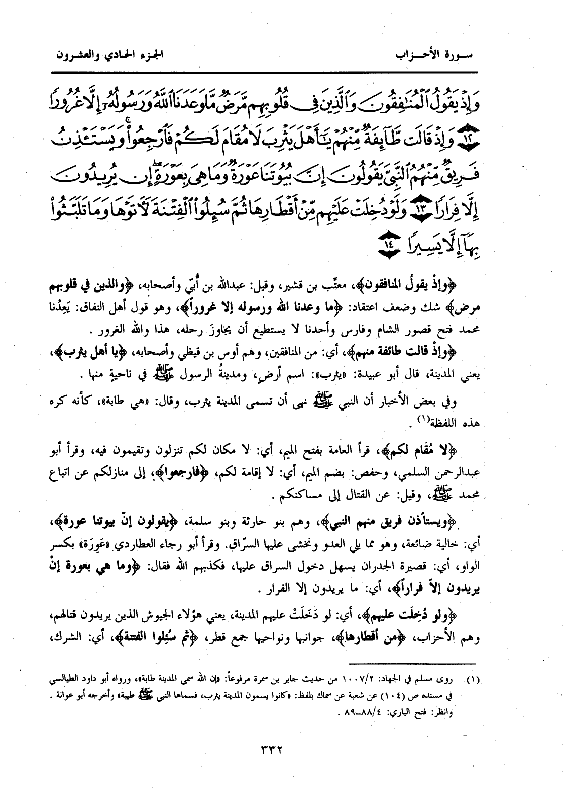 {وَيَسْتَأْذِنُ فَرِيقٌ مِنْهُمُ النَّبِيَّ} وَهُمْ بَنُو حَارِثَةَ وَبَنُو سَلَمَةَ، {يَقُولُونَ إِنَّ بُيُوتَنَا عَوْرَةٌ} أَيْ: خَالِيَةٌ ضَائِعَةٌ، وَهُوَ مِمَّا يَلِي الْعَدُوَّ نَخْشَى عَلَيْهَا السُّرَّاقَ. وَقَرَأَ أَبُو رَجَاءٍ الْعُطَارِدِيُّ "عَوِرَةٌ" بِكَسْرِ الْوَاوِ، أَيْ: قَصِيرَةَ الْجُدْرَانِ يَسْهُلُ دُخُولُ السُّرَّاقِ عَلَيْهَا، فَكَذَّبَهُمُ اللَّهُ فَقَالَ: {وَمَا هِيَ بِعَوْرَةٍ إِنْ يُرِيدُونَ إِلَّا فِرَارًا} أَيْ: مَا يُرِيدُونَ إِلَّا الْفِرَارَ. {وَلَوْ دُخِلَتْ عَلَيْهِمْ} أَيْ: لَوْ دُخِلَتْ عَلَيْهِمُ الْمَدِينَةَ، يَعْنِي هَؤُلَاءِ الْجُيُوشَ الَّذِينَ يُرِيدُونَ قِتَالَهُمْ، وَهُمُ الْأَحْزَابُ، {مِنْ أَقْطَارِهَا} جَوَانِبِهَا وَنَوَاحِيهَا جَمْعُ قُطْرٍ، {ثُمَّ سُئِلُوا الْفِتْنَةَ} أَيْ: الشِّرْكَ.