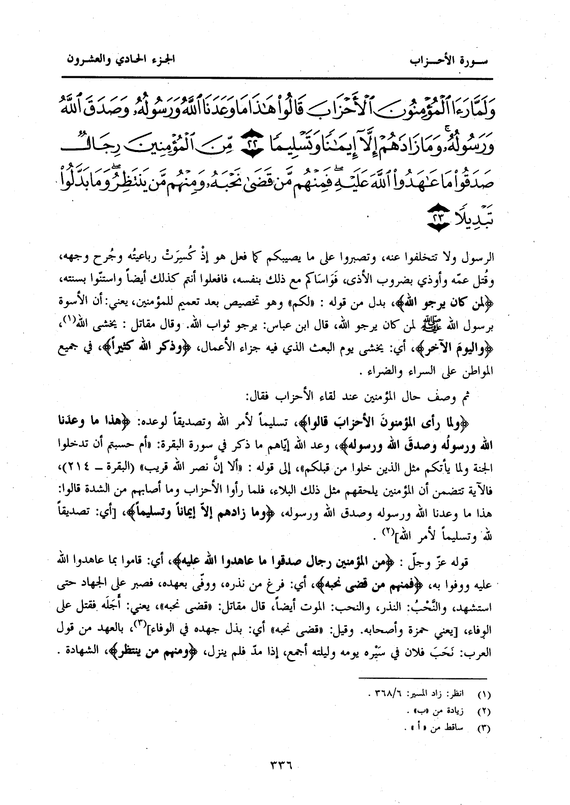 ثُمَّ وَصَفَ حَالَ الْمُؤْمِنِينَ عِنْدَ لِقَاءِ الْأَحْزَابِ فَقَالَ: {وَلَمَّا رَأَى الْمُؤْمِنُونَ الْأَحْزَابَ قَالُوا} تَسْلِيمًا لِأَمْرِ اللَّهِ وَتَصْدِيقًا لِوَعْدِهِ: {هَذَا مَا وَعَدَنَا اللَّهُ وَرَسُولُهُ وَصَدَقَ اللَّهُ وَرَسُولُهُ} وَعْدُ اللَّهِ إِيَّاهُمْ مَا ذُكِرَ فِي سُورَةِ الْبَقَرَةِ: "أَمْ حَسِبْتُمْ أَنْ تَدْخُلُوا الْجَنَّةَ وَلَمَّا يَأْتِكُمْ مَثَلُ الَّذِينَ خَلَوْا مِنْ قَبْلِكُمْ" إِلَى قَوْلِهِ: "أَلَا إِنَّ نَصْرَ اللَّهِ قَرِيبٌ" (الْبَقَرَةِ-214) ، فَالْآيَةُ تَتَضَمَّنُ أَنَّ الْمُؤْمِنِينَ يَلْحَقُهُمْ مِثْلُ ذَلِكَ الْبَلَاءِ، فَلَمَّا رَأَوُا الْأَحْزَابَ وَمَا أَصَابَهُمْ مِنَ الشِّدَّةِ قَالُوا: هَذَا مَا وَعَدَنَا اللَّهُ وَرَسُولُهُ وَصَدَقَ اللَّهُ وَرَسُولُهُ، {وَمَا زَادَهُمْ إِلَّا إِيمَانًا وَتَسْلِيمًا} [أَيْ: تَصْدِيقًا لِلَّهِ وَتَسْلِيمًا لِأَمْرِ اللَّهِ] (1) . قَوْلُهُ عَزَّ وَجَلَّ: {مِنَ الْمُؤْمِنِينَ رِجَالٌ صَدَقُوا مَا عَاهَدُوا اللَّهَ عَلَيْهِ} أَيْ: قَامُوا بِمَا عَاهَدُوا اللَّهَ عَلَيْهِ وَوَفَّوْا بِهِ، {فَمِنْهُمْ مَنْ قَضَى نَحْبَهُ} أَيْ: فَرَغَ مِنْ نَذْرِهِ، وَوَفَّى بِعَهْدِهِ، فَصَبْرَ عَلَى الْجِهَادِ حَتَّى اسْتُشْهِدَ، وَالنَّحْبُ: النَّذْرُ، وَالنَّحْبُ: الْمَوْتُ أَيْضًا، قَالَ مُقَاتِلٌ: "قَضَى نَحْبَهُ"، يَعْنِي: أَجْلَهُ فَقُتِلَ عَلَى الْوَفَاءِ، [يَعْنِي حَمْزَةَ وَأَصْحَابَهُ. وَقِيلَ: "قَضَى نَحْبَهُ" أَيْ: بَذَلَ جُهْدَهُ فِي الْوَفَاءِ] (2) بِالْعَهْدِ مِنْ قَوْلِ الْعَرَبِ: نَحَبَ فُلَانٌ فِي سَيْرِهِ يومه وليلته أجمع، إِذَا مَدَّ فَلَمْ يَنْزِلْ، {وَمِنْهُمْ مَنْ يَنْتَظِرُ} الشَّهَادَةَ.