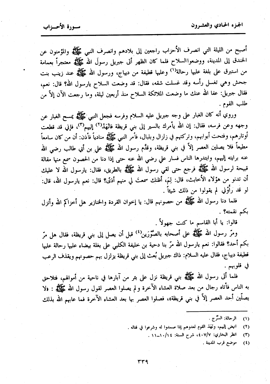 أَصْبَحَ مِنَ اللَّيْلَةِ الَّتِي انْصَرَفَ الْأَحْزَابُ فِيهَا رَاجِعِينَ إِلَى بِلَادِهِمْ وَانْصَرَفَ النَّبِيُّ صَلَّى اللَّهُ عَلَيْهِ وَسَلَّمَ وَالْمُؤْمِنُونَ عَنِ الْخَنْدَقِ إِلَى الْمَدِينَةِ، وَوَضَعُوا السِّلَاحَ فَلَمَّا كَانَ الظُّهْرُ أَتَى جِبْرِيلُ رَسُولَ اللَّهِ صَلَّى اللَّهُ عَلَيْهِ وَسَلَّمَ مُعْتَجِرًا بِعِمَامَةٍ مِنِ اسْتَبْرَقٍ عَلَى بَغْلَةٍ عَلَيْهَا رِحَالَةٌ (1) وَعَلَيْهَا قَطِيفَةٌ مِنْ دِيبَاجٍ، وَرَسُولُ اللَّهِ صَلَّى اللَّهُ عَلَيْهِ وَسَلَّمَ عِنْدَ زَيْنَبَ بِنْتِ جَحْشٍ وَهِيَ تَغْسِلُ رأسه وقد غلست شِقَّهُ، فَقَالَ: قَدْ وَضَعْتَ السِّلَاحَ يَا رَسُولَ اللَّهِ؟ قَالَ: نَعَمْ، فَقَالَ جِبْرِيلُ: عَفَا اللَّهُ عَنْكَ مَا وَضَعَتِ الْمَلَائِكَةُ السِّلَاحَ مُنْذُ أَرْبَعِينَ لَيْلَةً، وَمَا رَجَعْتُ الْآنَ إِلَّا مِنْ طَلَبِ الْقَوْمِ.