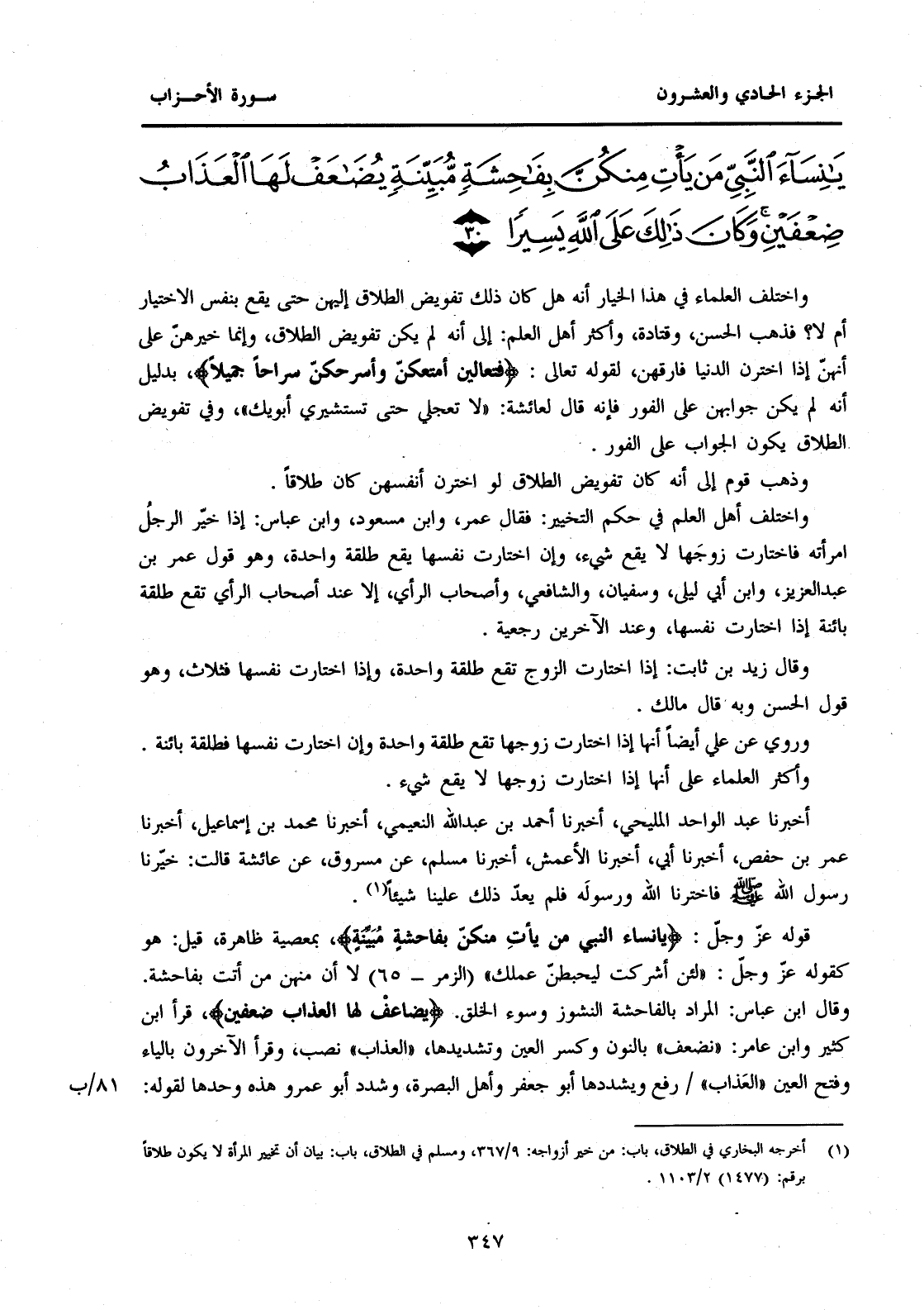 وَاخْتَلَفَ الْعُلَمَاءُ فِي هَذَا الْخِيَارِ أَنَّهُ هَلْ كَانَ ذَلِكَ تَفْوِيضُ الطَّلَاقِ إِلَيْهِنَّ حَتَّى يَقَعَ بِنَفْسِ الِاخْتِيَارِ أَمْ لَا؟ فَذَهَبَ الْحَسَنُ، وَقَتَادَةُ، وَأَكْثَرُ أَهْلِ الْعِلْمِ: إِلَى أَنَّهُ لَمْ يَكُنْ تَفْوِيضَ الطَّلَاقِ، وَإِنَّمَا خَيَّرَهُنَّ عَلَى أَنَّهُنَّ إِذَا اخْتَرْنَ الدُّنْيَا فَارَقَهُنَّ، لِقَوْلِهِ تَعَالَى: {فَتَعَالَيْنَ أُمَتِّعْكُنَّ وَأُسَرِّحْكُنَّ سَرَاحًا جَمِيلًا} بِدَلِيلِ أَنَّهُ لَمْ يَكُنْ جَوَابُهُنَّ عَلَى الْفَوْرِ فَإِنَّهُ قَالَ لِعَائِشَةَ: "لَا تَعْجَلِي حَتَّى تَسْتَشِيرِي أَبَوَيْكِ"، وَفِي تَفْوِيضِ الطَّلَاقِ يَكُونُ الْجَوَابُ عَلَى الْفَوْرِ.