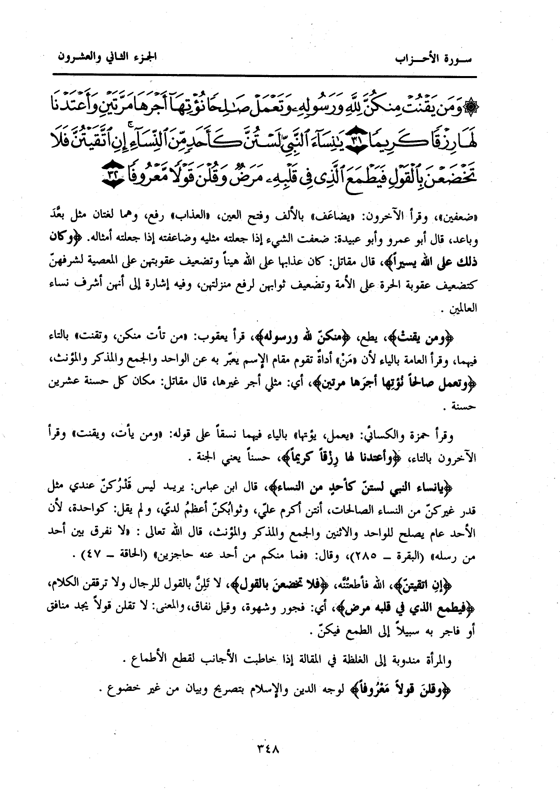 {وَمَنْ يَقْنُتْ مِنْكُنَّ لِلَّهِ وَرَسُولِهِ وَتَعْمَلْ صَالِحًا نُؤْتِهَا أَجْرَهَا مَرَّتَيْنِ وَأَعْتَدْنَا لَهَا رِزْقًا كَرِيمًا (31) يَا نِسَاءَ النَّبِيِّ لَسْتُنَّ كَأَحَدٍ مِنَ النِّسَاءِ إِنِ اتَّقَيْتُنَّ فَلَا تَخْضَعْنَ بِالْقَوْلِ فَيَطْمَعَ الَّذِي فِي قَلْبِهِ مَرَضٌ وَقُلْنَ قَوْلًا مَعْرُوفًا (32) }