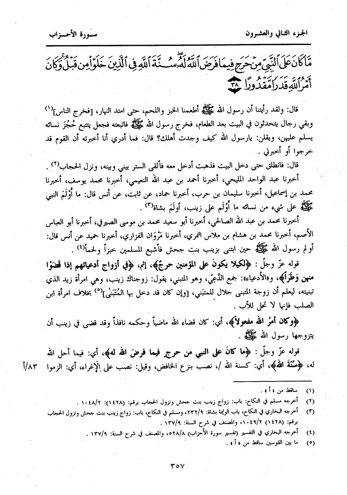قَوْلُهُ عَزَّ وَجَلَّ: {مَا كَانَ عَلَى النَّبِيِّ مِنْ حَرَجٍ فِيمَا فَرَضَ اللَّهُ لَهُ} أَيْ: فِيمَا أَحَلَّ اللَّهُ لَهُ، {سُنَّةَ اللَّهِ} أَيْ: كسنة الله 83/أنُصِبَ بِنَزْعِ الْخَافِضِ، وَقِيلَ: نُصِبَ عَلَى الْإِغْرَاءِ، أَيْ: الْزَمُوا