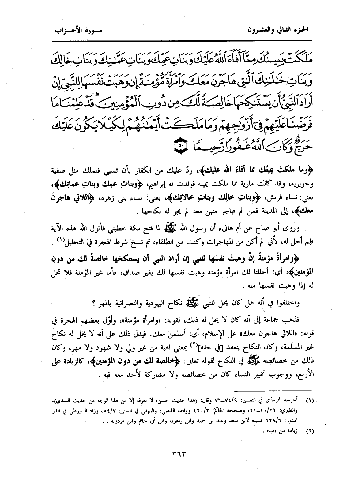{وَمَا مَلَكَتْ يَمِينُكَ مِمَّا أَفَاءَ اللَّهُ عَلَيْكَ} رَدَّ عَلَيْكَ مِنَ الْكَفَّارِ بِأَنْ تَسْبِيَ فَتَمْلِكَ مِثْلَ صَفِيَّةَ وَجُوَيْرِيَةَ، وَقَدْ كَانَتْ مَارِيَةُ مِمَّا مَلَكَتْ يَمِينُهُ فَوَلَدَتْ لَهُ إِبْرَاهِيمَ، {وَبَنَاتِ عَمِّكَ وَبَنَاتِ عَمَّاتِكَ} يَعْنِي: نِسَاءَ قُرَيْشٍ، {وَبَنَاتِ خَالِكَ وَبَنَاتِ خَالَاتِكَ} يَعْنِي: نِسَاءَ بَنِي زُهْرَةَ، {اللَّاتِي هَاجَرْنَ مَعَكَ} إِلَى الْمَدِينَةِ فَمَنْ لَمْ تُهَاجِرْ مِنْهُنَّ مَعَهُ لَمْ يَجُزْ لَهُ نِكَاحُهَا.