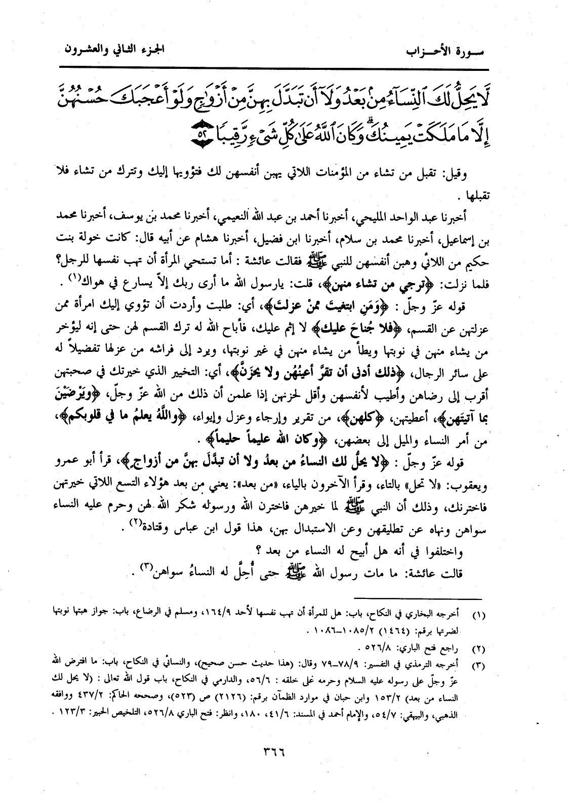 (3) أخرجه الترمذي في تفسير: 9 / 78-79 وقال: (هذا حديث حسن صحيح) ، والنسائي في النكاح، باب: ما افترض الله عز وجل على رسوله وحرمه على خلقه: 6 / 56، والدارمي في النكاح، باب قول الله تعالى: (لا يحل لك النساء من بعد) 2 / 153 وابن حبان في موارد الظمآن برقم: (2126) ص (523) ، وصححه الحاكم: 2 / 437 ووافقه الذهبي، والبيهقي: 7 / 54، والإمام أحمد في المسند: 6 / 41،180، وانظر: فتح الباري 8 / 526، التلخيص الحبير: 3 / 123.