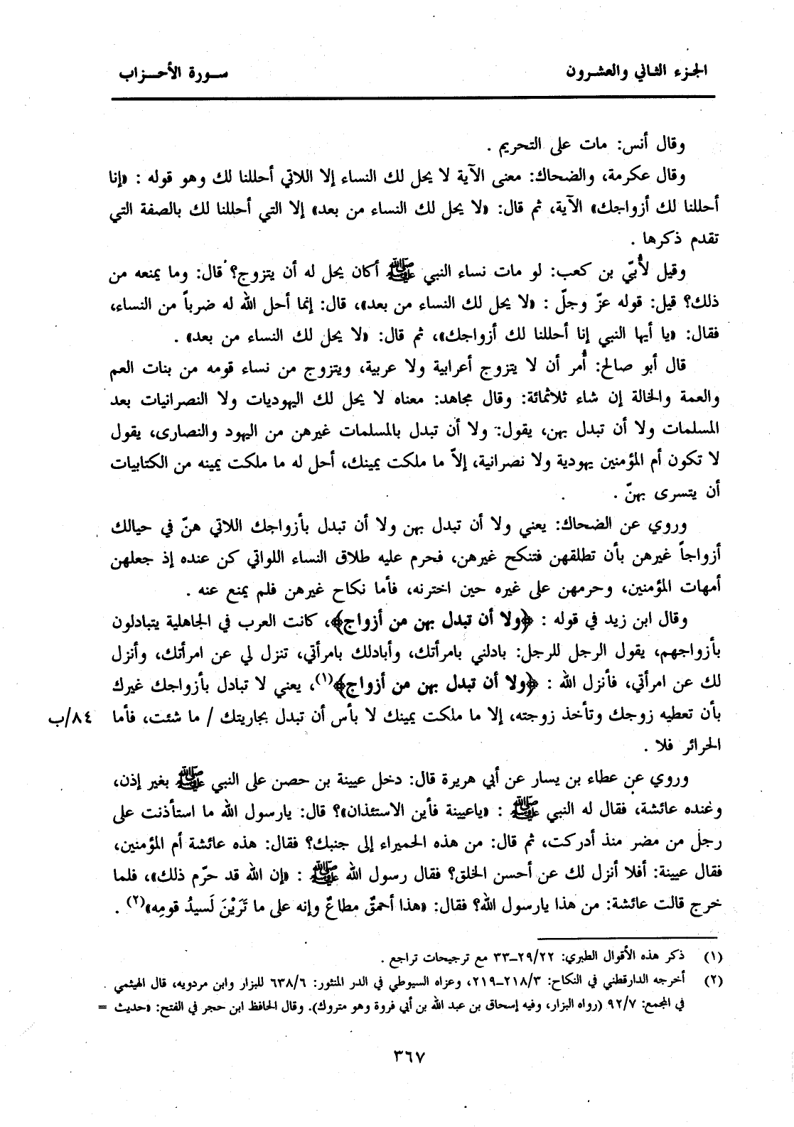 قَالَ أَبُو صَالِحٍ: أُمِرَ أَنْ لَا يَتَزَوَّجَ أَعْرَابِيَّةً وَلَا عَرَبِيَّةً، وَيَتَزَوَّجَ مِنْ نِسَاءِ قَوْمِهِ مِنْ بَنَاتِ الْعَمِّ وَالْعَمَّةِ وَالْخَالَةِ إِنْ شَاءَ ثَلَاثَمِائَةٍ: وَقَالَ مُجَاهِدٌ: مَعْنَاهُ لَا يَحِلُّ لَكَ الْيَهُودِيَّاتُ وَلَا النَّصْرَانِيَّاتُ بَعْدَ الْمُسْلِمَاتِ وَلَا أَنْ تَبَدَّلَ بِهِنَّ، يَقُولُ: وَلَا أَنْ تَبَدَّلَ بِالْمُسْلِمَاتِ غَيْرَهُنَّ مِنَ الْيَهُودِ وَالنَّصَارَى، يَقُولُ لَا تَكُونُ أُمُّ الْمُؤْمِنِينَ يَهُودِيَّةً وَلَا نَصْرَانِيَّةً، إِلَّا مَا مَلَكَتْ يَمِينُكَ، أَحَلَّ لَهُ مَا مَلَكَتْ يَمِينُهُ مِنَ الْكِتَابِيَّاتِ أَنْ يَتَسَرَّى بِهِنَّ.