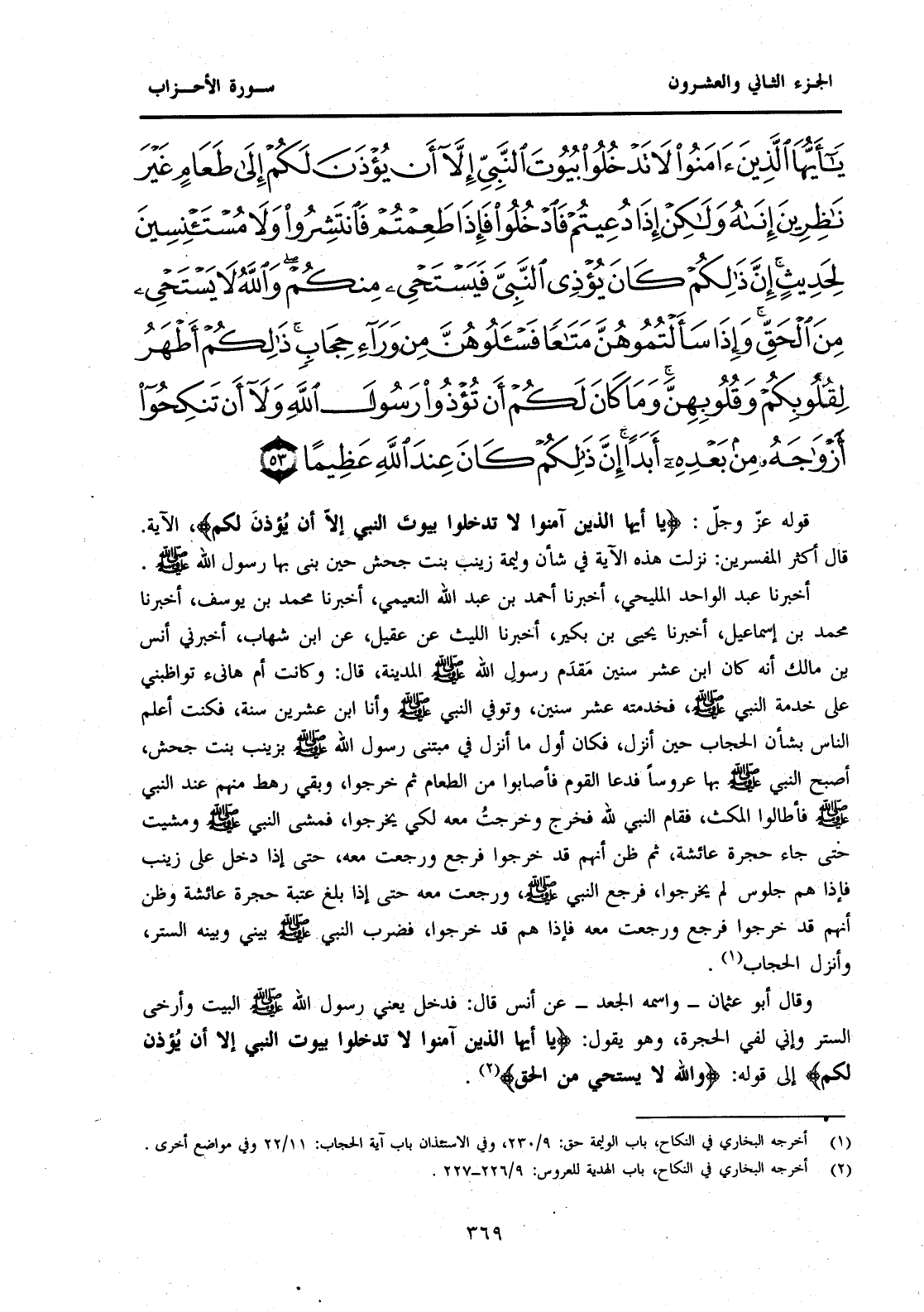 {يَا أَيُّهَا الَّذِينَ آمَنُوا لَا تَدْخُلُوا بُيُوتَ النَّبِيِّ إِلَّا أَنْ يُؤْذَنَ لَكُمْ إِلَى طَعَامٍ غَيْرَ نَاظِرِينَ إِنَاهُ وَلَكِنْ إِذَا دُعِيتُمْ فَادْخُلُوا فَإِذَا طَعِمْتُمْ فَانْتَشِرُوا وَلَا مُسْتَأْنِسِينَ لِحَدِيثٍ إِنَّ ذَلِكُمْ كَانَ يُؤْذِي النَّبِيَّ فَيَسْتَحْيِي مِنْكُمْ وَاللَّهُ لَا يَسْتَحْيِي مِنَ الْحَقِّ وَإِذَا سَأَلْتُمُوهُنَّ مَتَاعًا فَاسْأَلُوهُنَّ مِنْ وَرَاءِ حِجَابٍ ذَلِكُمْ أَطْهَرُ لِقُلُوبِكُمْ وَقُلُوبِهِنَّ وَمَا كَانَ لَكُمْ أَنْ تُؤْذُوا رَسُولَ اللَّهِ وَلَا أَنْ تَنْكِحُوا أَزْوَاجَهُ مِنْ بَعْدِهِ أَبَدًا إِنَّ ذَلِكُمْ كَانَ عِنْدَ اللَّهِ عَظِيمًا (53) }