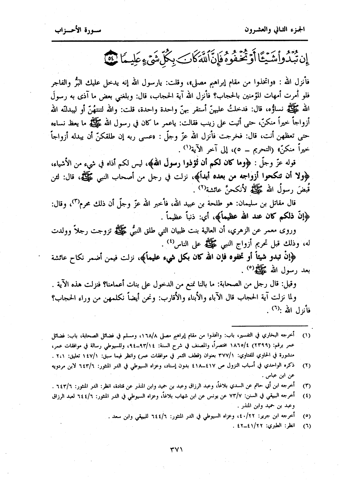 {إِنْ تُبْدُوا شَيْئًا أَوْ تُخْفُوهُ فَإِنَّ اللَّهَ كَانَ بِكُلِّ شَيْءٍ عَلِيمًا} نَزَلَتْ فِيمَنْ أَضْمَرَ نِكَاحَ عَائِشَةَ بَعْدَ رَسُولِ اللَّهِ صَلَّى اللَّهُ عَلَيْهِ وَسَلَّمَ (5) .