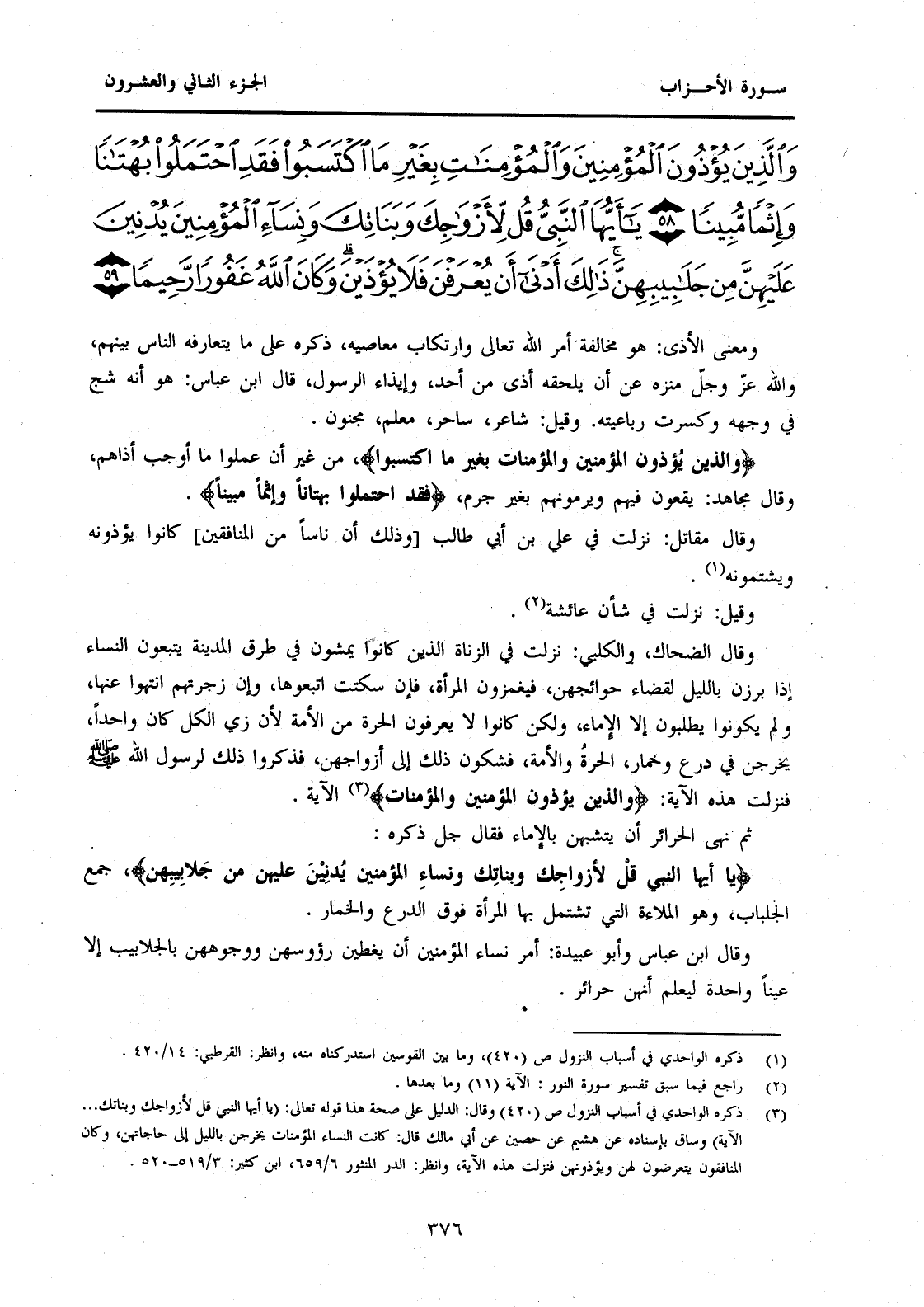 (3) ذكره الواحدي في أسباب النزول ص (420) ، وقال: الدليل على صحة هذا قوله تعالى: (يا أيها النبي قل لأزواجك وبناتك..الآية) وساق بإسناده عن هيثم عن حصين عن أبي مالك قال: كانت النساء المؤمنات يخرجن بالليل إلى حاجتهن، وكان المنافقون يتعرضون لهن ويؤذونهن فنزلت هذه الآية، وانظر: الدر المنثور 6 / 659، ابن كثير: 3 / 519-520.