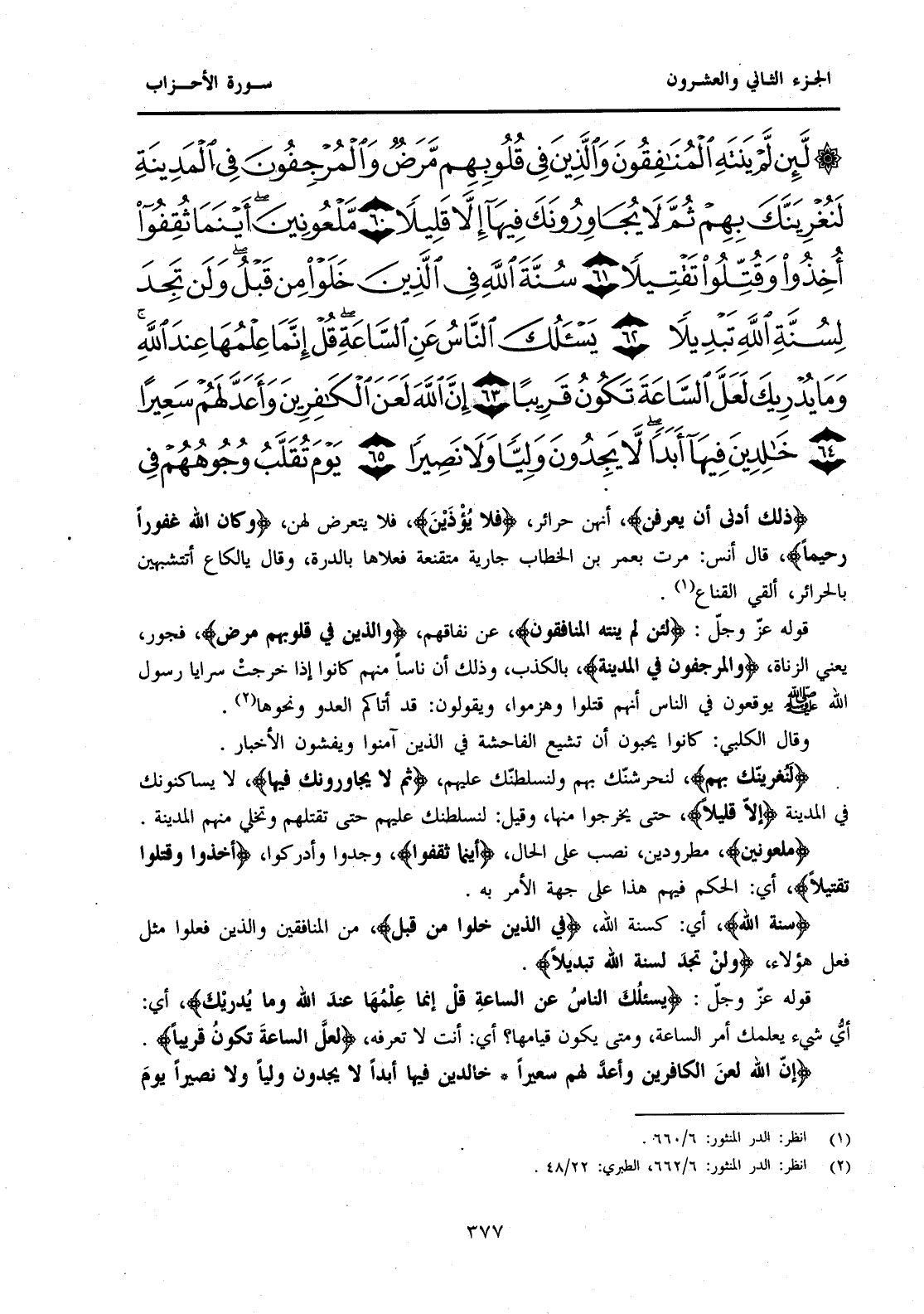 {لَنُغْرِيَنَّكَ بِهِمْ} لَنُحَرِّشَنَّكَ بِهِمْ وَلَنُسَلِّطَنَّكَ عَلَيْهِمْ، {ثُمَّ لَا يُجَاوِرُونَكَ فِيهَا} لَا يُسَاكِنُوكَ فِي الْمَدِينَةِ {إِلَّا قَلِيلًا} حَتَّى يُخْرَجُوا منها، وقيل: لنسلنطك عَلَيْهِمْ حَتَّى تَقْتُلَهُمْ وَتُخْلِي مِنْهُمُ الْمَدِينَةَ. {مَلْعُونِينَ} مَطْرُودِينَ، نُصِبَ عَلَى الْحَالِ، {أَيْنَ مَا ثُقِفُوا} وُجِدُوا وَأُدْرِكُوا، {أُخِذُوا وَقُتِّلُوا تَقْتِيلًا} أَيِ: الْحُكْمُ فِيهِمْ هَذَا عَلَى جِهَةِ الْأَمْرِ بِهِ. {سُنَّةَ اللَّهِ} أَيْ: كَسُنَّةِ اللَّهِ، {فِي الَّذِينَ خَلَوْا مِنْ قَبْلُ} مِنَ الْمُنَافِقِينَ وَالَّذِينَ فَعَلُوا مِثْلَ فِعْلِ هَؤُلَاءِ، {وَلَنْ تَجِدَ لِسُنَّةِ اللَّهِ تَبْدِيلًا} قَوْلُهُ عَزَّ وَجَلَّ: {يَسْأَلُكَ النَّاسُ، عَنِ السَّاعَةِ قُلْ إِنَّمَا عِلْمُهَا عِنْدَ اللَّهِ وَمَا يُدْرِيكَ} أَيْ: أَيُّ شَيْءٍ يُعْلِمُكَ أَمْرَ السَّاعَةِ، وَمَتَى يَكُونُ قِيَامُهَا؟ أَيْ: أَنْتَ لَا تَعْرِفُهُ، {لَعَلَّ السَّاعَةَ تَكُونُ، قَرِيبًا} {إِنَّ اللَّهَ لَعَنَ الْكَافِرِينَ وَأَعَدَّ لَهُمْ سَعِيرًا خَالِدِينَ فِيهَا أَبَدًا لَا يَجِدُونَ وَلِيًّا وَلَا نَصِيرًا يَوْمَ تُقَلَّبُ وُجُوهُهُمْ فِي النَّارِ}