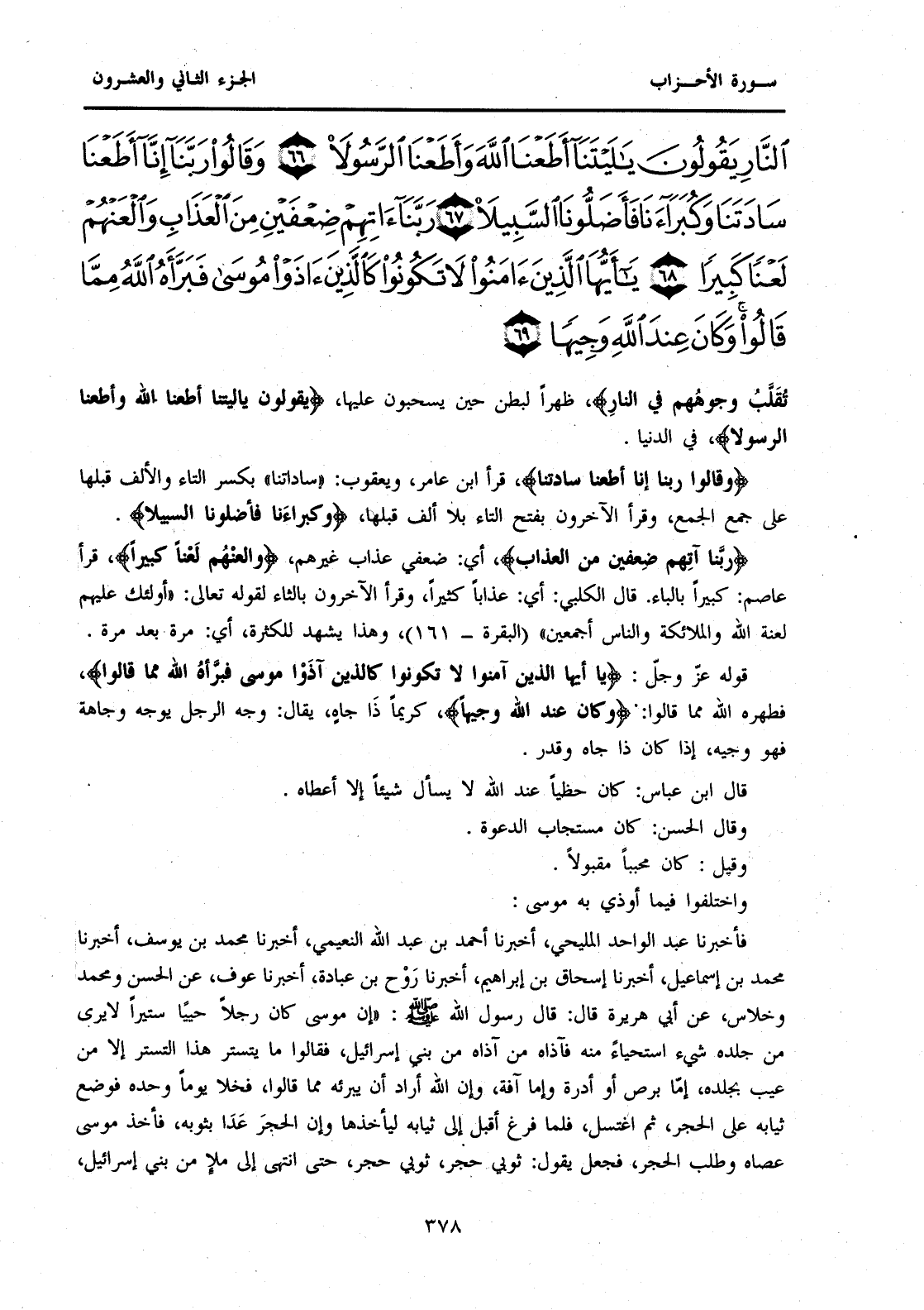 {وَقَالُوا رَبَّنَا إِنَّا أَطَعْنَا سَادَتَنَا} قَرَأَ ابْنُ عَامِرٍ، وَيَعْقُوبُ: "سَادَاتِنَا" بكسر التاء والأف قَبْلَهَا عَلَى جَمْعِ الْجَمْعِ، وَقَرَأَ الْآخَرُونَ بِفَتْحِ التَّاءِ بِلَا أَلِفٍ قَبْلَهَا، {وَكُبَرَاءَنَا فَأَضَلُّونَا السَّبِيلا} {رَبَّنَا آتِهِمْ ضِعْفَيْنِ مِنَ الْعَذَابِ} أَيْ: ضَعْفِي عَذَابِ غَيْرِهِمْ، {وَالْعَنْهُمْ لَعْنًا كَبِيرًا} قَرَأَ عَاصِمٌ: كَبِيرًا بِالْبَاءِ. قَالَ الْكَلْبِيُّ: أَيْ: عَذَابًا كَثِيرًا، وَقَرَأَ الْآخَرُونَ بِالثَّاءِ لِقَوْلِهِ تَعَالَى: "أُولَئِكَ عَلَيْهِمْ لَعْنَةُ اللَّهِ وَالْمَلَائِكَةِ وَالنَّاسِ أَجْمَعِينَ" (الْبَقَرَةِ-161) ، وَهَذَا يَشْهَدُ لِلْكَثْرَةِ، أَيْ: مَرَّةً بَعْدَ مَرَّةٍ. قَوْلُهُ عَزَّ وَجَلَّ: {يَا أَيُّهَا الَّذِينَ آمَنُوا لَا تَكُونُوا كَالَّذِينَ آذَوْا مُوسَى فَبَرَّأَهُ اللَّهُ مِمَّا قَالُوا} فَطَهَّرَهُ اللَّهُ مِمَّا قَالُوا: {وَكَانَ عِنْدَ اللَّهِ وَجِيهًا} كَرِيمًا ذَا جَاهٍ، يُقَالُ: وَجُهَ الرَّجُلُ يُوجَهُ وَجَاهَةً فَهُوَ وَجِيهٌ، إِذَا كَانَ ذَا جَاهٍ وَقَدْرٍ.