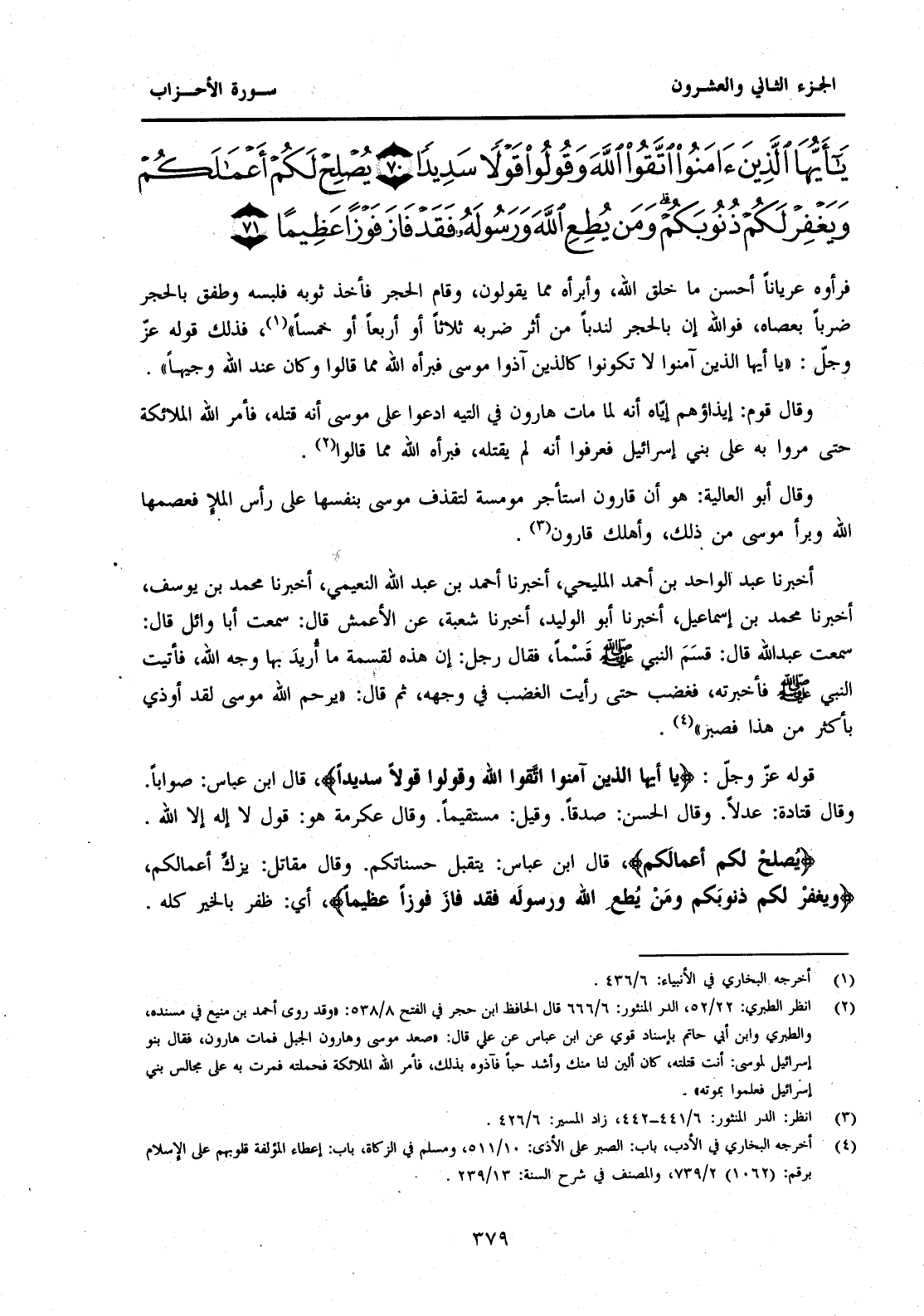 (2) انظر الطبري: 22 / 52، الدر المنثور: 6 / 666 قال الحافظ ابن حجر في الفتح 8 / 538: "وقد روى أحمد بن منيع في مسنده" والطبري وابن أبي حلتم بإسناد قوي عن ابن عباس عن علي قال: "صعد موسى وهارون الجبل فمات هارون، فقال بنو إسرائيل لموسى: أنت قتلته، كان ألين لنا منك وأشد حبا فآذوه بذلك، فأمر الله الملائكة فحملته فمرت به على مجالس بني إسرائيل فعلموا بموته".