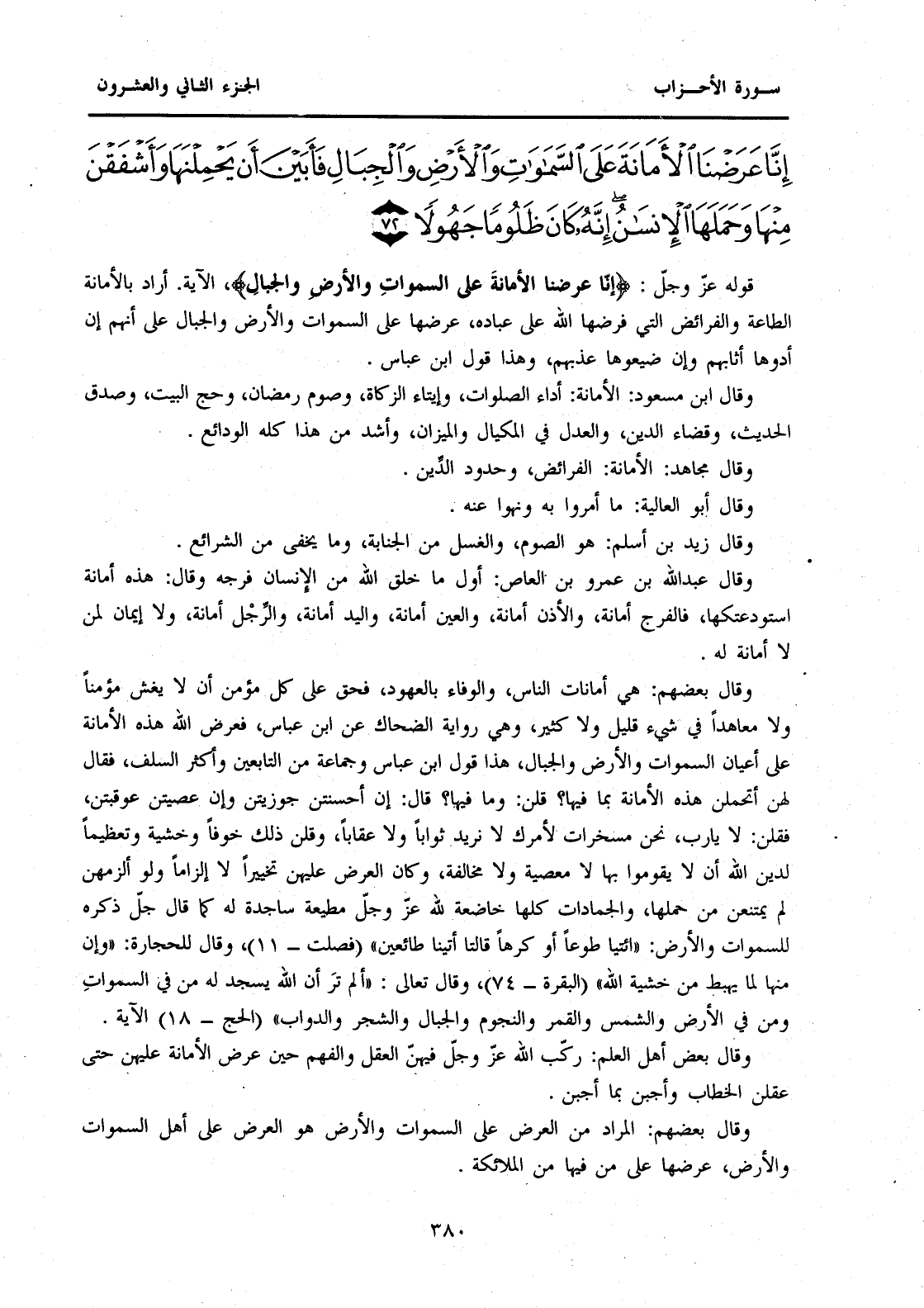 قَوْلُهُ عَزَّ وَجَلَّ: {إِنَّا عَرَضْنَا الأمَانَةَ عَلَى السَّمَوَاتِ وَالْأَرْضِ وَالْجِبَالِ} الْآيَةَ. أَرَادَ بِالْأَمَانَةِ الطَّاعَةَ وَالْفَرَائِضَ الَّتِي فَرَضَهَا اللَّهُ عَلَى عِبَادِهِ، عرضها على السموات وَالْأَرْضِ وَالْجِبَالِ عَلَى أَنَّهُمْ إِنْ أَدَّوْهَا أَثَابَهُمْ وَإِنْ ضَيَّعُوهَا عَذَّبَهُمْ، وَهَذَا قَوْلُ ابْنُ عَبَّاسٍ.