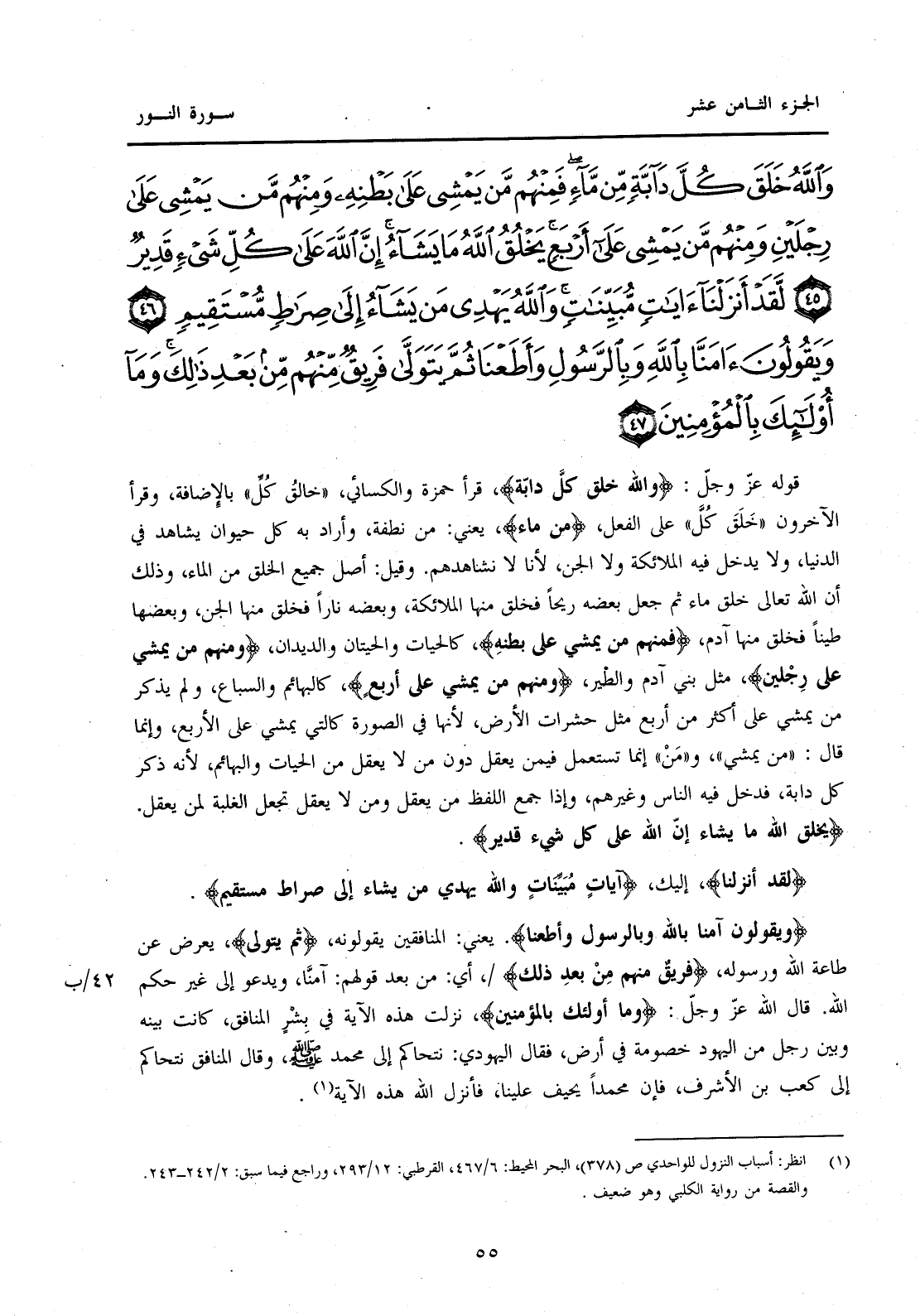 قَوْلُهُ عَزَّ وَجَلَّ: {وَاللَّهُ خَلَقَ كُلَّ دَابَّةٍ} قَرَأَ حَمْزَةُ وَالْكِسَائِيُّ، "خَالِقُ كُلِّ" بِالْإِضَافَةِ، وَقَرَأَ الْآخَرُونَ "خَلَقَ كُلَّ" عَلَى الْفِعْلِ، {مِنْ مَاءٍ} يَعْنِي: مِنْ نُطْفَةٍ، وَأَرَادَ بِهِ كُلَّ حَيَوَانٍ يُشَاهَدُ فِي الدُّنْيَا، وَلَا يَدْخُلُ فِيهِ الْمَلَائِكَةُ وَلَا الْجِنُّ، لِأَنَّا لَا نُشَاهِدُهُمْ. وَقِيلَ: أَصْلُ جَمِيعِ الْخَلْقِ مِنَ الْمَاءِ، وَذَلِكَ أَنَّ اللَّهَ تَعَالَى خَلَقَ مَاءً ثُمَّ جَعَلَ بَعْضَهُ رِيحًا فَخَلَقَ مِنْهَا الْمَلَائِكَةَ، وَبَعْضَهُ نَارًا فَخَلَقَ مِنْهَا الْجِنَّ، وَبَعْضَهَا طِينًا فَخَلَقَ مِنْهَا آدَمَ، {فَمِنْهُمْ مَنْ يَمْشِي عَلَى بَطْنِهِ} كَالْحَيَّاتِ وَالْحِيتَانِ وَالدِّيدَانِ، {وَمِنْهُمْ مَنْ يَمْشِي عَلَى رِجْلَيْنِ} مِثْلُ بَنِي آدَمَ وَالطَّيْرِ، {وَمِنْهُمْ مَنْ يَمْشِي عَلَى أَرْبَعٍ} كَالْبَهَائِمِ وَالسِّبَاعِ، وَلَمْ يَذْكُرْ مَنْ يَمْشِي عَلَى أَكْثَرَ مِنْ أَرْبَعٍ مِثْلَ حَشَرَاتِ الْأَرْضِ، لِأَنَّهَا فِي الصُّورَةِ كَالَّتِي يَمْشِي عَلَى الْأَرْبَعِ، وَإِنَّمَا قَالَ: "مَنْ يَمْشِي" وَ"مَنْ" إِنَّمَا تُسْتَعْمَلُ فِيمَنْ يَعْقِلُ دُونَ مَنْ لَا يَعْقِلُ مِنَ الْحَيَّاتِ وَالْبَهَائِمِ، لِأَنَّهُ ذَكَرَ كُلَّ دَابَّةٍ، فَدَخْلَ فِيهِ النَّاسُ وَغَيْرُهُمْ، وَإِذَا جَمَعَ اللَّفْظُ مَنْ يَعْقِلُ وَمَنْ لَا يَعْقِلُ تُجْعَلُ الْغَلَبَةُ لِمَنْ يَعْقِلُ. {يَخْلُقُ اللَّهُ مَا يَشَاءُ إِنَّ اللَّهَ عَلَى كُلِّ شَيْءٍقَدِيرٌ} {لَقَدْ أَنْزَلْنَا} إِلَيْكَ، {آيَاتٍ مُبَيِّنَاتٍ وَاللَّهُ، يَهْدِي مَنْ يَشَاءُ إِلَى صِرَاطٍ مُسْتَقِيمٍ} {وَيَقُولُونَ آمَنَّا بِاللَّهِ وَبِالرَّسُولِ وَأَطَعْنَا} يَعْنِي: الْمُنَافِقِينَ يَقُولُونَهُ، {ثُمَّ يَتَوَلَّى} يُعْرِضُ عَنْ طَاعَةِ اللَّهِ وَرَسُولِهِ، {فَرِيقٌ مِنْهُمْ مِنْ بَعْدِ ذَلِك} 42/ب،، أَيْ: مِنْ بَعْدِ قَوْلِهِمْ: آمَنَّا وَيَدْعُو إِلَى غَيْرِ حُكْمِ اللَّهِ. قَالَ اللَّهُ عَزَّ وَجَلَّ: {وَمَا أُولَئِكَ بِالْمُؤْمِنِينَ} نَزَلَتْ هَذِهِ الْآيَةُ فِي بِشْرٍ الْمُنَافِقِ، كَانَتْ بَيْنَهُ وَبَيْنَ رَجُلٍ مِنَ الْيَهُودِ خُصُومَةٌ فِي أَرْضٍ، فَقَالَ الْيَهُودِيُّ: نَتَحَاكَمُ إِلَى مُحَمَّدٍ صَلَّى اللَّهُ عَلَيْهِ وَسَلَّمَ، وَقَالَ الْمُنَافِقُ نَتَحَاكَمُ إِلَى كَعْبِ بْنِ الْأَشْرَفِ، فَإِنَّ مُحَمَّدًا يَحِيفُ عَلَيْنَا، فَأَنْزَلَ اللَّهُ هَذِهِ الْآيَةَ (1)