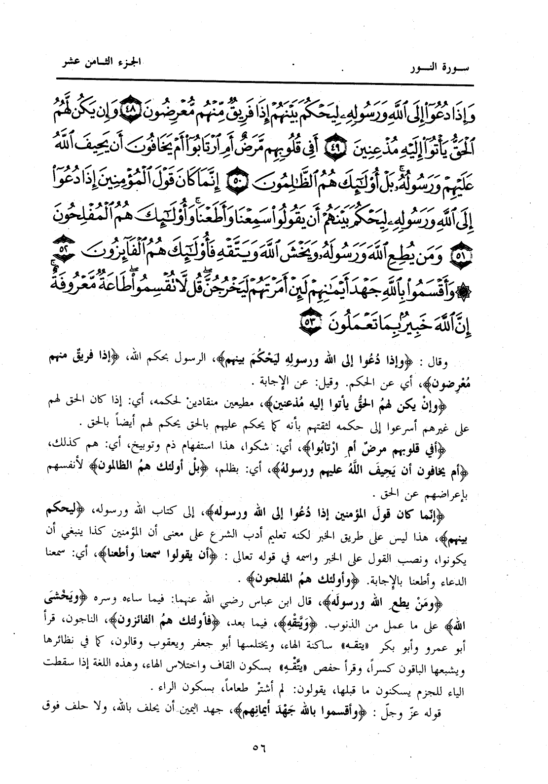 وَقَالَ: {وَإِذَا دُعُوا إِلَى اللَّهِ وَرَسُولِهِ لِيَحْكُمَ بَيْنَهُمْ} الرَّسُولُ بِحُكْمِ اللَّهِ، {إِذَا فَرِيقٌ مِنْهُمْ مُعْرِضُونَ} أَيْ عَنِ الْحُكْمِ. وَقِيلَ: عَنِ الْإِجَابَةِ. {وَإِنْ يَكُنْ لَهُمُ الْحَقُّ يَأْتُوا إِلَيْهِ مُذْعِنِينَ} مُطِيعِينَ مُنْقَادِينَ لِحُكْمِهِ، أَيْ: إِذَا كَانَ الْحَقُّ لَهُمْ عَلَى غَيْرِهِمْ أَسْرَعُوا إِلَى حُكْمِهِ لِثِقَتِهِمْ بِأَنَّهُ كَمَا يَحْكُمُ عَلَيْهِمْ بِالْحَقِّ يَحْكُمُ لَهُمْ أَيْضًا بِالْحَقِّ. {أَفِي قُلُوبِهِمْ مَرَضٌ أَمِ ارْتَابُوا} أَيْ: شَكُّوا، هَذَا اسْتِفْهَامُ ذَمٍّ وَتَوْبِيخٍ، أَيْ: هُمْ كَذَلِكَ، {أَمْ يَخَافُونَ أَنْ يَحِيفَ اللَّهُ عَلَيْهِمْ وَرَسُولُهُ} أَيْ: بِظُلْمٍ، {بَلْ أُولَئِكَ هُمُ الظَّالِمُونَ} لِأَنْفُسِهِمْ بِإِعْرَاضِهِمْ عَنِ الْحَقِّ. {إِنَّمَا كَانَ قَوْلَ الْمُؤْمِنِينَ إِذَا دُعُوا إِلَى اللَّهِ وَرَسُولِهِ} إِلَى كِتَابِ اللَّهِ وَرَسُولِهِ، {لِيَحْكُمَ بَيْنَهُمْ} هَذَا لَيْسَ عَلَى طَرِيقِ الْخَبَرِ لَكِنَّهُ تَعْلِيمُ أَدَبِ الشَّرْعِ عَلَى مَعْنَى أَنَّ الْمُؤْمِنِينَ كَذَا يَنْبَغِي أَنْ يَكُونُوا، وَنَصْبُ الْقَوْلِ عَلَى الْخَبَرِ وَاسْمُهُ فِي قَوْلِهِ تَعَالَى: {أَنْ يَقُولُوا سَمِعْنَا وَأَطَعْنَا} أَيْ: سَمِعْنَا الدُّعَاءَ وَأَطَعْنَا بِالْإِجَابَةِ. {وَأُولَئِكَ هُمُ الْمُفْلِحُونَ} {وَمَنْ يُطِعِ اللَّهَ وَرَسُولَهُ} قَالَ ابْنُ عَبَّاسٍ رَضِيَ اللَّهُ عَنْهُمَا: فِيمَا سَاءَهُ وَسَرَّهُ {وَيَخْشَ اللَّهَ} عَلَى مَا عَمِلَ مِنَ الذُّنُوبِ. {وَيَتَّقْهِ} فِيمَا بَعْدَهُ، {فَأُولَئِكَ هُمُ الْفَائِزُونَ} النَّاجُونَ، قَرَأَ أَبُو عَمْرٍو وَأَبُو بَكْرٍ "يَتَّقِهْ" سَاكِنَةَ الْهَاءِ، وَيَخْتَلِسُهَا أَبُو جَعْفَرٍ وَيَعْقُوبُ وَقَالُونُ، كَمَا فِي نَظَائِرِهَا وَيُشْبِعُهَا الْبَاقُونَ كَسْرًا، وَقَرَأَ حَفْصٌ "يَتَّقْهِ" بِسُكُونِ الْقَافِ وَاخْتِلَاسِ الْهَاءِ، وَهَذِهِ اللُّغَةُ إِذَا سَقَطَتِ الْيَاءُ لِلْجَزْمِ يُسَكِّنُونَ مَا قَبْلَهَا، يَقُولُونَ: لَمْ أَشْتَرْ طَعَامًا بِسُكُونِ الرَّاءِ. قَوْلُهُ عَزَّ وَجَلَّ: {وَأَقْسَمُوا بِاللَّهِ جَهْدَ أَيْمَانِهِمْ} جَهْدُ الْيَمِينِ أَنْ يَحْلِفَ بِاللَّهِ، وَلَا حَلِفَ فَوْقَ