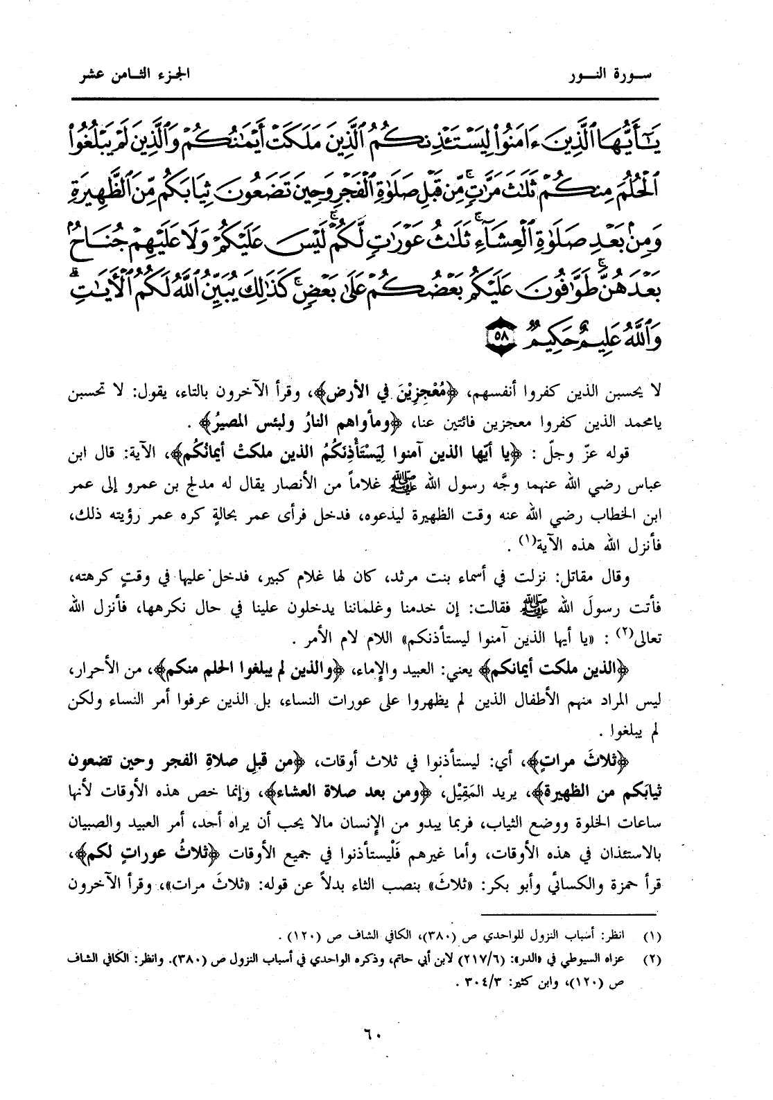 {يَا أَيُّهَا الَّذِينَ آمَنُوا لِيَسْتَأْذِنْكُمُ الَّذِينَ مَلَكَتْ أَيْمَانُكُمْ وَالَّذِينَ لَمْ يَبْلُغُوا الْحُلُمَ مِنْكُمْ ثَلَاثَ مَرَّاتٍ مِنْ قَبْلِ صَلَاةِ الْفَجْرِ وَحِينَ تَضَعُونَ ثِيَابَكُمْ مِنَ الظَّهِيرَةِ وَمِنْ بَعْدِ صَلَاةِ الْعِشَاءِ ثَلَاثُ عَوْرَاتٍ لَكُمْ لَيْسَ عَلَيْكُمْ وَلَا عَلَيْهِمْ جُنَاحٌ بَعْدَهُنَّ طَوَّافُونَ عَلَيْكُمْ بَعْضُكُمْ عَلَى بَعْضٍ كَذَلِكَ يُبَيِّنُ اللَّهُ لَكُمُ الْآيَاتِ وَاللَّهُ عَلِيمٌ حَكِيمٌ (58) }