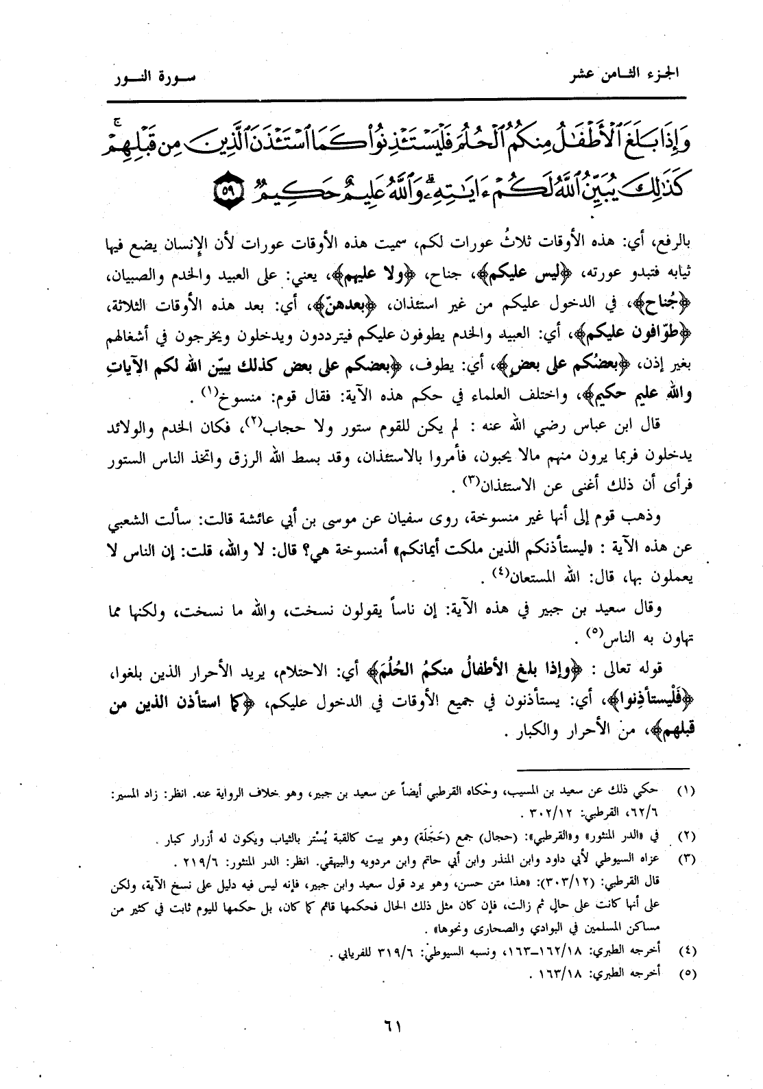 قَالَ ابْنُ عَبَّاسٍ رَضِيَ اللَّهُ عَنْهُ: لَمْ يَكُنْ لِلْقَوْمِ سُتُورٌ وَلَا حِجَابٌ (2) ، فَكَانَ الْخَدَمُ وَالْوَلَائِدُ يَدْخُلُونَ فَرُبَّمَا يَرَوْنَ مِنْهُمْ مَا لَا يُحِبُّونَ، فَأُمِرُوا بِالِاسْتِئْذَانِ، وَقَدْ بَسَطَ اللَّهُ الرِّزْقَ وَاتَّخَذَ النَّاسُ السُّتُورَ فَرَأَى أَنَّ ذَلِكَ أَغْنَى عَنِ الِاسْتِئْذَانِ (3) وَذَهَبَ قَوْمٌ إِلَى أَنَّهَا غَيْرُ مَنْسُوخَةٍ، رَوَى سُفْيَانُ عَنْ مُوسَى بْنِ أَبِي عَائِشَةَ قَالَتْ: سَأَلْتُ الشَّعْبِيَّ عَنْ هَذِهِ الْآيَةِ: "لِيَسْتَأْذِنْكُمُ الَّذِينَ مَلَكَتْ أَيْمَانُكُمْ" أَمَنْسُوخَةٌ هِيَ؟ قَالَ: لَا وَاللَّهِ، قُلْتُ: إِنَّ النَّاسَ لَا يَعْمَلُونَ بِهَا، قَالَ: اللَّهُ الْمُسْتَعَانُ (4) وَقَالَ سَعِيدُ بْنُ جُبَيْرٍ فِي هَذِهِ الْآيَةِ: إِنَّ نَاسًا يَقُولُونَ نُسِخَتْ، وَاللَّهِ مَا نُسِخَتْ، وَلَكِنَّهَا مِمَّا تَهَاوَنَ بِهِ النَّاسُ (5) .