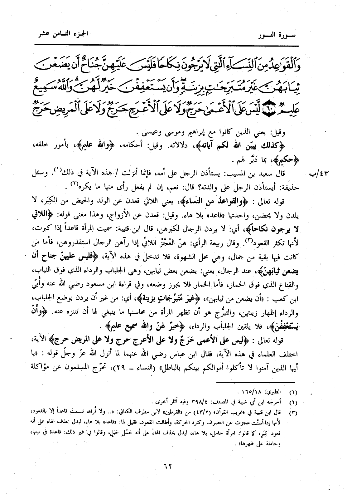 قَوْلُهُ تَعَالَى: {وَالْقَوَاعِدُ مِنَ النِّسَاءِ} يَعْنِي اللَّاتِي قَعَدْنَ عَنِ الْوَلَدِ وَالْحَيْضِ مِنَ الْكِبَرِ، لَا يَلِدْنَ وَلَا يَحِضْنَ، وَاحِدَتُهَا "قَاعِدٌ" بِلَا هَاءٍ. وَقِيلَ: قَعَدْنَ عَنِ الْأَزْوَاجِ، وَهَذَا مَعْنَى قَوْلِهِ: {اللَّاتِي لَا يَرْجُونَ نِكَاحًا} أَيْ: لَا يُرِدْنَ الرِّجَالَ لِكِبَرِهِنَّ، قَالَ ابْنُ قُتَيْبَةَ: سُمِّيَتِ الْمَرْأَةُ قَاعِدًا إِذَا كَبُرَتْ، لِأَنَّهَا تُكْثِرُ الْقُعُودَ (3) . وَقَالَ رَبِيعَةُ الرَّأْيُ: هُنَّ الْعُجَّزُ، اللَّائِي إِذَا رَآهُنَّ الرِّجَالُ اسْتَقْذَرُوهُنَّ، فَأَمَّا مَنْ كَانَتْ فِيهَا بَقِيَّةٌ مِنْ جِمَالٍ، وَهِيَ مَحَلُّ الشَّهْوَةِ، فَلَا تَدْخُلُ فِي هَذِهِ الْآيَةِ، {فَلَيْسَ عَلَيْهِنَّ جُنَاحٌ أَنْ يَضَعْنَ ثِيَابَهُنَّ} عِنْدَ الرِّجَالِ، يَعْنِي: يَضَعْنَ بَعْضَ ثِيَابِهِنَّ، وَهِيَ الْجِلْبَابُ وَالرِّدَاءُ الَّذِي فَوْقَ الثِّيَابِ، وَالْقِنَاعِ الَّذِي فَوْقَ الْخِمَارِ، فَأَمَّا الْخِمَارُ فَلَا يَجُوزُ وَضْعُهُ، وَفِي قِرَاءَةِ ابْنِ مَسْعُودٍ رَضِيَ اللَّهُ عَنْهُ وَأُبَيِّ بْنِ كَعْبٍ: "أَنْ يَضَعْنَ مِنْ ثِيَابِهِنَّ"، {غَيْرَ مُتَبَرِّجَاتٍ بِزِينَةٍ} أَيْ: مِنْ غَيْرِ أَنْ يُرِدْنَ بِوَضْعِ الْجِلْبَابِ، وَالرِّدَاءُ إِظْهَارُ زِينَتِهِنَّ، وَالتَّبَرُّجُ هُوَ أَنْ تُظْهِرَ الْمَرْأَةُ مِنْ مَحَاسِنِهَا مَا يَنْبَغِي لَهَا أَنْ تَتَنَزَّهَ عَنْهُ. {وَأَنْ يَسْتَعْفِفْنَ} فَلَا يُلْقِينَ الْجِلْبَابَ وَالرِّدَاءَ، {خَيْرٌ لَهُنَّ وَاللَّهُ سَمِيعٌ عَلِيمٌ} قَوْلُهُ تَعَالَى: {لَيْسَ عَلَى الْأَعْمَى حَرَجٌ وَلَا عَلَى الْأَعْرَجِ حَرَجٌ وَلا عَلَىالْمَرِيضِ حَرَجٌ} الْآيَةَ، اخْتَلَفَ الْعُلَمَاءُ فِي هَذِهِ الْآيَةِ، فَقَالَ ابْنُ عَبَّاسٍ رَضِيَ اللَّهُ عَنْهُمَا لَمَّا أَنْزَلَ اللَّهُ عَزَّ وَجَلَّ قَوْلَهُ: "يَا أَيُّهَا الَّذِينَ آمَنُوا لَا تَأْكُلُوا أَمْوَالَكُمْ بَيْنَكُمْ بِالْبَاطِلِ" (النِّسَاءِ-29) ، تَحَرَّجَ الْمُسْلِمُونَ عَنْ مُؤَاكَلَةِ