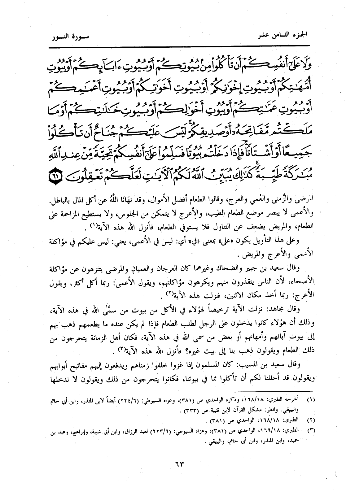 وَقَالَ سَعِيدُ بْنُ جُبَيْرٍ وَالضَّحَّاكُ وَغَيْرُهُمَا كَانَ الْعُرْجَانُ وَالْعُمْيَانُ وَالْمَرْضَى يَتَنَزَّهُونَ عَنْ مُؤَاكَلَةِ الْأَصِحَّاءِ، لِأَنَّ النَّاسَ يَتَقَذَّرُونَ مِنْهُمْ وَيَكْرَهُونَ مُؤَاكَلَتَهُمْ، وَيَقُولُ الْأَعْمَى: رُبَّمَا أَكَلَ أَكْثَرَ، وَيَقُولُ الْأَعْرَجُ: رُبَّمَا أَخَذَ مَكَانَ الِاثْنَيْنِ، فَنَزَلَتْ هَذِهِ الْآيَةُ (2) . وَقَالَ مُجَاهِدٌ: نَزَلَتِ الْآيَةُ تَرْخِيصًا لِهَؤُلَاءِ فِي الْأَكْلِ مِنْ بُيُوتِ مَنْ سَمَّى اللَّهُ فِي هَذِهِ الْآيَةِ، وَذَلِكَ أَنَّ هَؤُلَاءِ كَانُوا يَدْخُلُونَ عَلَى الرَّجُلِ لِطَلَبِ الطَّعَامِ فَإِذَا لَمْ يَكُنْ عِنْدَهُ مَا يُطْعِمُهُمْ ذَهَبَ بِهِمْ إِلَى بُيُوتِ آبَائِهِمْ وَأُمَّهَاتِهِمْ أَوْ بَعْضِ مَنْ سَمَّى اللَّهُ فِي هَذِهِ الْآيَةِ، فَكَانَ أَهْلُ الزَّمَانَةِ يَتَحَرَّجُونَ مِنْ ذَلِكَ الطَّعَامِ وَيَقُولُونَ ذَهَبَ بِنَا إِلَى بَيْتِ غَيْرِهِ؟ فَأَنْزَلَ اللَّهُ هَذِهِ الْآيَةَ (3) وَقَالَ سَعِيدُ بْنُ الْمُسَيَّبِ: كَانَ الْمُسْلِمُونَ إِذَا غَزَوْا خَلَّفُوا زَمْنَاهُمْ وَيَدْفَعُونَ إِلَيْهِمْ مَفَاتِيحَ أَبْوَابِهِمْ وَيَقُولُونَ قَدْ أَحْلَلْنَا لَكُمْ أَنْ تَأْكُلُوا مِمَّا فِي بُيُوتِنَا، فَكَانُوا يَتَحَرَّجُونَ مِنْ ذَلِكَ وَيَقُولُونَ لَا نَدْخُلُهَا