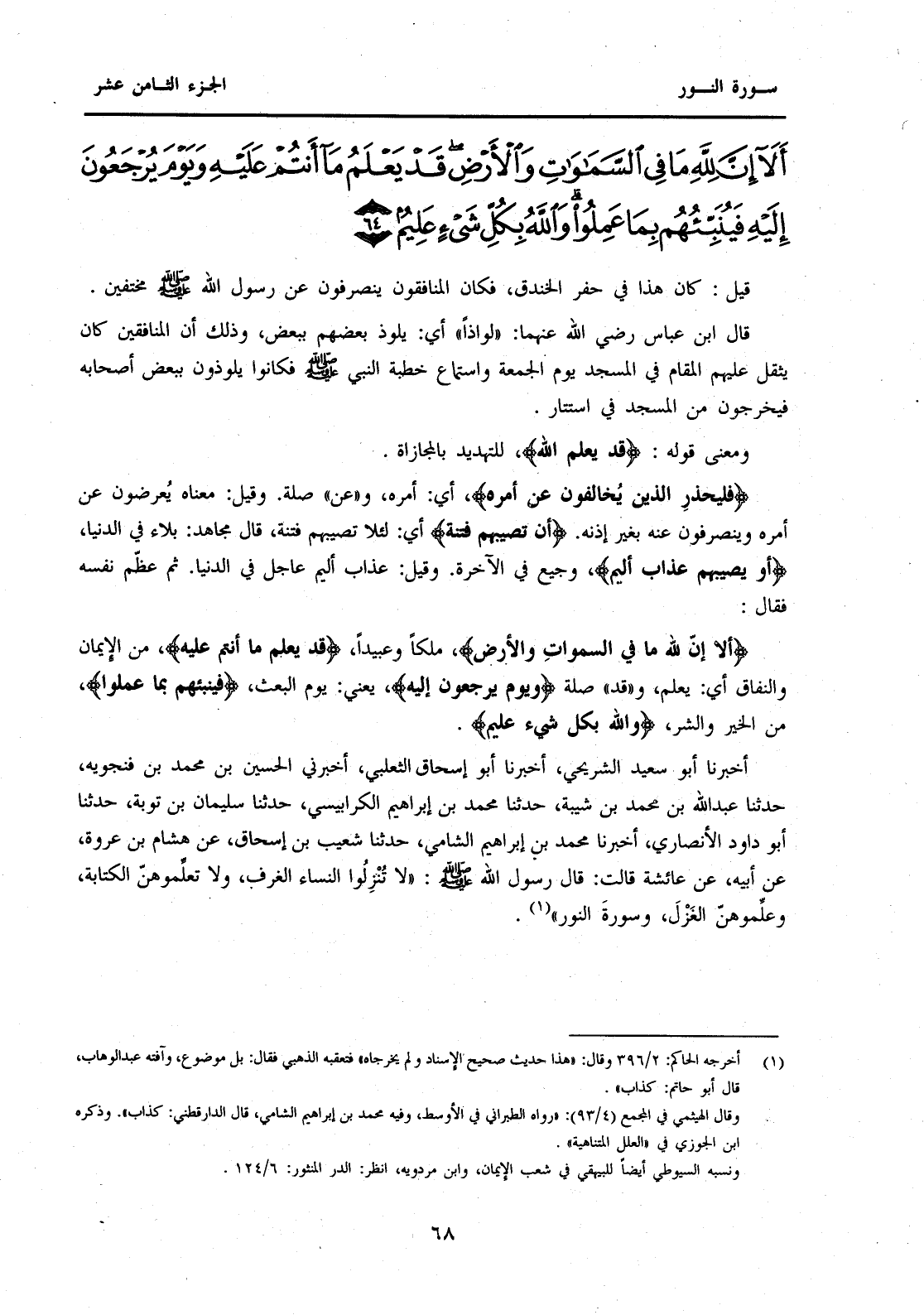 {أَلَا إِنَّ لِلَّهِ مَا فِي السَّمَوَاتِ وَالأرْضِ} مَلِكًا وَعَبِيدًا، {قَدْ يَعْلَمُ مَاأَنْتُمْ عَلَيْهِ} الْإِيمَانِ وَالنِّفَاقِ أَيْ: يَعْلَمُ، وَ"قَدْ" صِلَةٌ {وَيَوْمَ يُرْجَعُونَ إِلَيْهِ} يَعْنِي: يَوْمَ الْبَعْثِ، {فَيُنَبِّئُهُمْ بِمَا عَمِلُوا} الْخَيْرِ وَالشَّرِّ، {وَاللَّهُ بِكُلِّ شَيْءٍ عَلِيمٌ} أَخْبَرَنَا أَبُو سَعِيدٍ الشُّرَيْحِيُّ، أَخْبَرَنَا أَبُو إِسْحَاقَ الثَّعْلَبِيُّ، أَخْبَرَنِي الْحُسَيْنُ بْنُ مُحَمَّدِ بْنِ فَنْجَوَيْهِ، حَدَّثَنَا عَبْدُ اللَّهِ بْنُ مُحَمَّدِ بْنِ شَيْبَةَ، حَدَّثَنَا مُحَمَّدُ بْنُ إِبْرَاهِيمَ الْكَرَابِيسِيُّ، حَدَّثَنَا سُلَيْمَانُ بْنُ تَوْبَةَ، حَدَّثَنَا أَبُو دَاوُدَ الْأَنْصَارِيُّ، أَخْبَرَنَا مُحَمَّدُ بْنُ إِبْرَاهِيمَ الشَّامِيُّ، حَدَّثَنَا شُعَيْبُ بْنُ إِسْحَاقَ، عَنْ هِشَامِ بْنِ عُرْوَةَ، عَنْ أَبِيهِ، عَنْ عَائِشَةَ قَالَتْ: قَالَ رَسُولُ اللَّهِ صَلَّى اللَّهُ عَلَيْهِ وَسَلَّمَ: "لَا تُنْزِلُوا النِّسَاءَ الْغُرَفَ، وَلَا تُعَلِّمُوهُنَّ الْكِتَابَةَ، وَعَلِّمُوهُنَّ الْغَزْلَ، وَسُورَةَ النُّورِ" (1)