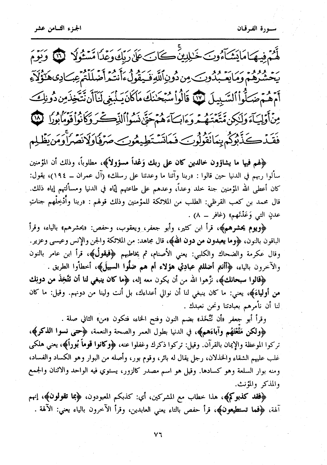 {لَهُمْ فِيهَا مَا يَشَاءُونَ خَالِدِينَ كَانَ عَلَى رَبِّكَ وَعْدًا مَسْئُولًا} مَطْلُوبًا، وَذَلِكَ أَنَّ الْمُؤْمِنِينَ سَأَلُوا رَبَّهُمْ فِي الدُّنْيَا حِينَ قَالُوا: "رَبَّنَا وَآتِنَا مَا وَعَدْتَنَا عَلَى رُسُلِكَ" (آلَ عِمْرَانَ-194) ، يَقُولُ: كَانَ أَعْطَى اللَّهُ الْمُؤْمِنِينَ جَنَّةَ خُلْدٍ وَعْدًا، وَعَدَهُمْ عَلَى طَاعَتِهِمْ إِيَّاهُ فِي الدُّنْيَا وَمَسْأَلَتُهُمْ إِيَّاهُ ذَلِكَ. قَالَ مُحَمَّدُ بْنُ كَعْبٍ الْقُرَظِيُّ: الطَّلَبُ مِنَ الْمَلَائِكَةِ لِلْمُؤْمِنِينَ وَذَلِكَ قَوْلُهُمْ: "رَبَّنَا وَأَدْخِلْهُمْ جَنَّاتِ عَدْنٍ الَّتِي وَعَدْتَهُمْ" (غَافِرِ-8) . {وَيَوْمَ يَحْشُرُهُمْ} قَرَأَ ابْنُ كَثِيرٍ، وَأَبُو جَعْفَرٍ، وَيَعْقُوبُ، وَحَفْصٌ: "يَحْشُرُهُمْ" بِالْيَاءِ، وَقَرَأَ الْبَاقُونَ بِالنُّونِ، {وَمَا يَعْبُدُونَ مِنْ دُونِ اللَّهِ} قَالَ مُجَاهِدٌ: مِنَ الْمَلَائِكَةِ وَالْجِنِّ وَالْإِنْسِ وَعِيسَى وَعُزَيْرٍ. وَقَالَ عِكْرِمَةُ وَالضَّحَّاكُ وَالْكَلْبِيُّ: يَعْنِي الْأَصْنَامَ، ثُمَّ يُخَاطِبُهُمْ {فَيَقُولُ} قَرَأَ ابْنُ عَامِرٍ بِالنُّونِ وَالْآخَرُونَ بِالْيَاءِ، {أَأَنْتُمْ أَضْلَلْتُمْ عِبَادِي هَؤُلَاءِ أَمْ هُمْ ضَلُّوا السَّبِيلَ} أَخْطَأُوا الطَّرِيقَ. {قَالُوا سُبْحَانَكَ} نَزَّهُوا اللَّهَ مِنْ أَنْ يَكُونَ مَعَهُ إِلَهٌ، {مَا كَانَ يَنْبَغِي لَنَا أَنْ نَتَّخِذَ مِنْ دُونِكَ مِنْ أَوْلِيَاءَ} يَعْنِي: مَا كَانَ يَنْبَغِي لَنَا أَنْ نُوَالِيَ أَعْدَاءَكَ، بَلْ أَنْتَ وَلِيُّنَا مِنْ دُونِهِمْ. وَقِيلَ: مَا كَانَ لَنَا أَنْ نَأْمُرَهُمْ بِعِبَادَتِنَا وَنَحْنُ نَعْبُدُكَ. وَقَرَأَ أَبُو جَعْفَرٍ "أَنْ نُتَّخَذَ" بِضَمِّ النُّونِ وَفَتْحِ الْخَاءِ، فَتَكُونُ "مِنْ" الثَّانِي صِلَةٌ. {وَلَكِنْ مَتَّعْتَهُمْ وَآبَاءَهُمْ} فِي الدُّنْيَا بِطُولِ الْعُمْرِ وَالصِّحَّةِ وَالنِّعْمَةِ، {حَتَّى نَسُوا الذِّكْرَ} تَرَكُوا الْمَوْعِظَةَ وَالْإِيمَانَ بِالْقُرْآنِ. وَقِيلَ: تَرَكُوا ذِكْرَكَ وَغَفَلُوا عَنْهُ، {وَكَانُوا قَوْمًا بُورًا} يَعْنِي هَلْكَى غَلَبَ عَلَيْهِمُ الشَّقَاءُ وَالْخِذْلَانُ، رَجُلٌ يُقَالُ لَهُ بَائِرٌ، وَقَوْمٌ بُورٌ، وَأَصْلُهُ مِنَ الْبَوَارِ وَهُوَ الْكَسَادُ وَالْفَسَادُ، وَمِنْهُ بَوَارُ السِّلْعَةِ وَهُوَ كَسَادُهَا. وَقِيلَ هُوَ اسْمُ مَصْدَرٍ كَالزُّورِ، يَسْتَوِي فِيهِ الْوَاحِدُ وَالِاثْنَانِ وَالْجَمْعُ وَالْمُذَكِّرُ وَالْمُؤَنَّثُ. {فَقَدْ كَذَّبُوكُمْ} هَذَا خِطَابٌ مَعَ الْمُشْرِكِينَ، أَيْ: كَذَّبَكُمُ الْمَعْبُودُونَ، {بِمَا تَقُولُونَ} إِنَّهُمْ آلِهَةٌ، {فَمَا تَسْتَطِيعُونَ} قَرَأَ حَفْصٌ بِالتَّاءِ يَعْنِي الْعَابِدِينَ، وَقَرَأَ الْآخَرُونَ بِالْيَاءِ يَعْنِي: الْآلِهَةُ.