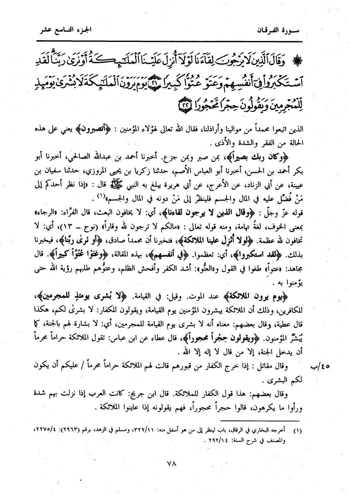 قَوْلُهُ عَزَّ وَجَلَّ: {وَقَالَ الَّذِينَ لَا يَرْجُونَ لِقَاءَنَا} أَيْ: لَا يَخَافُونَ الْبَعْثَ، قَالَ الْفَرَّاءُ: "الرَّجَاءُ" بِمَعْنَى الْخَوْفِ، لُغَةُ تِهَامَةَ، وَمِنْهُ قَوْلُهُ تَعَالَى: "مَا لَكُمْ لَا تَرْجُونَ لِلَّهِ وَقَارًا" (نُوحٍ-13) ، أَيْ: لَا تَخَافُونَ لِلَّهِ عَظَمَةً. {لَوْلَا أُنْزِلَ عَلَيْنَا الْمَلَائِكَةُ} فَتُخْبِرُنَا أَنَّ مُحَمَّدًا صَادِقٌ، {أَوْ نَرَى رَبَّنَا} فَيُخْبِرُنَا بِذَلِكَ. {لَقَدِ اسْتَكْبَرُوا} أَيْ: تَعَظَّمُوا. {فِي أَنْفُسِهِمْ} بِهَذِهِ الْمَقَالَةِ، {وَعَتَوْا عُتُوًّا كَبِيرًا} قَالَ مُجَاهِدٌ: "عَتَوْا" طَغَوْا فِي الْقَوْلِ وَ"الْعُتُّوُّ": أَشَدُّ الْكُفْرِ وَأَفْحَشُ الظُّلْمِ، وَعُتُوُّهُمْ طَلَبُهُمْ رُؤْيَةِ اللَّهِ حَتَّى يُؤْمِنُوا بِهِ. {يَوْمَ يَرَوْنَ الْمَلَائِكَةَ} عِنْدَ الْمَوْتِ. وَقِيلَ: فِي الْقِيَامَةِ. {لَا بُشْرَى يَوْمَئِذٍ لِلْمُجْرِمِينَ} لِلْكَافِرِينَ، وَذَلِكَ أَنَّ الْمَلَائِكَةَ يُبَشِّرُونَ الْمُؤْمِنِينَ يَوْمَ الْقِيَامَةِ، وَيَقُولُونَ لِلْكُفَّارِ: لَا بُشْرَى لَكُمْ، هَكَذَا قَالَ عَطِيَّةُ، وَقَالَ بَعْضُهُمْ: مَعْنَاهُ أَنَّهُ لَا بُشْرَى يَوْمَ الْقِيَامَةِ لِلْمُجْرِمِينَ، أَيْ: لَا بِشَارَةَ لَهُمْ بِالْجَنَّةِ، كَمَا يُبَشَّرُ الْمُؤْمِنُونَ. {وَيَقُولُونَ حِجْرًا مَحْجُورًا} قَالَ عَطَاءٌ عَنِ ابْنِ عَبَّاسٍ: تَقُولُ الْمَلَائِكَةُ حَرَامًا مُحَرَّمًا أَنْ يَدْخُلَ الْجَنَّةَ، إِلَّا مَنْ قَالَ لَا إِلَهَ إِلَّا اللَّهَ. وَقَالَ مُقَاتِلٌ: إِذَا خَرَجَ الْكُفَّارُ مِنْ قُبُورِهِمْ قَالَتْ لَهُمُ الْمَلَائِكَةُ حرامًا محرمًا 45/ب عَلَيْكُمْ أَنْ يَكُونَ لَكُمُ الْبُشْرَى. وَقَالَ بَعْضُهُمْ: هَذَا قَوْلُ الْكُفَّارِ لِلْمَلَائِكَةِ. قَالَ ابْنُ جُرَيْجٍ: كَانَتِ الْعَرَبُ إِذَا نَزَلَتْ بِهِمْ شِدَّةٌ رَأَوْا مَا يَكْرَهُونَ، قَالُوا حِجْرًا مَحْجُورًا، فَهُمْ يقولونه إذا عينوا الْمَلَائِكَةَ.
