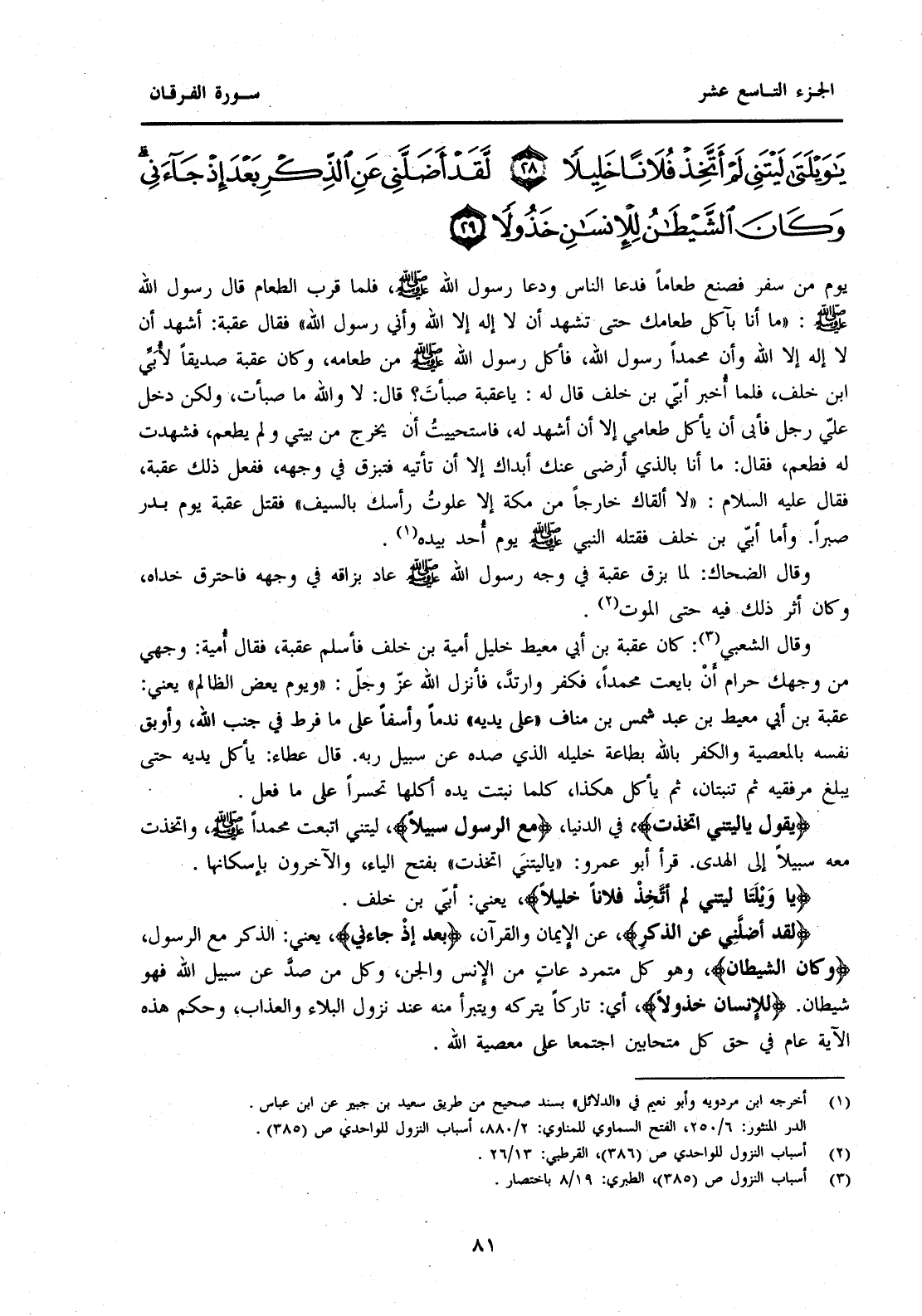 {يَا وَيْلَتَى لَيْتَنِي لَمْ أَتَّخِذْ فُلَانًا خَلِيلًا} يَعْنِي: أُبَيَّ بْنَ خَلَفٍ. {لَقَدْ أَضَلَّنِي عَنِ الذِّكْرِ} عَنِ الْإِيمَانِ وَالْقُرْآنِ، {بَعْدَ إِذْ جَاءَنِي} يَعْنِي: الذَّكَرَ مَعَ الرَّسُولِ، {وَكَانَ الشَّيْطَانُ} وَهُوَ كُلُّ مُتَمَرِّدٍ عَاتٍ مِنَ الْإِنْسِ وَالْجِنِّ، وَكُلُّ مَنْ صَدَّ عَنْ سَبِيلِ اللَّهِ فَهُوَ شَيْطَانٌ. {لِلْإِنْسَانِ خَذُولًا} أَيْ: تَارِكًا يَتْرُكُهُ وَيَتَبَرَّأُ مِنْهُ عِنْدَ نُزُولِ الْبَلَاءِ وَالْعَذَابِ، وَحُكْمُ هَذِهِ الْآيَةِ عَامٌ فِي حَقِّ كُلِّ مُتَحَابِّينَ اجْتَمَعَا عَلَى مَعْصِيَةِ اللَّهِ.