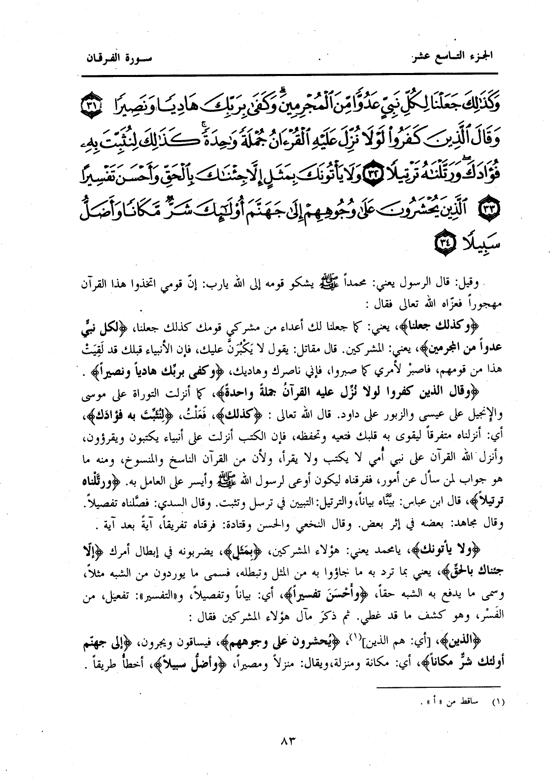 {وَكَذَلِكَ جَعَلْنَا} يَعْنِي: كَمَا جَعَلَنَا لَكَ أَعْدَاءً مِنْ مُشْرِكِي قَوْمِكَ كَذَلِكَ جَعْلَنَا، {لِكُلِّ نَبِيٍّ عَدُوًّا مِنَ الْمُجْرِمِينَ} يَعْنِي: الْمُشْرِكِينَ. قَالَ مُقَاتِلٌ: يَقُولُ لَا يَكْبُرَنَّ عَلَيْكَ، فَإِنَّ الْأَنْبِيَاءَ قَبْلَكَ قَدْ لَقِيَتْ هَذَا مِنْ قَوْمِهِمْ، فَاصْبِرْ لِأَمْرِي كَمَا صَبَرُوا، فَإِنِّي نَاصِرُكَ وَهَادِيكَ، {وَكَفَى بِرَبِّكَ هَادِيًا وَنَصِيرًا} {وَقَالَ الَّذِينَ كَفَرُوا لَوْلَا نُزِّلَ عَلَيْهِ الْقُرْآنُ جُمْلَةً وَاحِدَةً} كَمَا أُنْزِلَتِ التَّوْرَاةُ عَلَى مُوسَى وَالْإِنْجِيلُ عَلَى عِيسَى وَالزَّبُورُ عَلَى دَاوُدَ. قَالَ اللَّهُ تَعَالَى: {كَذَلِكَ} فَعَلْتُ، {لِنُثَبِّتَ بِهِ فُؤَادَكَ} أَيْ: أَنْزَلْنَاهُ مُتَفَرِّقًا لِيَقْوَى بِهِ قَلْبُكَ فَتَعِيهِ وَتَحْفَظَهُ، فَإِنَّ الْكُتُبَ أُنْزِلَتْ عَلَى الْأَنْبِيَاءِ يَكْتُبُونَ وَيَقْرَءُونَ، وَأَنْزَلَ اللَّهُ الْقُرْآنَ عَلَى نَبِيٍّ أُمِّيٍّ لَا يَكْتُبُ وَلَا يَقْرَأُ، وَلِأَنَّ مِنَ الْقُرْآنِ النَّاسِخَ وَالْمَنْسُوخَ، وَمِنْهُ مَا هُوَ جَوَابٌ لِمَنْ سَأَلَ عَنْ أُمُورٍ، فَفَرَّقْنَاهُ لِيَكُونَ أَوْعَى لِرَسُولِ اللَّهِ صَلَّى اللَّهُ عَلَيْهِ وَسَلَّمَ وَأَيْسَرَ عَلَى الْعَامِلِ بِهِ. {وَرَتَّلْنَاهُ تَرْتِيلًا} قَالَ ابْنُ عَبَّاسٍ: بَيَّنَّاهُ بَيَانًا، وَالتَّرْتِيلُ: التَّبْيِينُ فِي تَرَسُّلٍ وَتَثَبُّتٍ. وَقَالَ السُّدِّيُّ: فَصَّلْنَاهُ تَفْصِيلًا. وَقَالَ مُجَاهِدٌ: بَعْضُهُ فِي إِثْرِ بَعْضٍ. وَقَالَ النَّخَعِيُّ وَالْحُسْنُ وَقَتَادَةُ: فَرَّقْنَاهُ تَفْرِيقًا، آيَةً بَعْدَ آيَةٍ. {وَلَا يَأْتُونَكَ} يَا مُحَمَّدُ يَعْنِي: هَؤُلَاءِ الْمُشْرِكِينَ، {بِمَثَلٍ} يَضْرِبُونَهُ فِي إِبْطَالِ أَمْرِكَ {إِلَّا جِئْنَاكَ بِالْحَقِّ} يَعْنِي بِمَا تَرُدُّ بِهِ مَا جَاءُوا بِهِ مِنَ الْمَثَلِ وَتُبْطِلُهُ، فَسُمِّيَ مَا يُورِدُونَ مِنَ الشُّبَهِ مَثَلًا وَسُمِّي مَا يَدْفَعُ بِهِ الشُّبَهَ حَقًّا، {وَأَحْسَنَ تَفْسِيرًا} أَيْ: بَيَانًا وَتَفْصِيلًا وَ"التَّفْسِيرُ": تَفْعِيلٌ، مِنَ الْفَسْرِ، وَهُوَ كَشْفُ مَا قَدْ غُطِّيَ. ثُمَّ ذَكَرَ مَآلَ هَؤُلَاءِ الْمُشْرِكِينَ فَقَالَ: {الَّذِينَ} [أَيْ: هُمُ الَّذِينَ] (1) {يُحْشَرُونَ عَلَى وُجُوهِهِمْ} فَيُسَاقُونَ وَيُجَرُّونَ، {إِلَى جَهَنَّمَ أُولَئِكَ شَرٌّ مَكَانًا} أَيْ: مَكَانَةً وَمَنْزِلَةً، وَيُقَالُ: مَنْزِلًا وَمَصِيرًا، {وَأَضَلُّ سَبِيلًا} أَخْطَأُ طَرِيقًا.