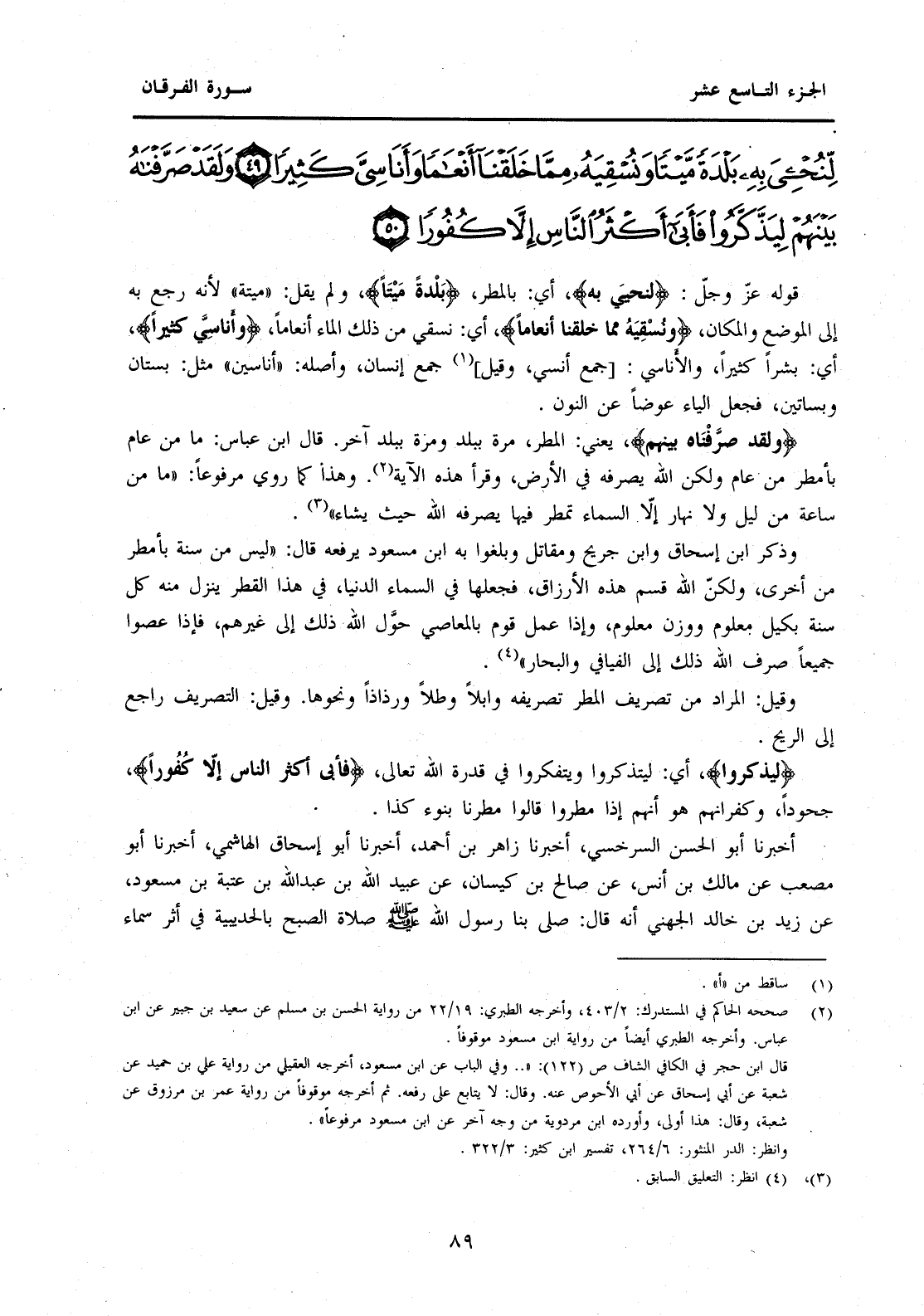 قَوْلُهُ عَزَّ وَجَلَّ: {لِنُحْيِيَ بِهِ} أَيْ: بِالْمَطَرِ، {بَلْدَةً مَيْتًا} وَلَمْ يَقُلْ: "مَيِّتَةً" لِأَنَّهُ رَجَعَ بِهِ إِلَى الْمَوْضِعِ وَالْمَكَانِ، {وَنُسْقِيَهُ مِمَّا خَلَقْنَا أَنْعَامًا} أَيْ: نُسْقِي مِنْ ذَلِكَ الْمَاءِ أَنْعَامًا، {وَأَنَاسِيَّ كَثِيرًا} أَيْ: بَشَرًا كَثِيرًا، وَالْأَنَاسِيُّ: [جَمْعُ أُنْسِيُّ، وَقِيلَ] (1) جَمَعُ إِنْسَانٍ، وَأَصْلُهُ: "أَنَاسِينُ" مِثْلُ: بُسْتَانٍ وَبَسَاتِينٍ، فَجَعَلَ الْيَاءَ عِوَضًا عَنِ النُّونِ. {وَلَقَدْ صَرَّفْنَاهُ بَيْنَهُمْ} يَعْنِي: الْمَطَرَ، مَرَّةً بِبَلْدَةٍ وَمَرَّةً بِبَلَدٍ آخَرٍ. قَالَ ابْنُ عَبَّاسٍ: مَا مِنْ عَامٍ بِأَمْطَرَ مِنْ عَامٍ وَلَكِنَّ اللَّهَ يُصَرِفُّهُ فِي الْأَرْضِ، وَقَرَأَ هَذِهِ الْآيَةَ (2) . وَهَذَا كَمَا رُوِيَ مَرْفُوعًا: "مَا مِنْ سَاعَةٍ مِنْ لَيْلٍ وَلَا نَهَارٍ إِلَّا السَّمَاءُ تُمْطِرُ فِيهَا يُصَرِّفُهُ اللَّهُ حَيْثُ يَشَاءُ" (3) .