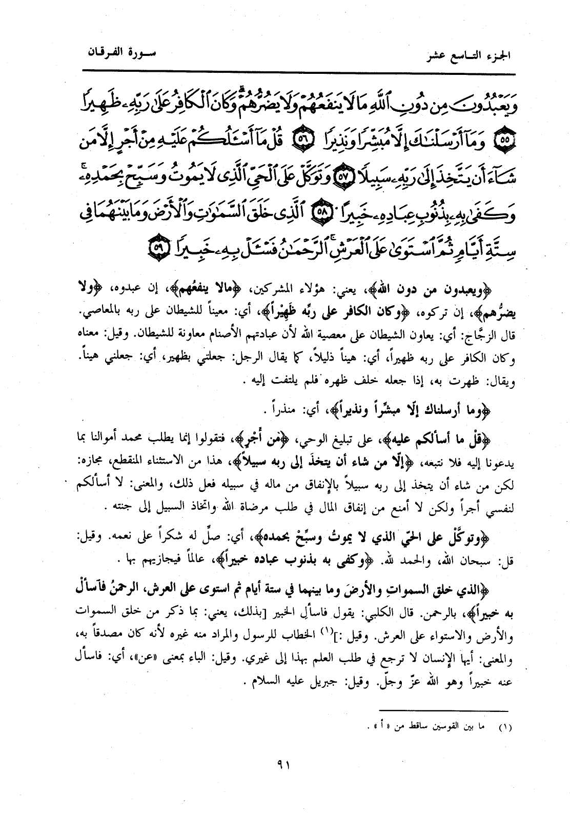 {وَيَعْبُدُونَ مِنْ دُونِ اللَّهِ} يَعْنِي: هَؤُلَاءِ الْمُشْرِكِينَ، {مَا لَا يَنْفَعُهُمْ} إِنْ عَبَدُوهُ، {وَلَا يَضُرُّهُمْ} إِنْ تَرَكُوهُ، {وَكَانَ الْكَافِرُ عَلَى رَبِّهِ ظَهِيرًا} أَيْ: مُعِينًا لِلشَّيْطَانِ عَلَى رَبِّهِ بِالْمَعَاصِي. قَالَ الزَّجَّاجُ: أَيْ: يُعَاوِنُ الشَّيْطَانُ عَلَى مَعْصِيَةِ اللَّهِ لِأَنَّ عِبَادَتَهُمُ الْأَصْنَامَ مُعَاوَنَةٌ لِلشَّيْطَانِ. وَقِيلَ: مَعْنَاهُ وَكَانَ الْكَافِرُ عَلَى رَبِّهِ ظَهِيرًا، أَيْ: هَيِّنًا ذَلِيلًا كَمَا يُقَالُ الرَّجُلُ: جَعَلَنِي بِظَهِيرٍ، أَيْ: جَعَلَنِي هَيِّنًا. وَيُقَالُ: ظَهِرْتُ بِهِ، إِذَا جَعَلَهُ خَلْفَ ظَهْرِهِ فَلَمْ يَلْتَفِتْ إِلَيْهِ. {وَمَا أَرْسَلْنَاكَ إِلَّا مُبَشِّرًا وَنَذِيرًا} أَيْ: مُنْذِرًا. {قُلْ مَا أَسْأَلُكُمْ عَلَيْهِ} عَلَى تَبْلِيغِ الْوَحْيِ، {مِنْ أَجْرٍ} فَتَقُولُوا إِنَّمَا يَطْلُبُ مُحَمَّدٌ أَمْوَالُنَا بِمَا يَدْعُونَا إِلَيْهِ فَلَا نَتَّبِعُهُ، {إِلَّا مَنْ شَاءَ أَنْ يَتَّخِذَ إِلَى رَبِّهِ سَبِيلًا} هَذَا مِنَ الِاسْتِثْنَاءِ الْمُنْقَطِعِ، مَجَازُهُ: لَكِنْ مَنْ شَاءَ أَنْ يَتَّخِذَ إِلَى رَبِّهِ سَبِيلًا بِالْإِنْفَاقِ مِنْ مَالِهِ فِي سَبِيلِهِ فَعَلَ ذَلِكَ، وَالْمَعْنَى: لَا أَسْأَلُكُمْ لِنَفْسِي أَجْرًا وَلَكِنْ لَا أَمْنَعُ مِنْ إِنْفَاقِ الْمَالِ فِي طَلَبِ مَرْضَاةِ اللَّهِ وَاتِّخَاذِ السَّبِيلِ إِلَى جَنَّتِهِ. {وَتَوَكَّلْ عَلَى الْحَيِّ الَّذِي لَا يَمُوتُ وَسَبِّحْ بِحَمْدِهِ} أَيْ: صَلِّ لَهُ شُكْرًا عَلَى نِعَمِهِ. وَقِيلَ: قُلْ: سُبْحَانَ اللَّهِ، وَالْحَمْدُ لِلَّهِ. {وَكَفَى بِهِ بِذُنُوبِ عِبَادِهِ خَبِيرًا} عَالِمًا فَيُجَازِيهِمْ بِهَا. {الَّذِي خَلَقَ السَّمَوَاتِ وَالْأَرْضَ وَمَا بَيْنَهُمَا فِي سِتَّةِ أَيَّامٍ ثُمَّ اسْتَوَى عَلَى الْعَرْشِ الرَّحْمَنُ فَاسْأَلْ بِهِ خَبِيرًا} بِالرَّحْمَنِ. قَالَ الْكَلْبِيُّ: يَقُولُ فَاسْأَلِ الْخَبِيرَ [بِذَلِكَ، يَعْنِي: بِمَا ذَكَرَ من خلق السموات وَالْأَرْضِ وَالِاسْتِوَاءِ عَلَى الْعَرْشِ. وَقِيلَ:] (1) الْخِطَابُ لِلرَّسُولِ وَالْمُرَادُ مِنْهُ غَيْرُهُ لِأَنَّهُ كَانَ مُصَدِّقًا بِهِ، وَالْمَعْنَى: أَيُّهَا الإنسان لا ترجح فِي طَلَبِ الْعِلْمِ بِهَذَا إِلَى غَيْرِي. وَقِيلَ: الْبَاءُ بِمَعْنَى "عَنْ"، أَيْ: فَاسْأَلْ عَنْهُ خَبِيرًا وَهُوَ اللَّهُ عَزَّ وَجَلَّ. وَقِيلَ: جِبْرِيلُ عَلَيْهِ السَّلَامُ.