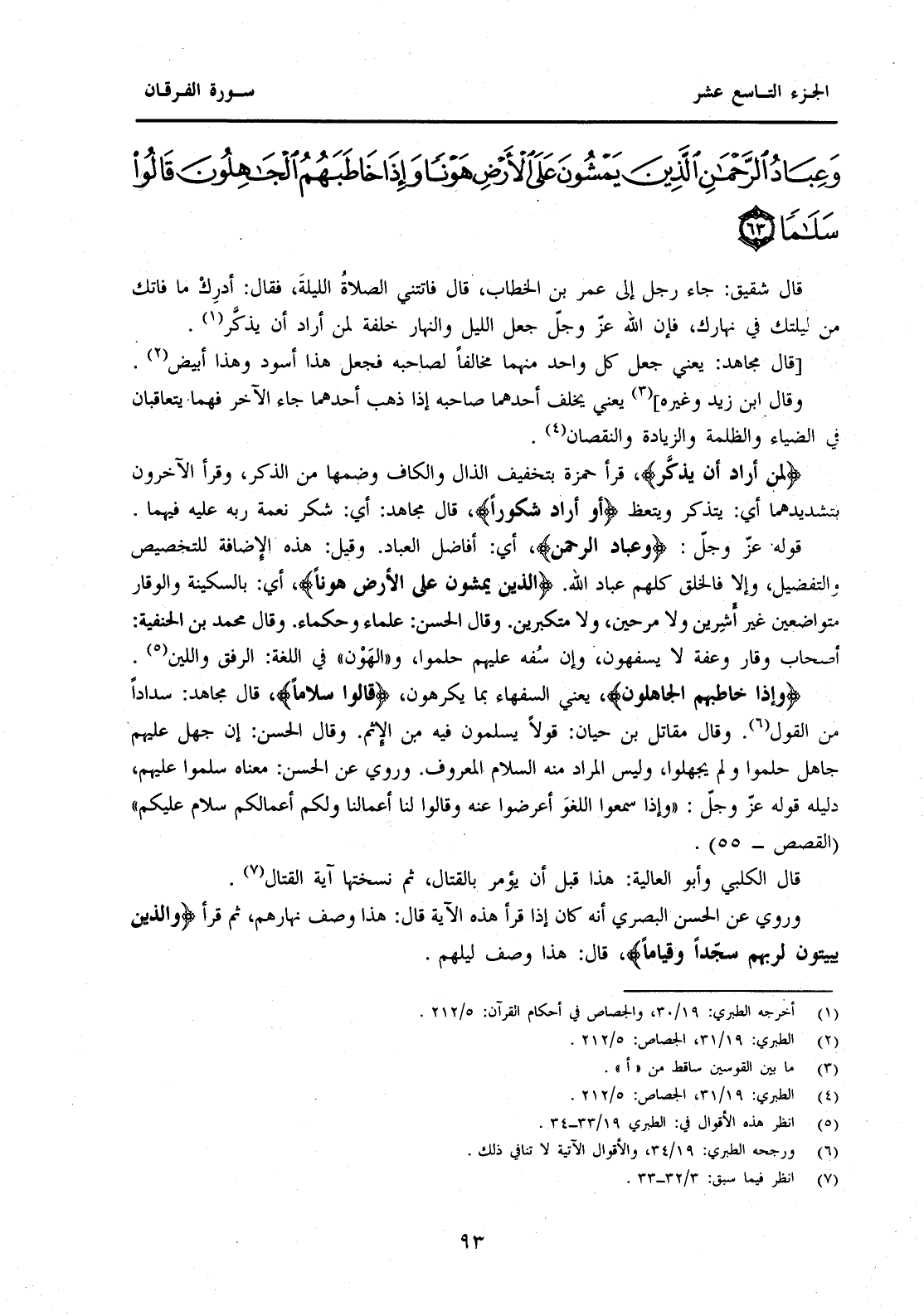 قَوْلُهُ عَزَّ وَجَلَّ: {وَعِبَادُ الرَّحْمَنِ} أَيْ: أَفَاضِلُ الْعِبَادِ. وَقِيلَ: هَذِهِ الْإِضَافَةُ لِلتَّخْصِيصِ وَالتَّفْضِيلِ، وَإِلَّا فَالْخَلْقُ كُلُّهُمْ عِبَادُ اللَّهِ. {الَّذِينَ يَمْشُونَ عَلَى الْأَرْضِ هَوْنًا} أَيْ: بِالسَّكِينَةِ وَالْوَقَارِ مُتَوَاضِعِينَ غَيْرَ أَشِرِينَ وَلَا مَرِحِينَ، وَلَا مُتَكَبِّرِينَ. وَقَالَ الْحَسَنُ: عُلَمَاءٌ وَحُكَمَاءٌ. وَقَالَ مُحَمَّدُ بْنُ الْحَنَفِيَّةِ: أَصْحَابُ وَقَارٍ وَعِفَّةٍ لَا يُسَفِّهُونَ، وَإِنْ سُفِّهَ عَلَيْهِمْ حَلُمُوا، وَ"الْهَوْنُ" فِي اللُّغَةِ: والرفق وَاللِّينُ (5) . {وَإِذَا خَاطَبَهُمُ الْجَاهِلُونَ} يَعْنِي السُّفَهَاءُ بِمَا يَكْرَهُونَ، {قَالُوا سَلَامًا} قَالَ مُجَاهِدٌ: سَدَادًا مِنَ الْقَوْلِ (6) . وَقَالَ مُقَاتِلُ بْنُ حَيَّانَ: قُولًا يَسْلَمُونَ فِيهِ مِنَ الْإِثْمِ. وَقَالَ الْحَسَنُ: إِنْ جَهَلَ عَلَيْهِمْ جَاهِلٌ حَلُمُوا وَلَمْ يَجْهَلُوا، وَلَيْسَ الْمُرَادُ مِنْهُ السَّلَامُ الْمَعْرُوفُ. وَرُوِيَ عَنِ الْحَسَنِ: مَعْنَاهُ سَلَّمُوا عَلَيْهِمْ، دَلِيلُهُ قَوْلُهُ عَزَّ وَجَلَّ: "وَإِذَا سَمِعُوا اللَّغْوَ أَعْرَضُوا عَنْهُ وَقَالُوا لَنَا أَعْمَالُنَا وَلَكُمْ أَعْمَالُكُمْ سَلَامٌ عَلَيْكُمْ" (الْقَصَصِ-55) . قَالَ الْكَلْبِيُّ وَأَبُو الْعَالِيَةِ: هَذَا قَبْلَ أَنْ يُؤْمَرَ بِالْقِتَالِ، ثُمَّ نَسَخَتْهَا آيَةُ الْقِتَالِ (7) . وَرُوِيَ عَنِ الْحَسَنِ الْبَصْرِيِّ أَنَّهُ كَانَ إِذَا قَرَأَ هَذِهِ الْآيَةَ قَالَ: هَذَا وَصْفُ نَهَارِهِمْ، ثُمَّ قَرَأَ {وَالَّذِينَ يَبِيتُونَ لِرَبِّهِمْ سُجَّدًا وَقِيَامًا} قَالَ: هَذَا وَصْفُ لَيْلِهِمْ.