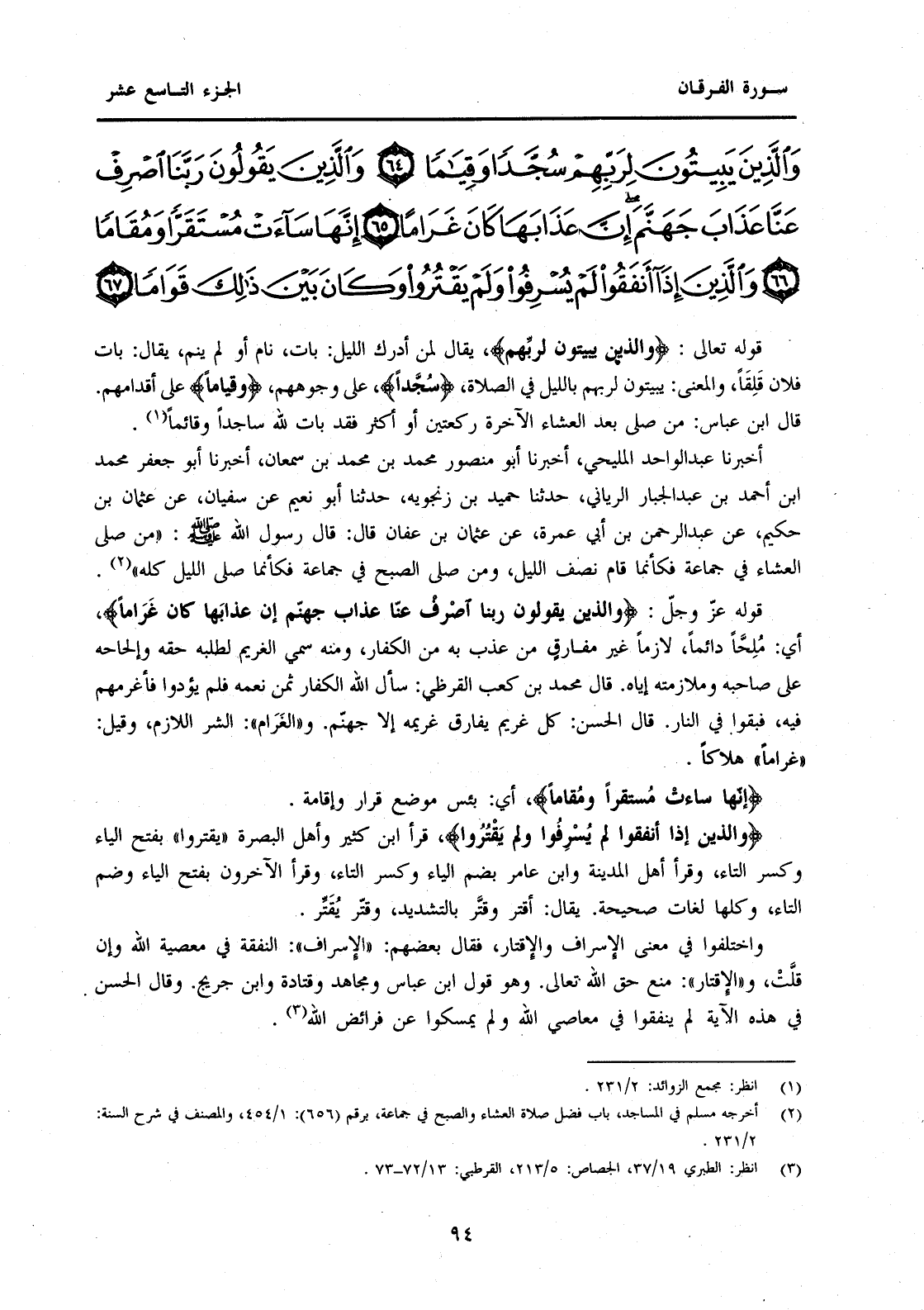 قَوْلُهُ تَعَالَى: {وَالَّذِينَ يَبِيتُونَ لِرَبِّهِمْ} يُقَالُ لِمَنْ أَدْرَكَ اللَّيْلَ: بَاتَ، نَامَ أَوْ لَمْ يَنَمْ، يُقَالُ: بَاتَ فُلَانٌ قَلِقًا، وَالْمَعْنَى: يَبِيتُونَ لِرَبِّهِمْ بِاللَّيْلِ فِي الصَّلَاةِ، {سُجَّدًا} عَلَى وُجُوهِهِمْ، {وَقِيَامًا} عَلَى أَقْدَامِهِمْ. قَالَ ابْنُ عَبَّاسٍ: مَنْ صَلَّى بَعْدَ الْعِشَاءِ الْآخِرَةِ رَكْعَتَيْنِ أَوْ أَكْثَرَ فَقَدْ بَاتَ لِلَّهِ سَاجِدًا وَقَائِمًا (1) . أَخْبَرَنَا عَبْدُ الْوَاحِدِ الْمَلِيحِيُّ، أَخْبَرَنَا أَبُو مَنْصُورِ مُحَمَّدُ بْنُ مُحَمَّدِ بْنِ سَمْعَانَ، أَخْبَرَنَا أَبُو جَعْفَرَ مُحَمَّدُ بْنُ أَحْمَدَ بْنِ عَبْدِ الْجَبَّارِ الرَّيَّانِيُّ، حَدَّثَنَا حُمَيْدُ بْنُ زَنْجَوَيْهِ، حَدَّثَنَا أَبُو نُعَيْمٍ عَنْ سُفْيَانَ، عَنْ عُثْمَانَ بْنِ حَكِيمٍ، عَنْ عَبْدِ الرَّحْمَنِ بْنِ أَبِي عَمْرَةَ، عَنْ عُثْمَانَ بْنِ عَفَّانَ قَالَ: قَالَ رَسُولُ اللَّهِ صَلَّى اللَّهُ عَلَيْهِ وَسَلَّمَ: "مَنْ صَلَّى الْعِشَاءَ فِي جَمَاعَةٍ فَكَأَنَّمَا قَامَ نِصْفَ اللَّيْلِ، وَمَنْ صَلَّى الصُّبْحَ فِي جَمَاعَةٍ فَكَأَنَّمَا صَلَّى اللَّيْلَ كُلَّهُ" (2) قَوْلُهُ عَزَّ وَجَلَّ: {وَالَّذِينَ يَقُولُونَ رَبَّنَا اصْرِفْ عَنَّا عَذَابَ جَهَنَّمَ إِنَّ عَذَابَهَا كَانَ غَرَامًا} أَيْ: مُلِحًّا دَائِمًا، لَازِمًا غَيْرَ مُفَارِقٍ مَنْ عُذِّبَ بِهِ مِنَ الْكُفَّارِ، وَمِنْهُ سُمِّي الْغَرِيمُ لِطَلَبِهِ حَقَّهُ وَإِلْحَاحِهِ عَلَى صَاحِبِهِ وَمُلَازَمَتِهِ إِيَّاهُ. قَالَ مُحَمَّدُ بْنُ كَعْبٍ الْقُرَظِيُّ: سَأَلَ اللَّهُ الْكُفَّارَ ثَمَنَ نِعَمِهِ فَلَمْ يُؤَدُّوا فَأَغْرَمَهُمْ فِيهِ، فَبَقُوا فِي النَّارِ. قَالَ الْحَسَنُ: كُلُّ غَرِيمٍ يُفَارِقُ غَرِيمَهُ إِلَّا جَهَنَّمَ. وَ"الْغَرَامُ": الشَّرُّ اللَّازِمُ، وَقِيلَ: "غَرَامًا" هَلَاكًا. {إِنَّهَا سَاءَتْ مُسْتَقَرًّا وَمُقَامًا} أَيْ: بِئْسَ مَوْضِعُ قَرَارٍ وَإِقَامَةٍ. {وَالَّذِينَ إِذَا أَنْفَقُوا لَمْ يُسْرِفُوا وَلَمْ يَقْتُرُوا} قَرَأَ ابْنُ كَثِيرٍ وَأَهْلُ الْبَصْرَةِ "يَقَتِّرُوا" بِفَتْحِ الْيَاءِ وَكَسْرِ التَّاءِ، وَقَرَأَ أَهْلُ الْمَدِينَةِ وَابْنُ عَامِرٍ بِضَمِّ الْيَاءِ وَكَسْرِ التَّاءِ، وَقَرَأَ الْآخَرُونَ بِفَتْحِ الْيَاءِ وَضَمِّ التاء، وكلها بلغات صَحِيحَةٌ. يُقَالُ: أُقَتِّرُ وَقَتَّرَ بِالتَّشْدِيدِ، وَقَتَّرَ يُقَتِّرُ. وَاخْتَلَفُوا فِي مَعْنَى الْإِسْرَافِ وَالْإِقْتَارِ، فَقَالَ بَعْضُهُمْ: "الْإِسْرَافُ": النَّفَقَةُ فِي مَعْصِيَةِ اللَّهِ وَإِنْ قَلَّتْ، وَ"الْإِقْتَارُ": مَنَعُ حَقِّ اللَّهِ تَعَالَى. وَهُوَ قَوْلُ ابْنِ عَبَّاسٍ وَمُجَاهِدٍ وَقَتَادَةَ وَابْنِ جُرَيْجٍ. وَقَالَ الْحَسَنُ فِي هَذِهِ الْآيَةِ لَمْ يُنْفِقُوا فِي مَعَاصِي اللَّهِ وَلَمْ يُمْسِكُوا عَنْ فَرَائِضِ اللَّهِ (3) .