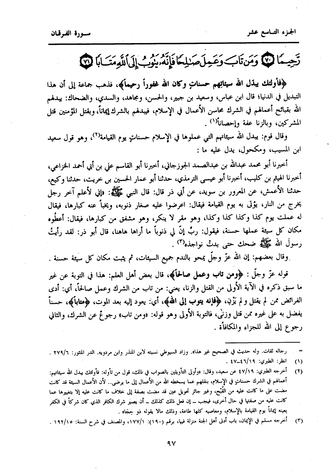 (2) أخرجه الطبري: 19 / 47 عن سعيد، وقال: "وأولى التأويلين بالصواب في ذلك، قول من تأوله: فأولئك يبدل الله سيئاتهم: أعمالهم في الشرك حسنات في الإسلام، بنقلهم عما يسخطه الله من الأعمال إلى ما يرضى.. لأن الأعمال السيئة قد كانت مضت على ما كانت عليه من القبح، وغير جائز تحويل عين قد مضت بصفة إلى خلاف ما كانت عليه إلا بتغييرها عما كانت عليه من صفتها في حال أخرى، فيجب -إن فعل ذلك كذلك- أن يصير شرك الكافر الذي كان شركا في الكفر بعينه إيمانا يوم القيامة بالإسلام، ومعاصيه كلها طاعة، وذلك ما لا يقوله ذو حجا".