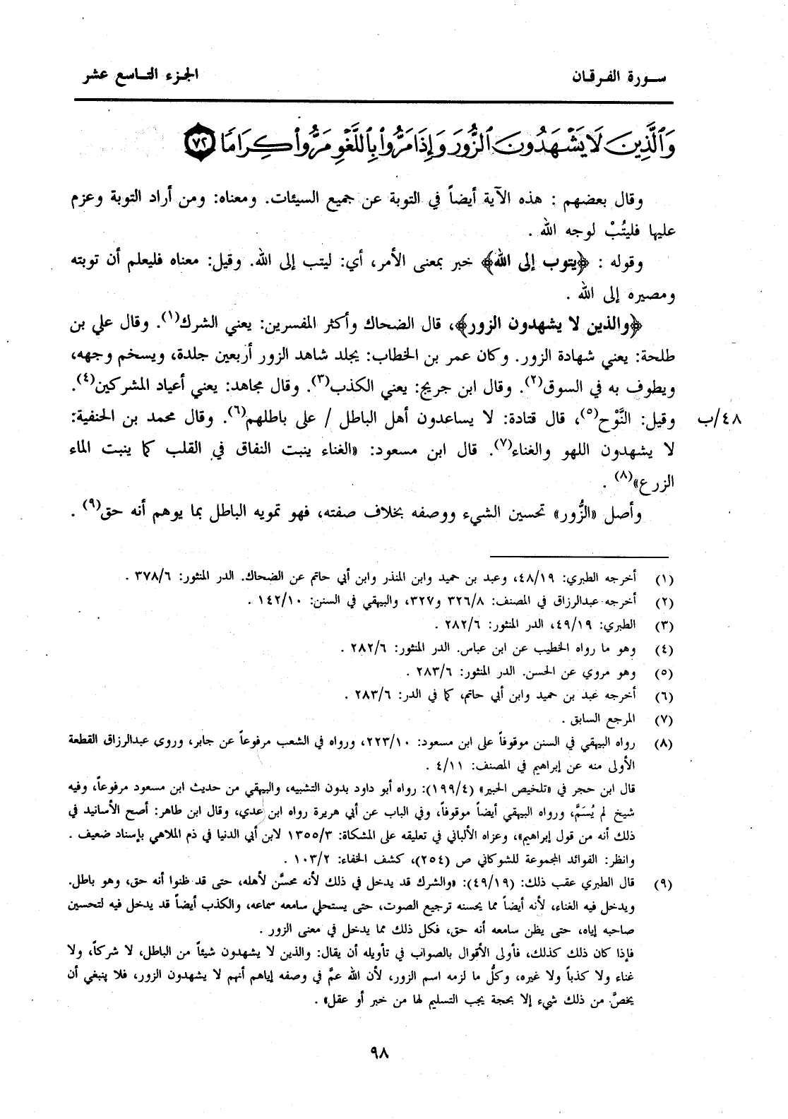 (9) قال الطبري عقب ذلك: (19 / 49) : "والشرك قد يدخل في ذلك لأنه محسن لأهله، حتى قد ظنوا أنه حق، وهو باطل. ويدخل فيه الغناء، لأنه أيضا مما يحسنه ترجيع الصوت، حتى يستحلي سامعه سماعه، والكذب أيضا قد يدخل فيه لتحسين صاحبه إياه، حتى يظن سامعه أنه حق، فكل ذلك مما يدخل في معنى الزور. فإذا كان ذلك كذلك، فأولى الأقوال بالصواب في تأويله أن يقال: والذين لا يشهدون شيئا من الباطل، لا شركا، ولا غناء ولا كذبا ولا غيره، وكل ما لزمه اسم الزور، لأن الله عم في وصفه إياهم أنهم لا يشهدون الزور، فلا ينبغي أن يخص من ذلك شيء إلا بحجة يجب التسليم لها من خبر أو عقل".