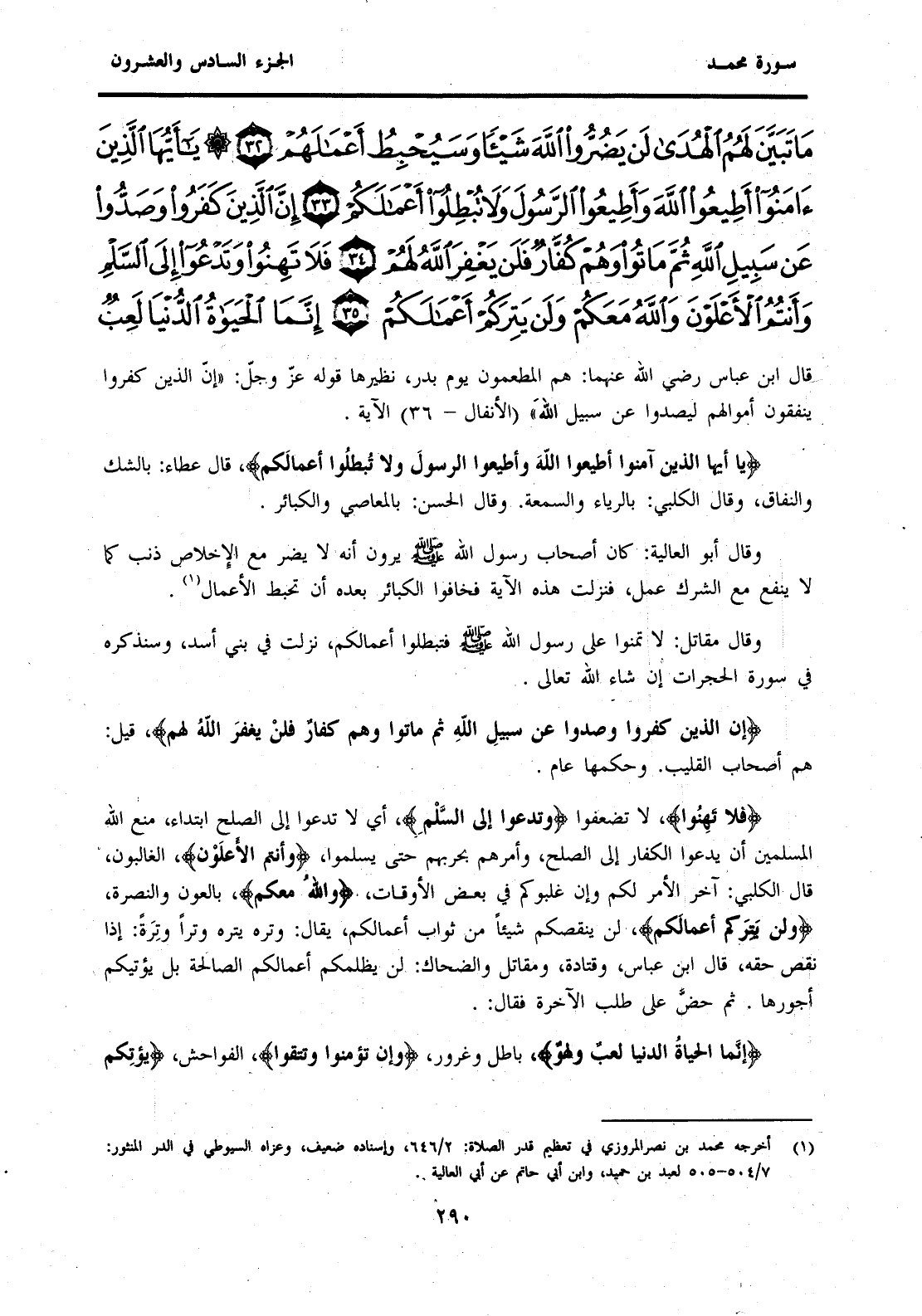 {يَا أَيُّهَا الَّذِينَ آمَنُوا أَطِيعُوا اللَّهَ وَأَطِيعُوا الرَّسُولَ وَلَا تُبْطِلُوا أَعْمَالَكُمْ (33) إِنَّ الَّذِينَ كَفَرُوا وَصَدُّوا عَنْ سَبِيلِ اللَّهِ ثُمَّ مَاتُوا وَهُمْ كُفَّارٌ فَلَنْ يَغْفِرَ اللَّهُ لَهُمْ (34) فَلَا تَهِنُوا وَتَدْعُوا إِلَى السَّلْمِ وَأَنْتُمُ الْأَعْلَوْنَ وَاللَّهُ مَعَكُمْ وَلَنْ يَتِرَكُمْ أَعْمَالَكُمْ (35) إِنَّمَا الْحَيَاةُ الدُّنْيَا لَعِبٌ وَلَهْوٌ وَإِنْ تُؤْمِنُوا وَتَتَّقُوا يُؤْتِكُمْ أُجُورَكُمْ وَلَا يَسْأَلْكُمْ أَمْوَالَكُمْ (36) }