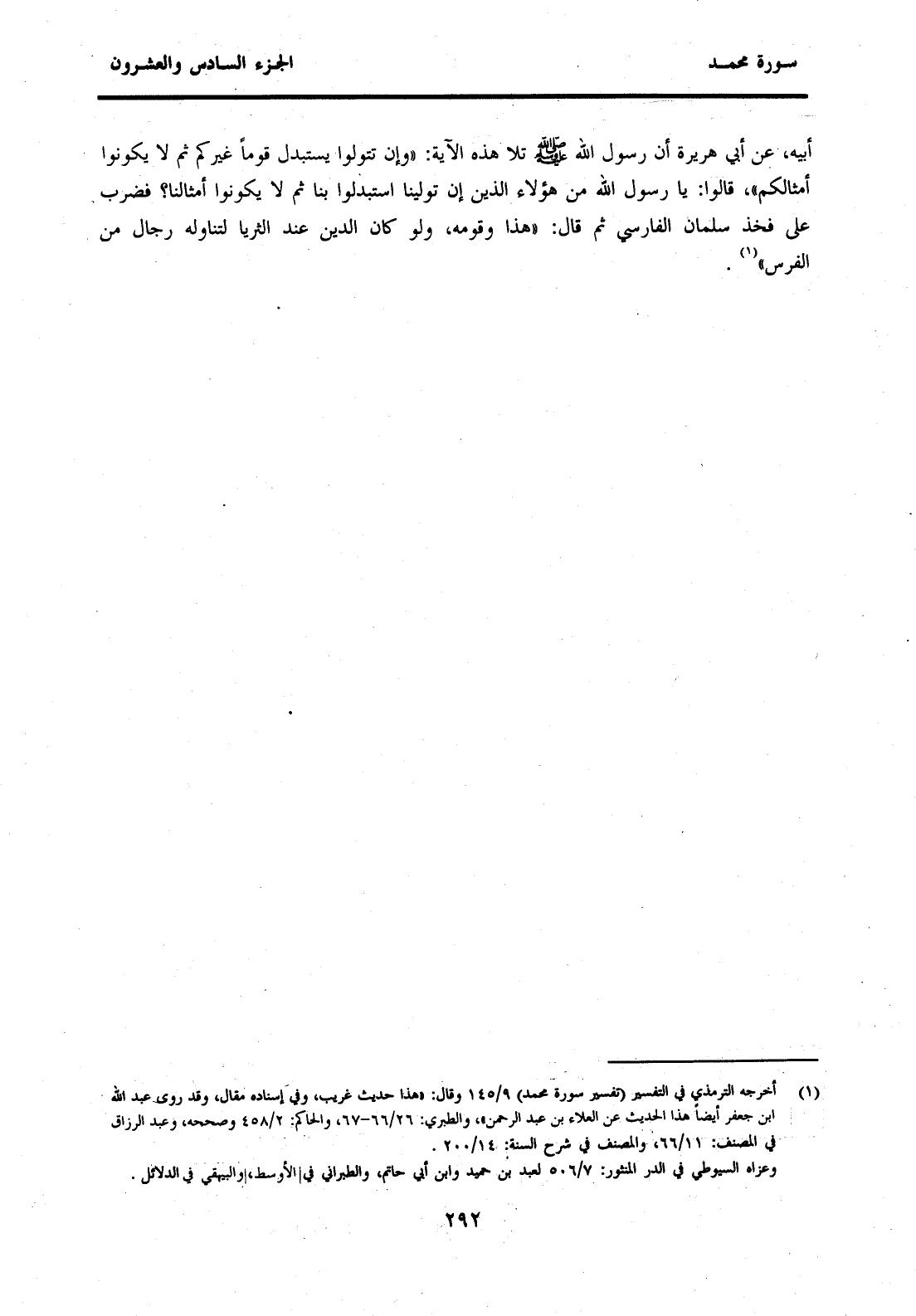 أَبِيهِ، عَنْ أَبِي هُرَيْرَةَ أَنَّ رَسُولَ اللَّهِ صَلَّى اللَّهُ عَلَيْهِ وَسَلَّمَ تَلَا هَذِهِ الْآيَةَ: "وَإِنْ تَتَوَلَّوْا يَسْتَبْدِلْ قَوْمًا غَيْرَكُمْ ثُمَّ لَا يَكُونُوا أَمْثَالَكُمْ"، قَالُوا: يَا رَسُولَ اللَّهِ مَنْ هَؤُلَاءِ الَّذِينَ إِنَّ تَوَلَّيْنَا اسْتُبْدِلُوا بِنَا ثُمَّ لَا يَكُونُوا أَمْثَالَنَا؟ فَضَرَبَ عَلَى فَخِذِ سَلْمَانَ الْفَارِسِيِّ ثُمَّ قَالَ: "هَذَا وَقَوْمُهُ، وَلَوْ كَانَ الدِّينُ عِنْدَ الثُّرَيَّا لَتَنَاوَلَهُ رِجَالٌ مِنَ الْفُرْسِ". (1)